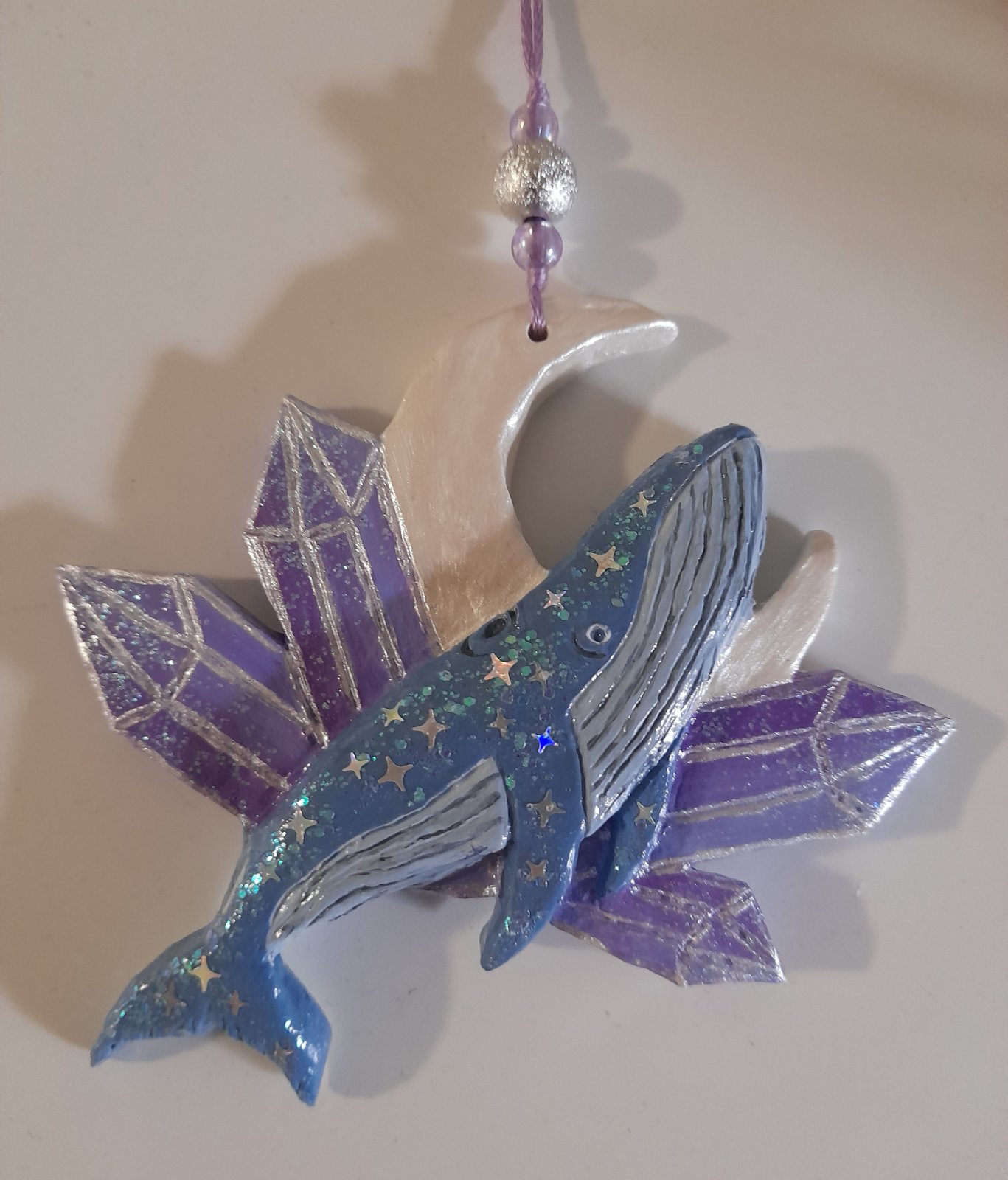 Velrybka s mesiacom a kristalmi. Vymodelovana handmade zavesna dekoracia zo samotvrdnucej hliny. Malovana akrylom a a osetrena lakom.