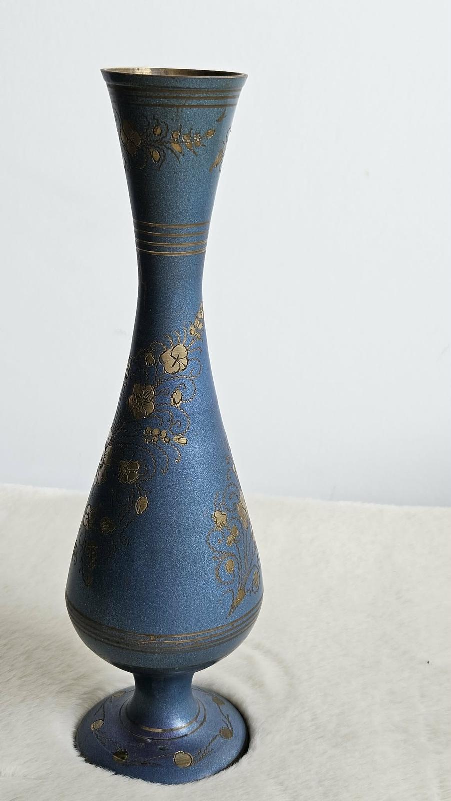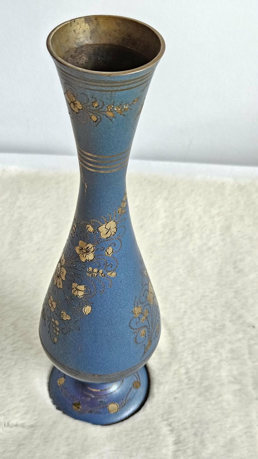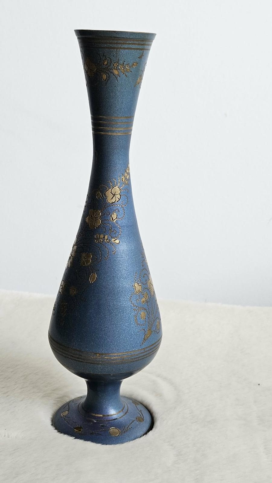 Štíhla kovová váza s modrým smaltom a ornamentmi