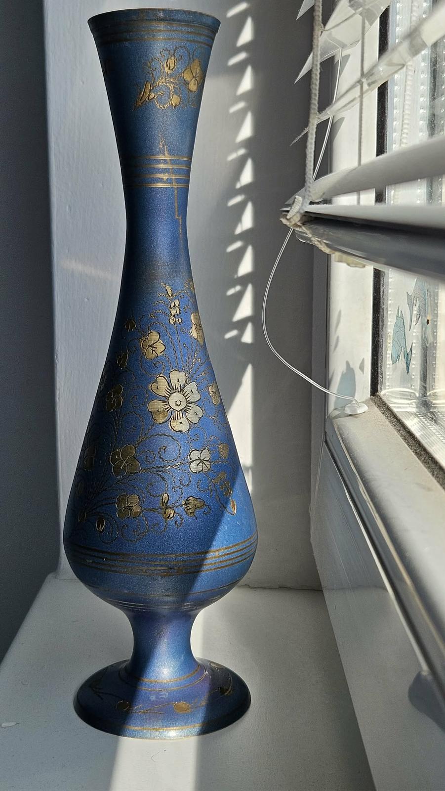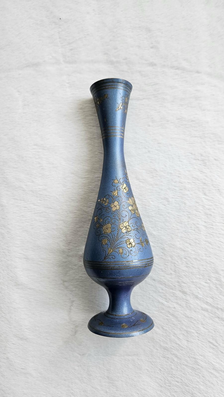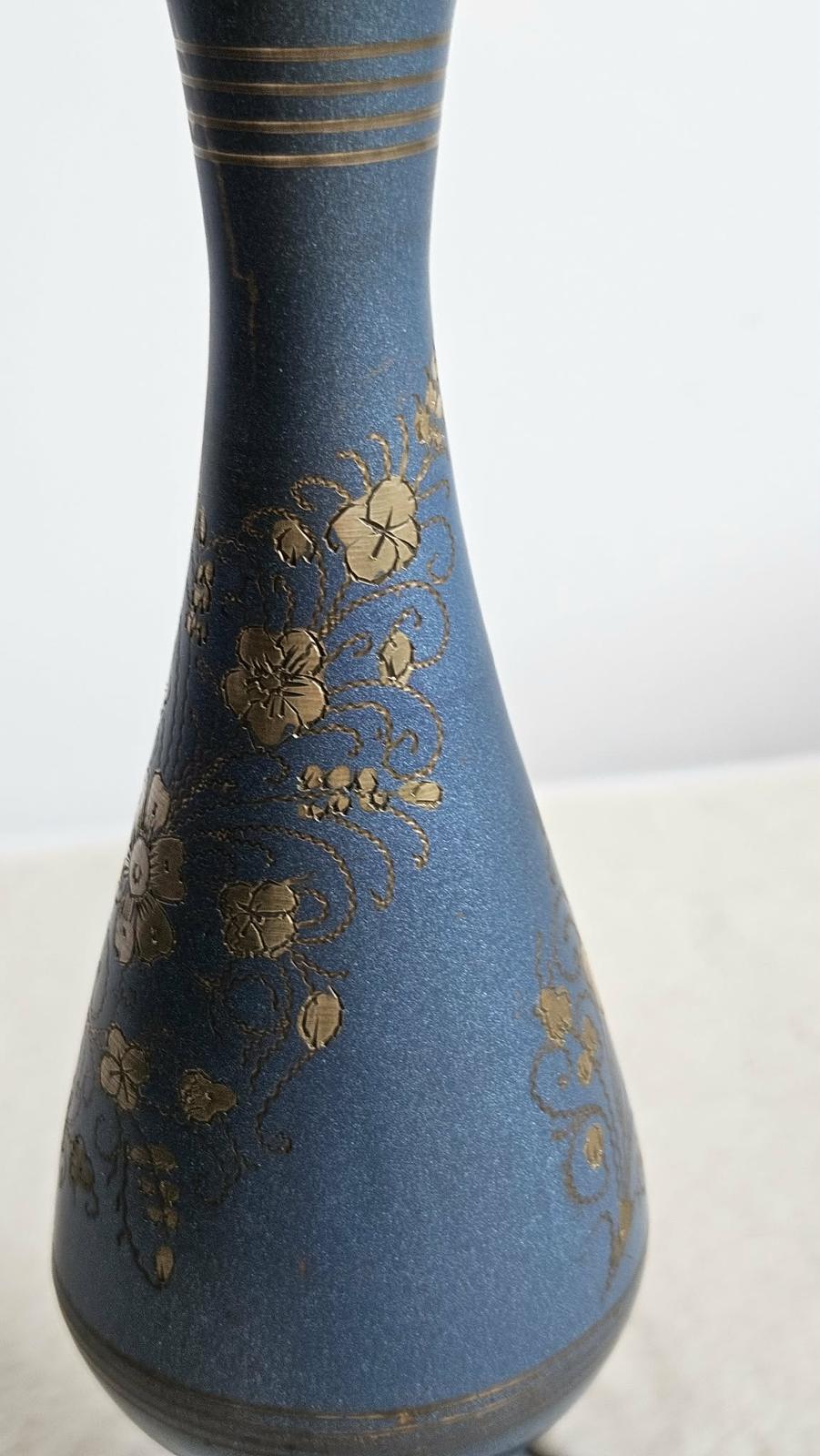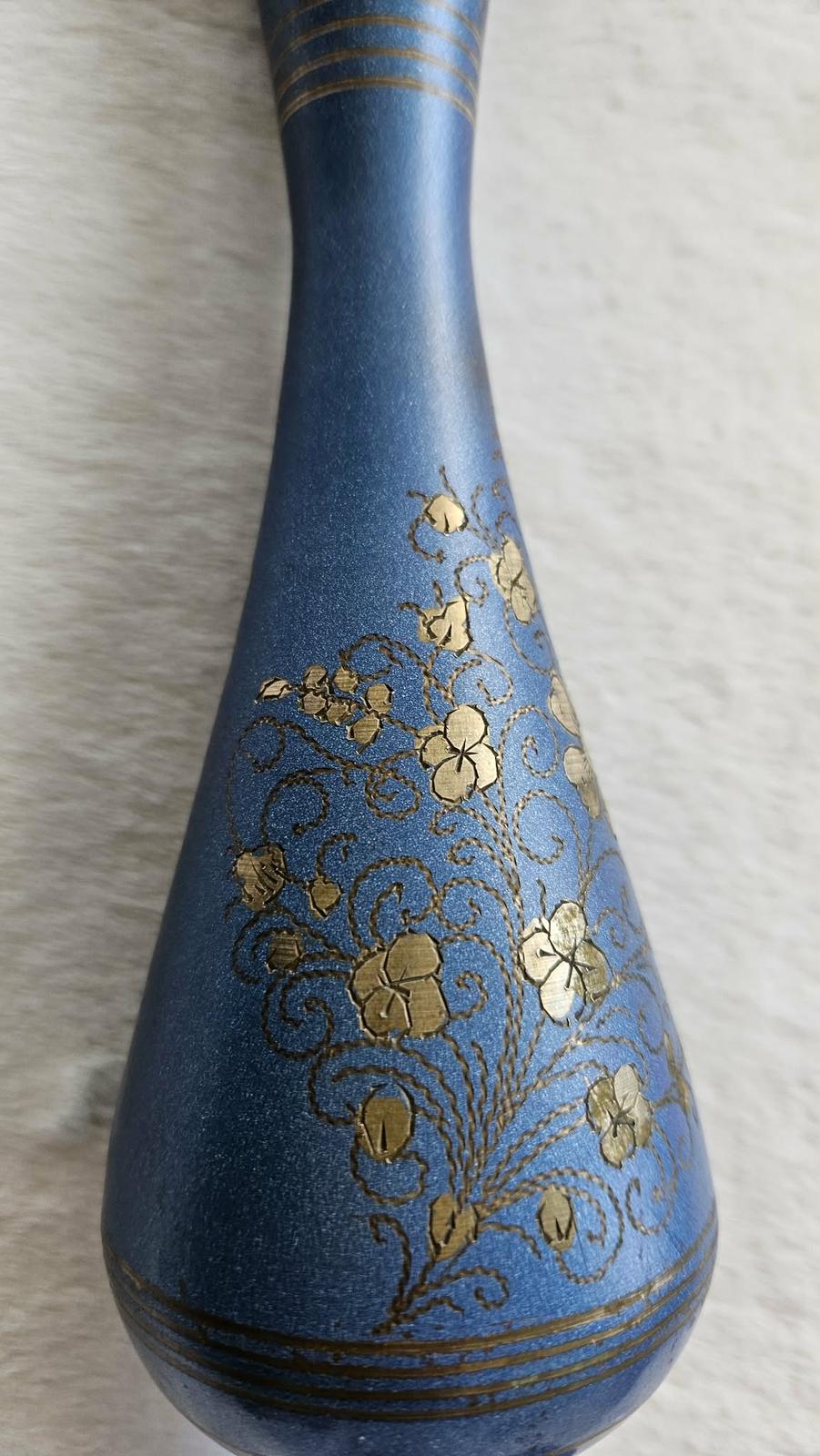 Štíhla kovová váza s modrým smaltom a ornamentmi