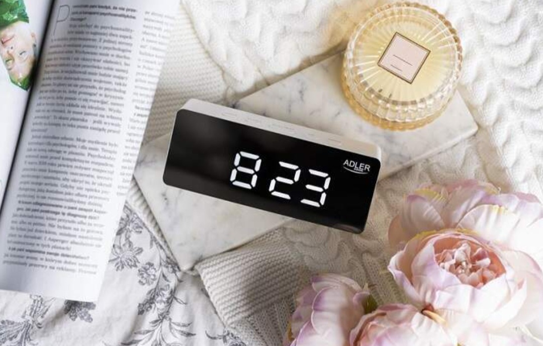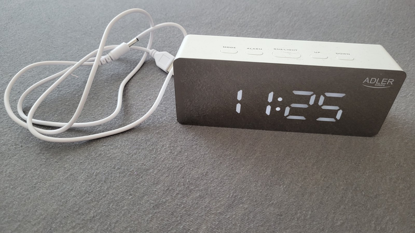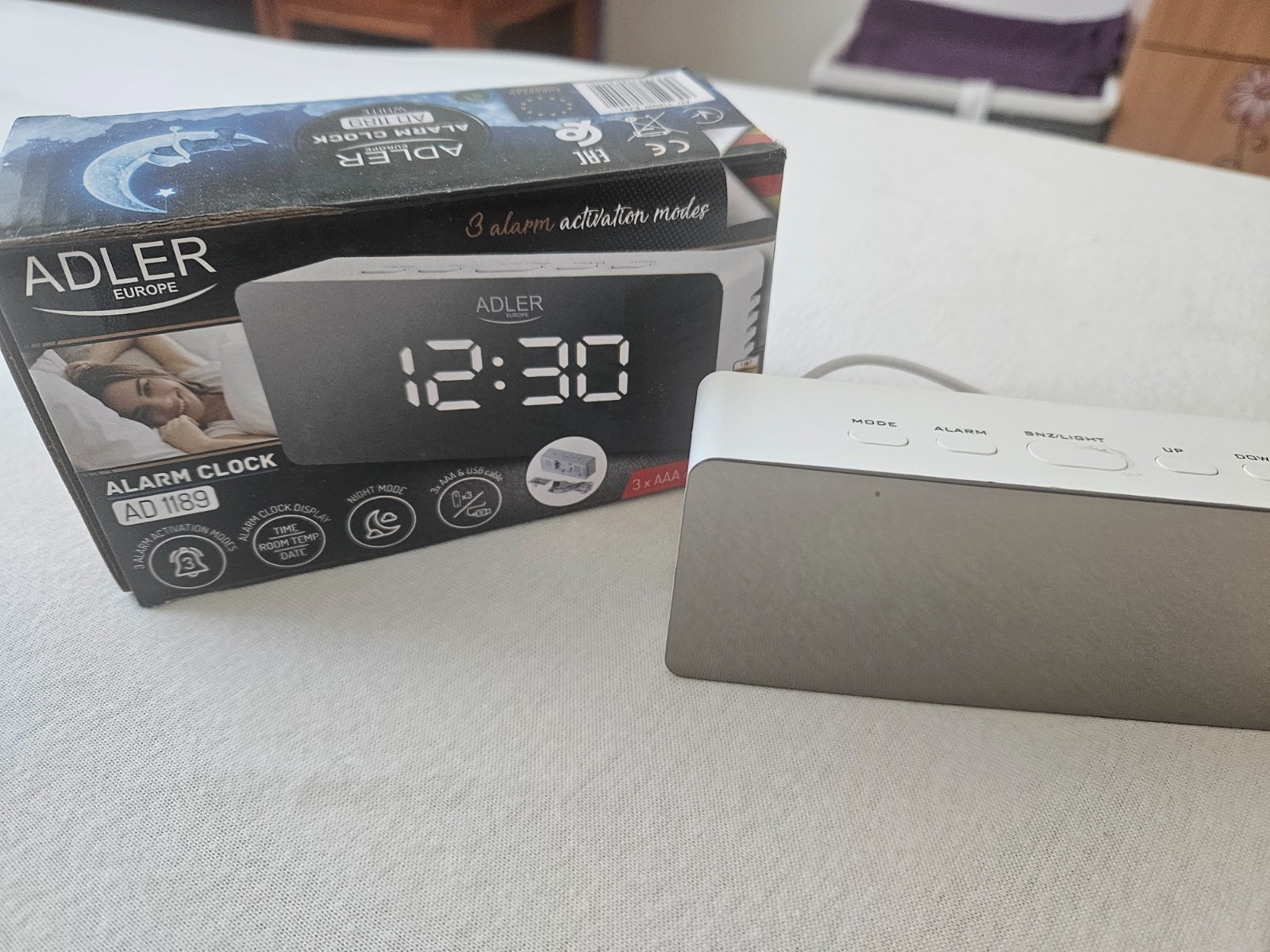 Digitálny budík Adler AD 1189 v bielej farbe s čitateľným LED displejom, 3 režimami budíka, zobrazením času, dátumu a teploty v miestnosti.