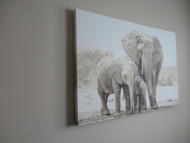 Predám OBRAZ na plátne „Slony“ – fotoobraz na plátne, plátno natiahnuté na ráme (aj z bokov), s námetom rodina slonov, hnedo-béžovej farby. Umelecká fotografia slonov je symbolom sily, rodiny a súdržnosti.