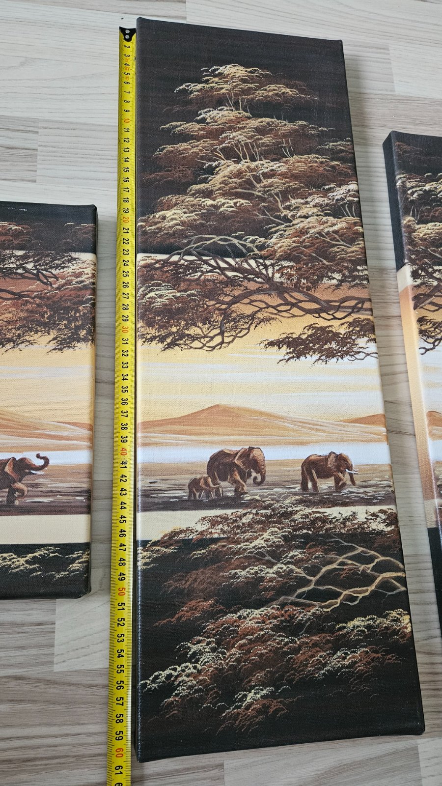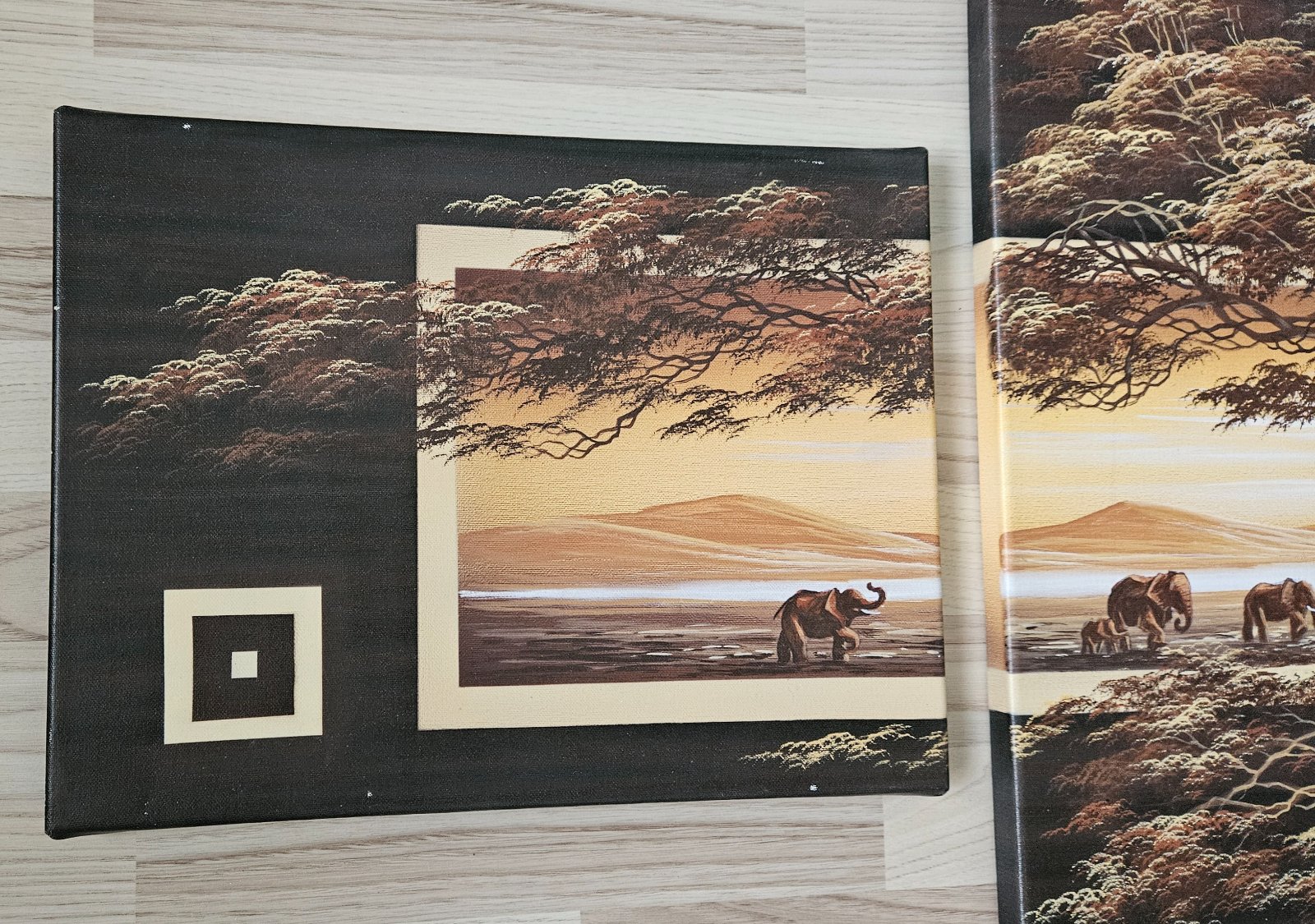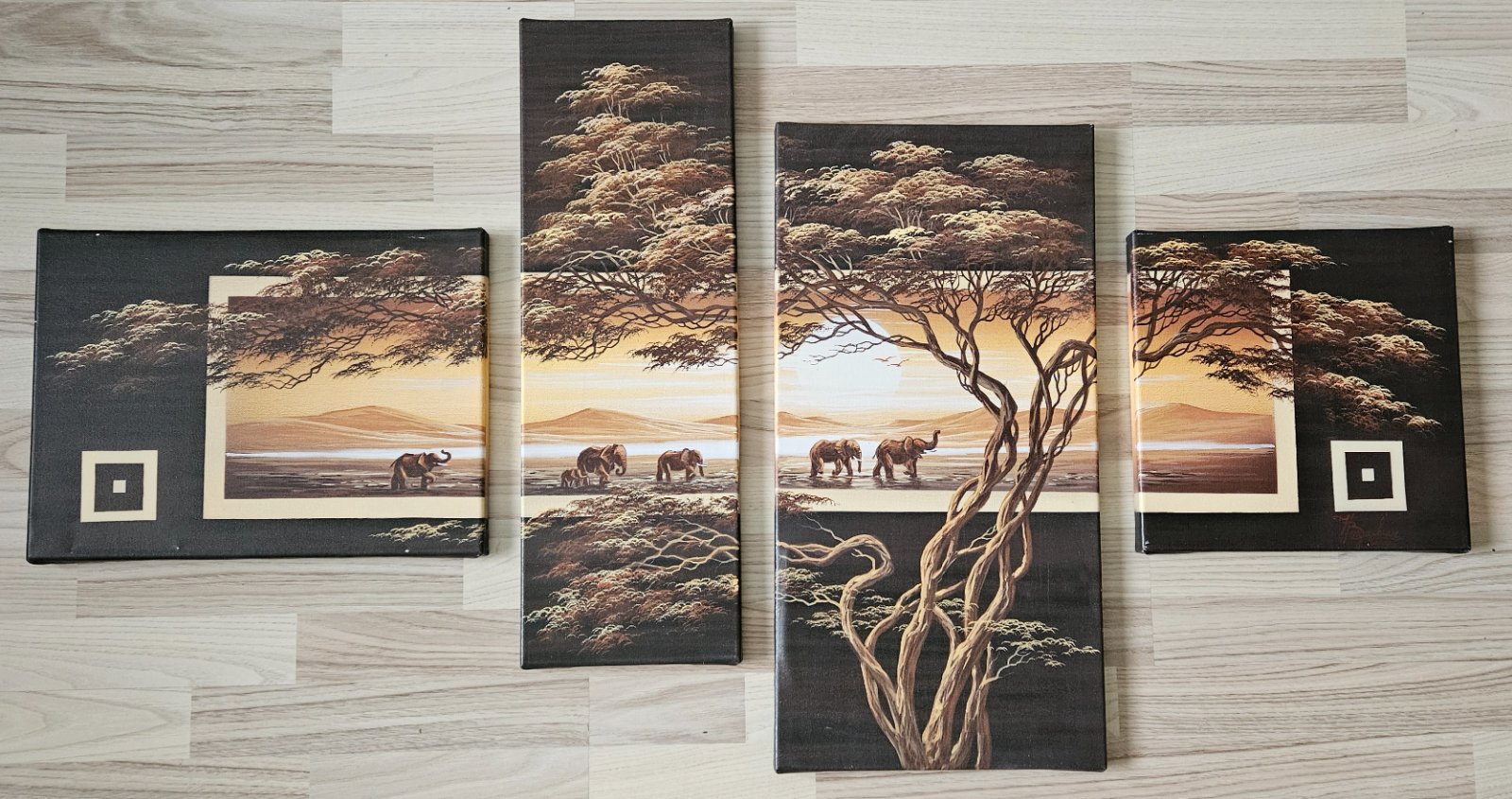 Ponúkam sadu štyroch obrazov s motívom africkej savany a slonov.