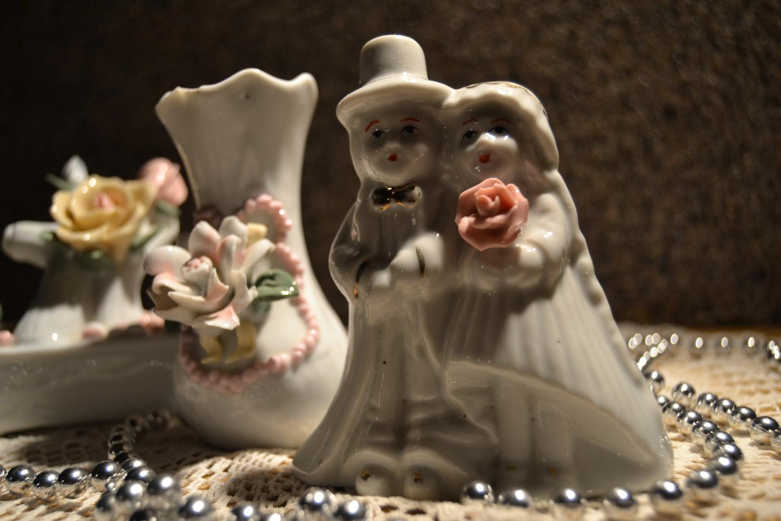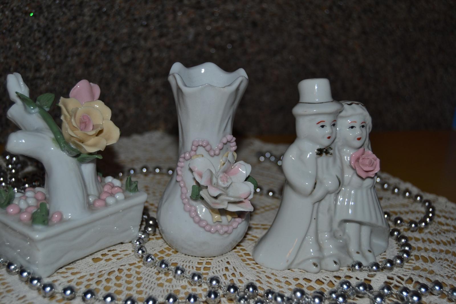 Keramické sošky 2ks - kytička a mladomanželia + vázička s kvetinkou. rozmery výška 10 cm. Cena za všetky 5€.
