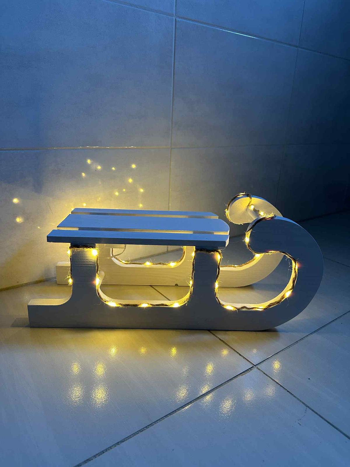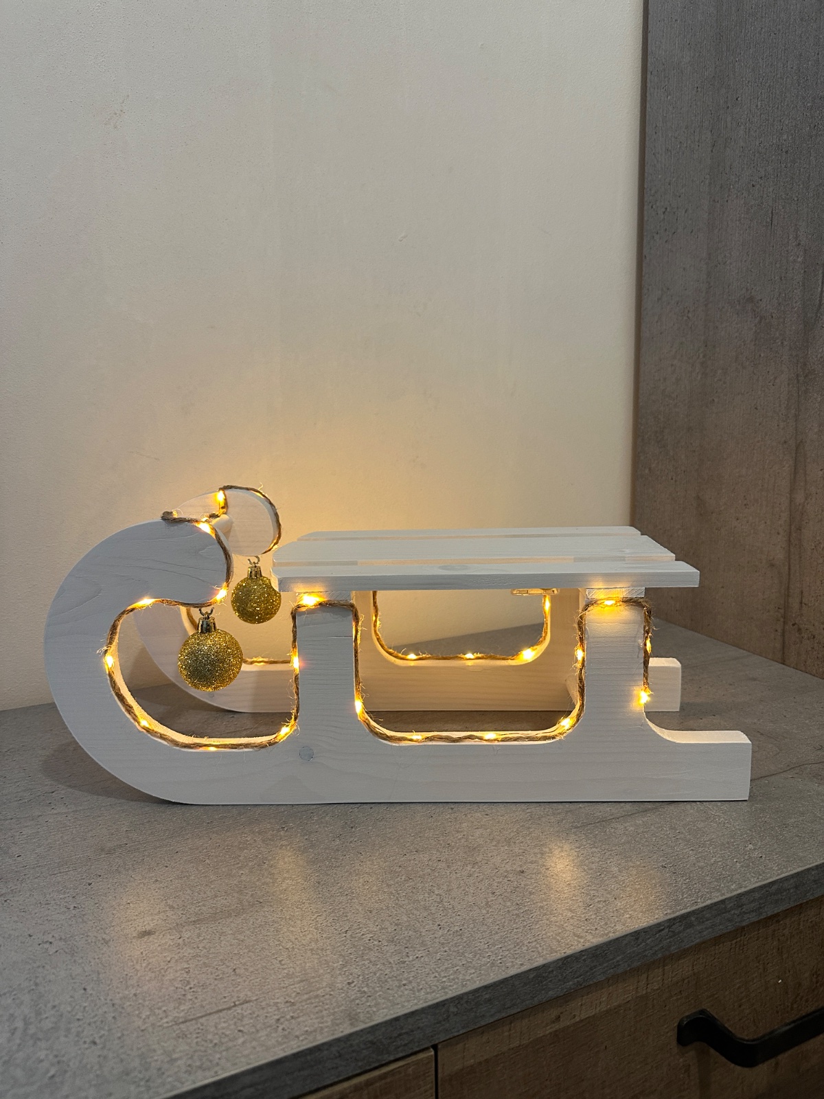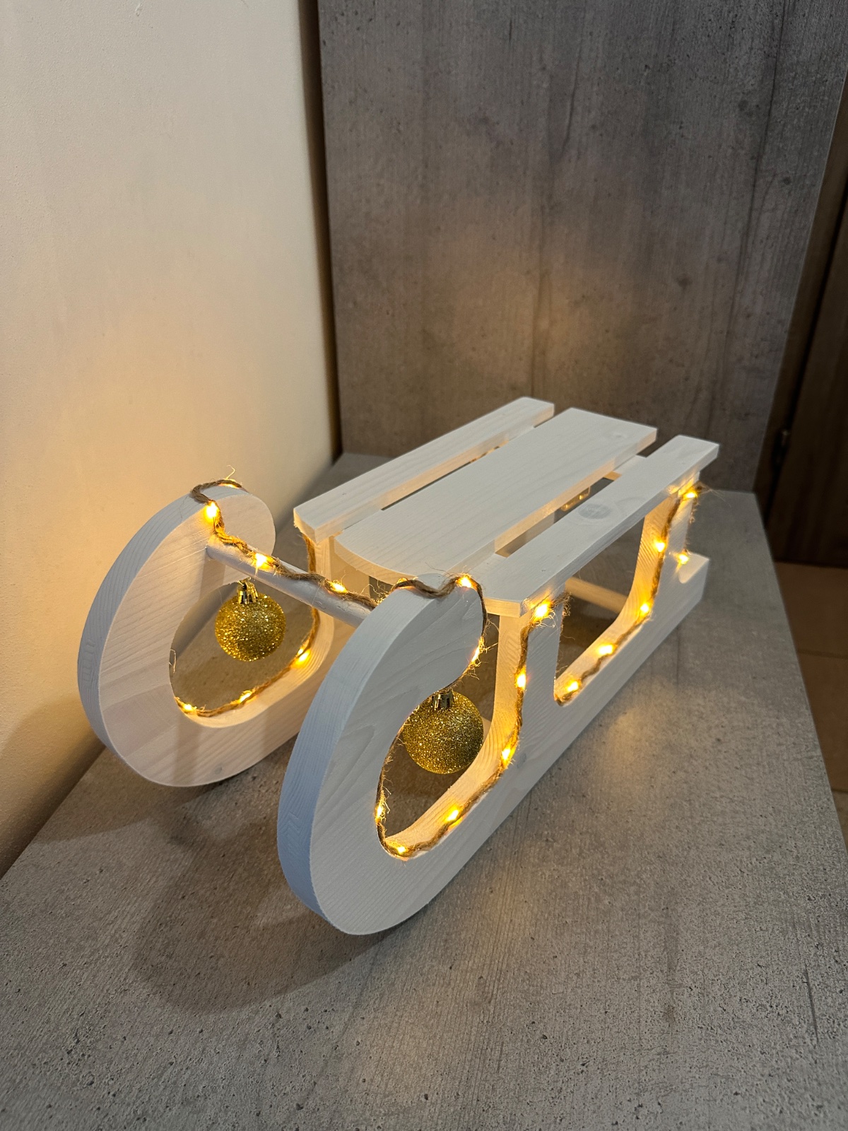 Drevené sánky vianočné s osvetlením. Sú dve varianty viď. na fotkách, buď s vianočnými guličkami alebo bez.