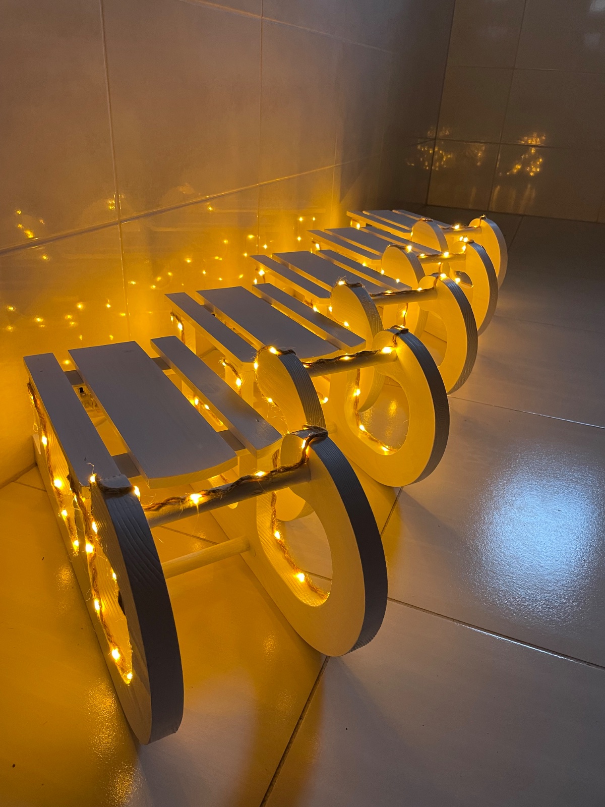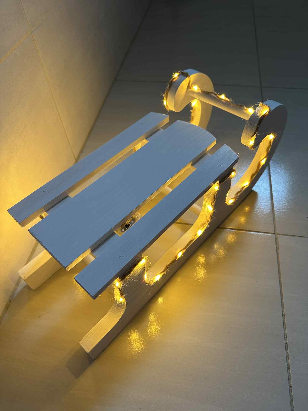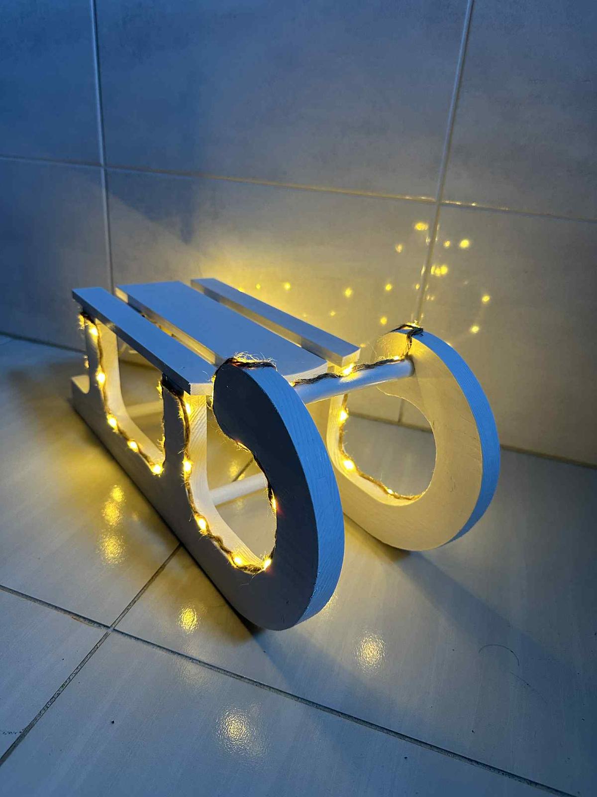 Drevené sánky vianočné s osvetlením. Sú dve varianty viď. na fotkách, buď s vianočnými guličkami alebo bez.
