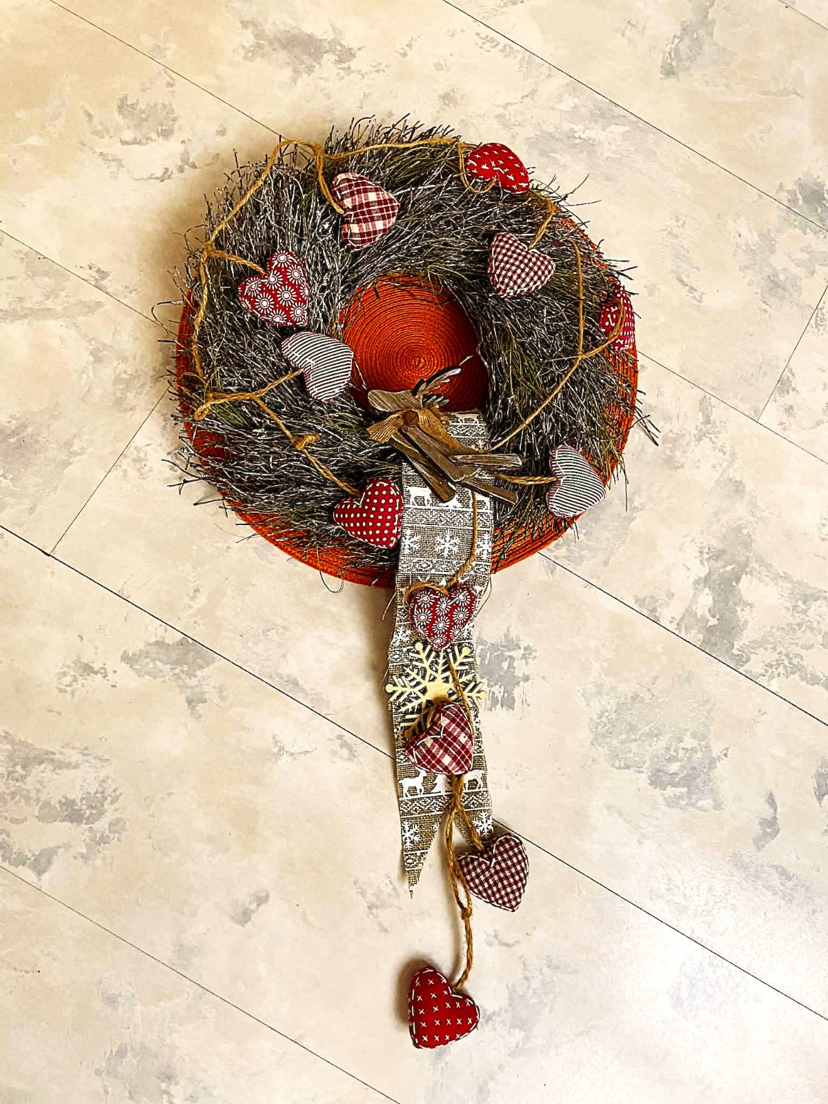 nádherný luxusný naturálny vianočný veniec na zavesenie,s ľanovou stuhou a drevenými prvkami - textilné srdiečka,veľmi nevšedný a neokukaný,nevyčačkaný,ale naturálny,top dekorácia,vonkajší priemer = 36 cm