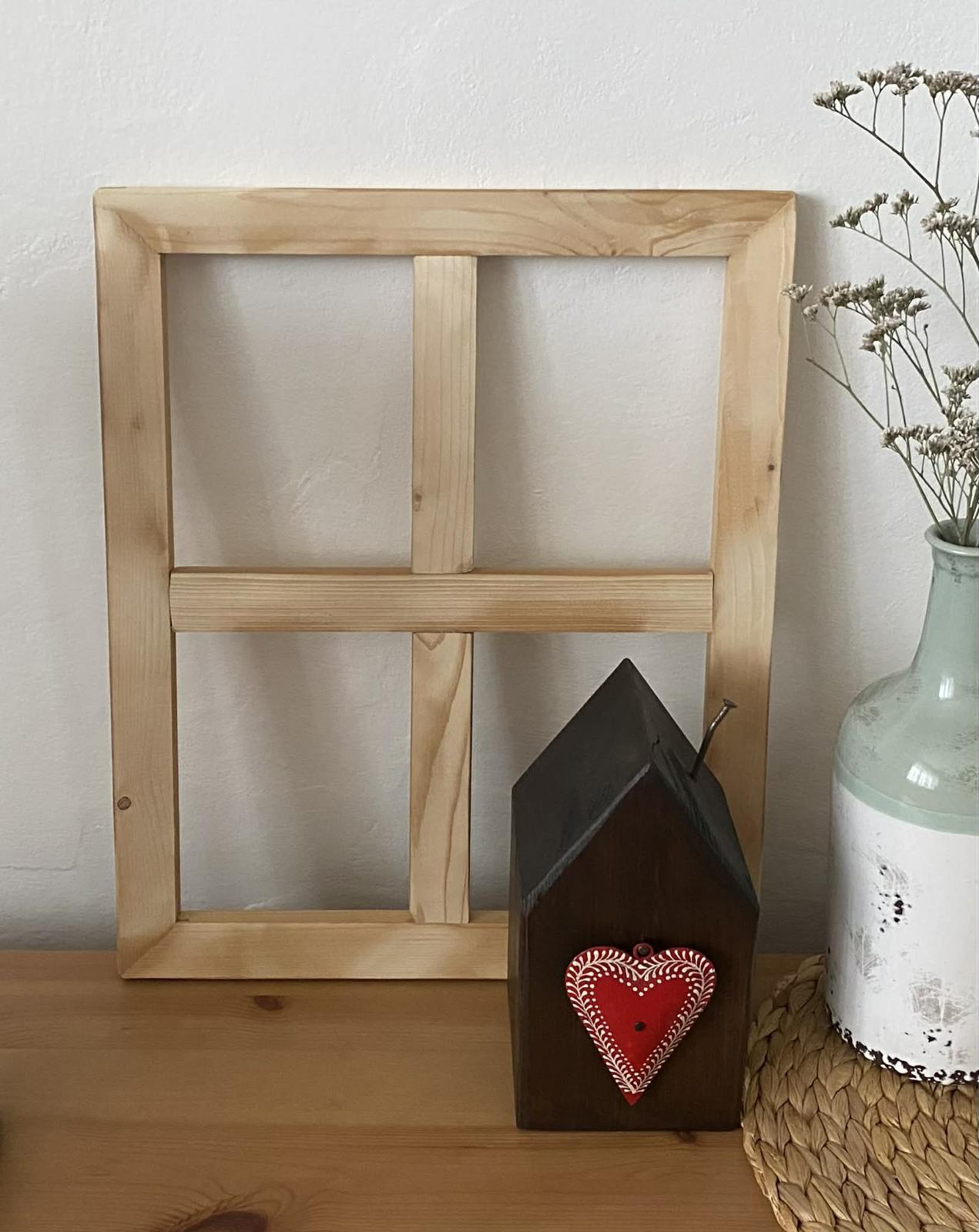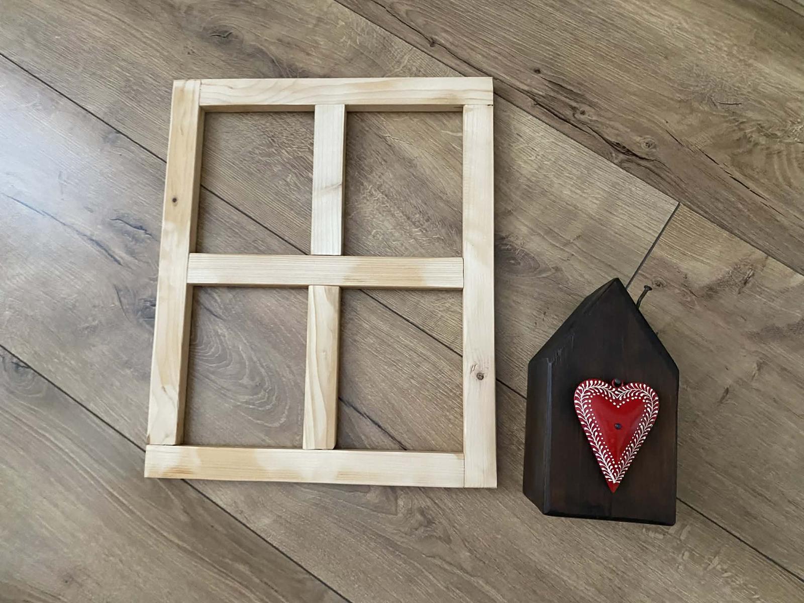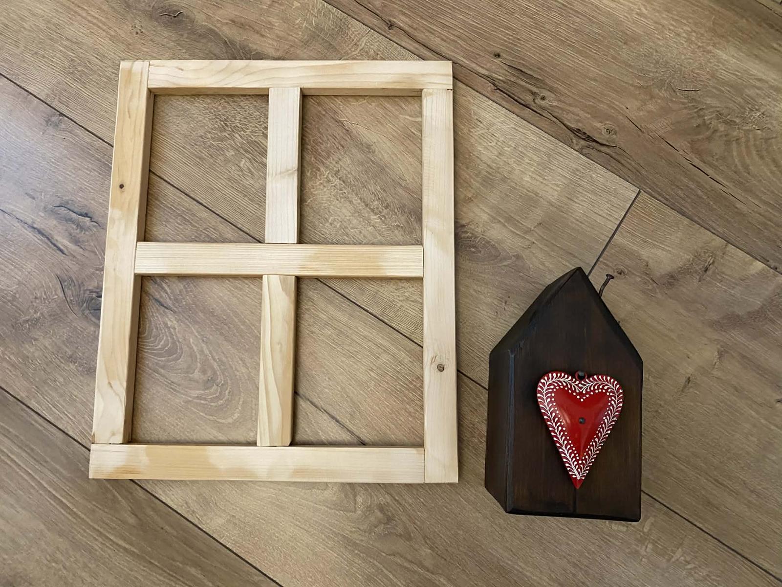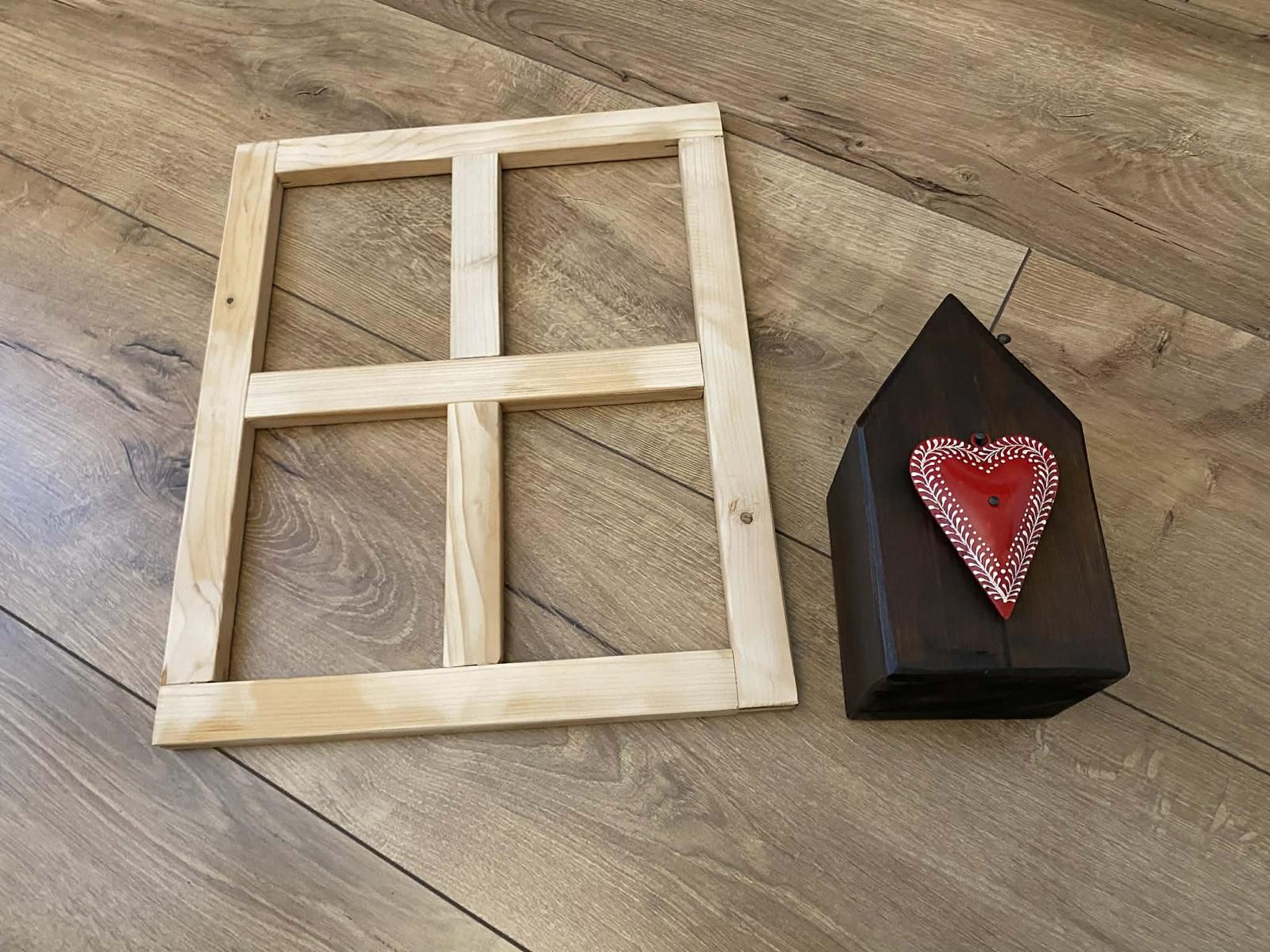 Predám drevené dekoračné okienko a drevený domček so starým kovovým srdiečkom.