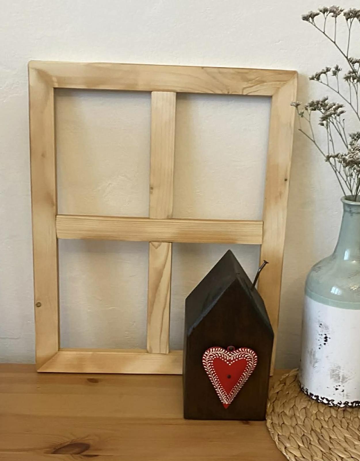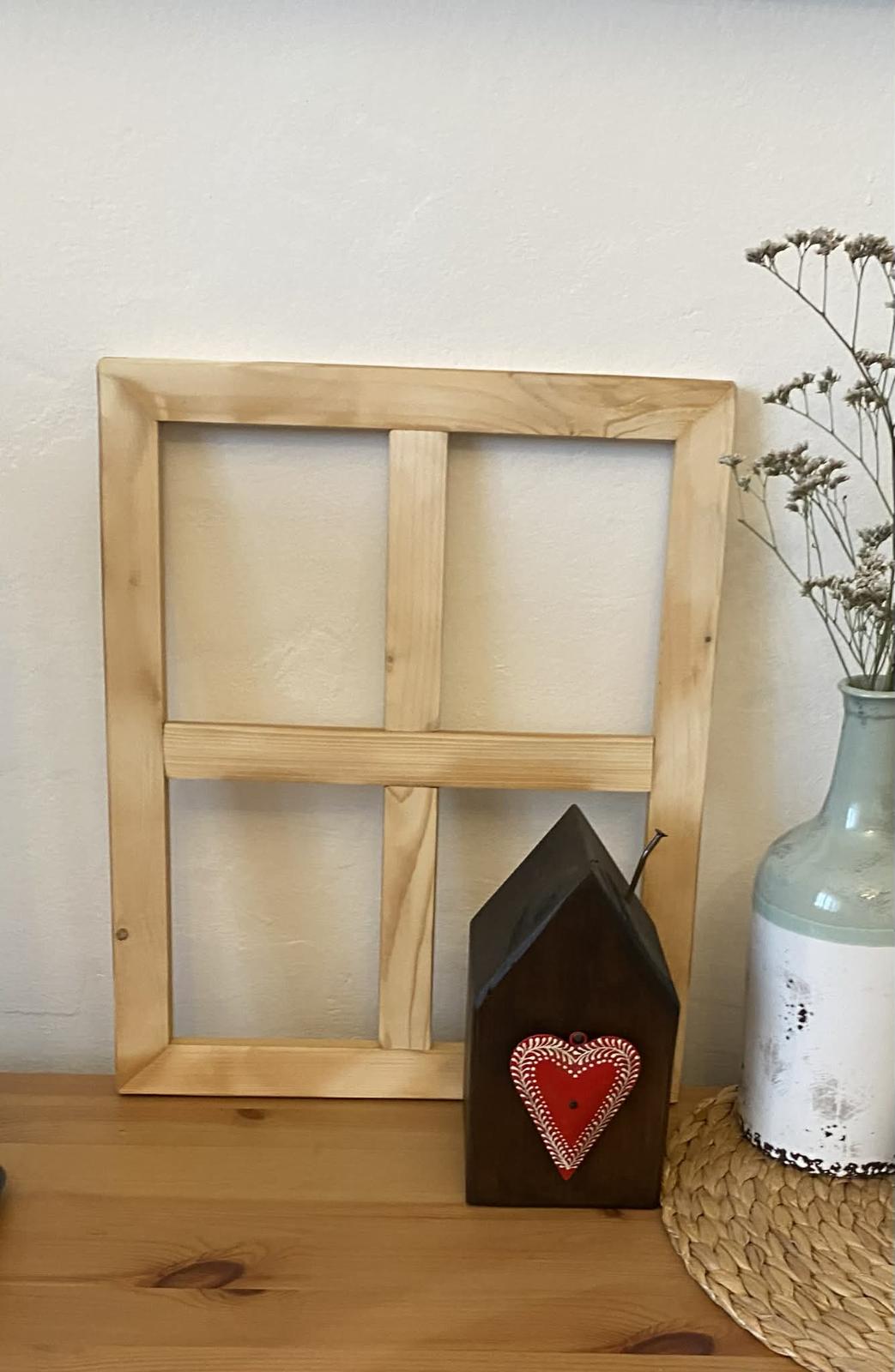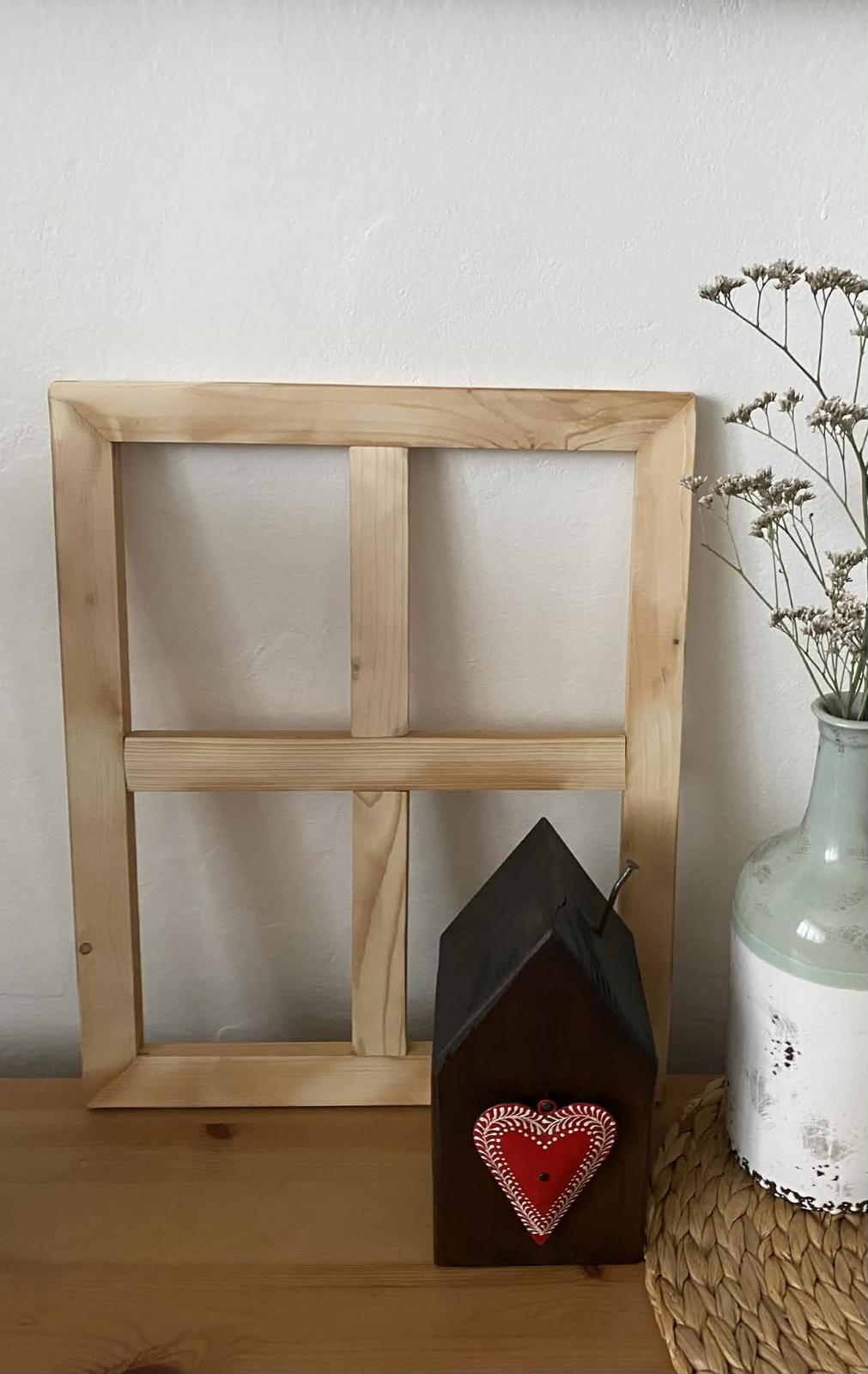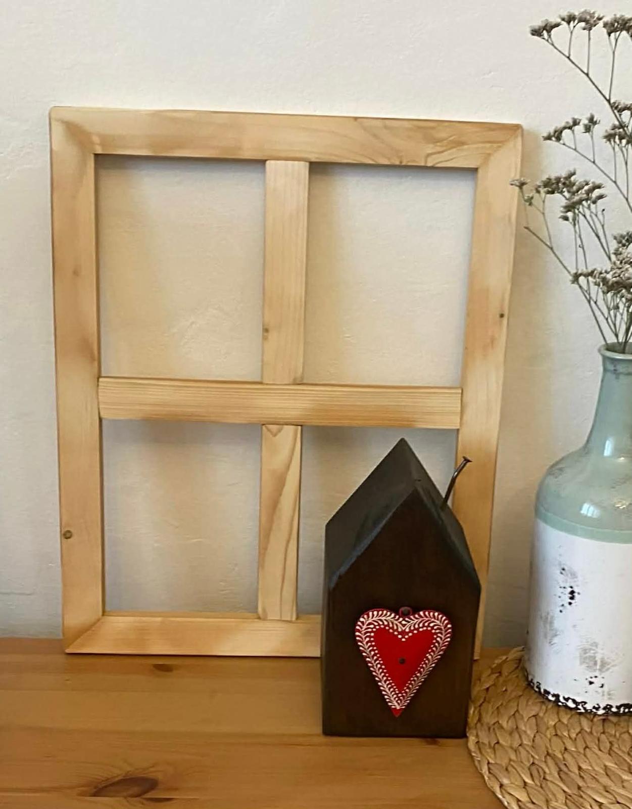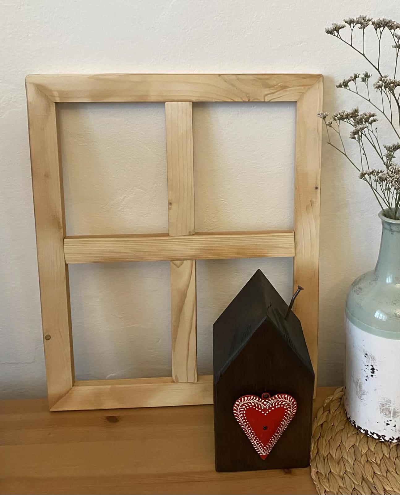 Predám drevené dekoračné okienko a drevený domček so starým kovovým srdiečkom.