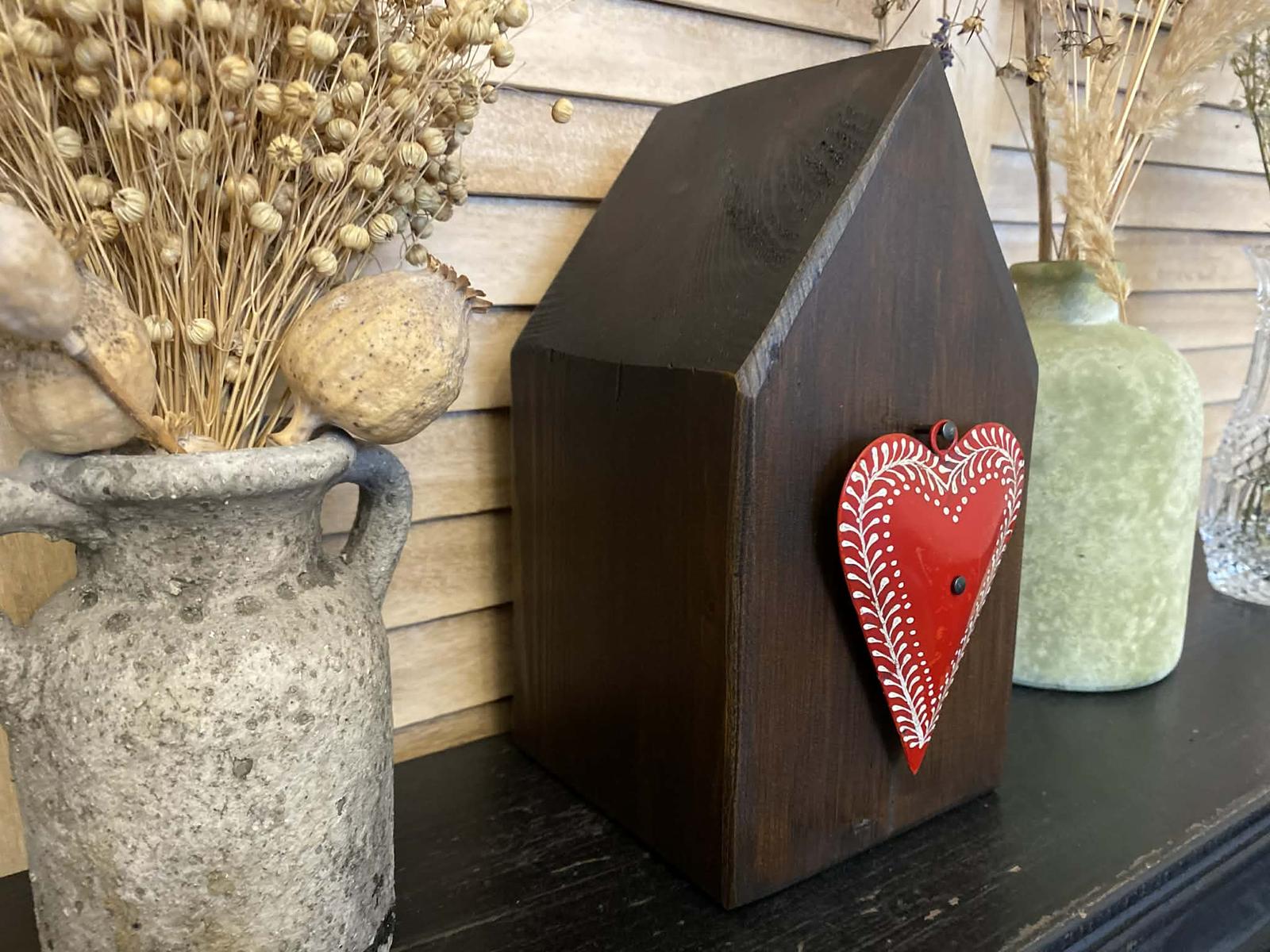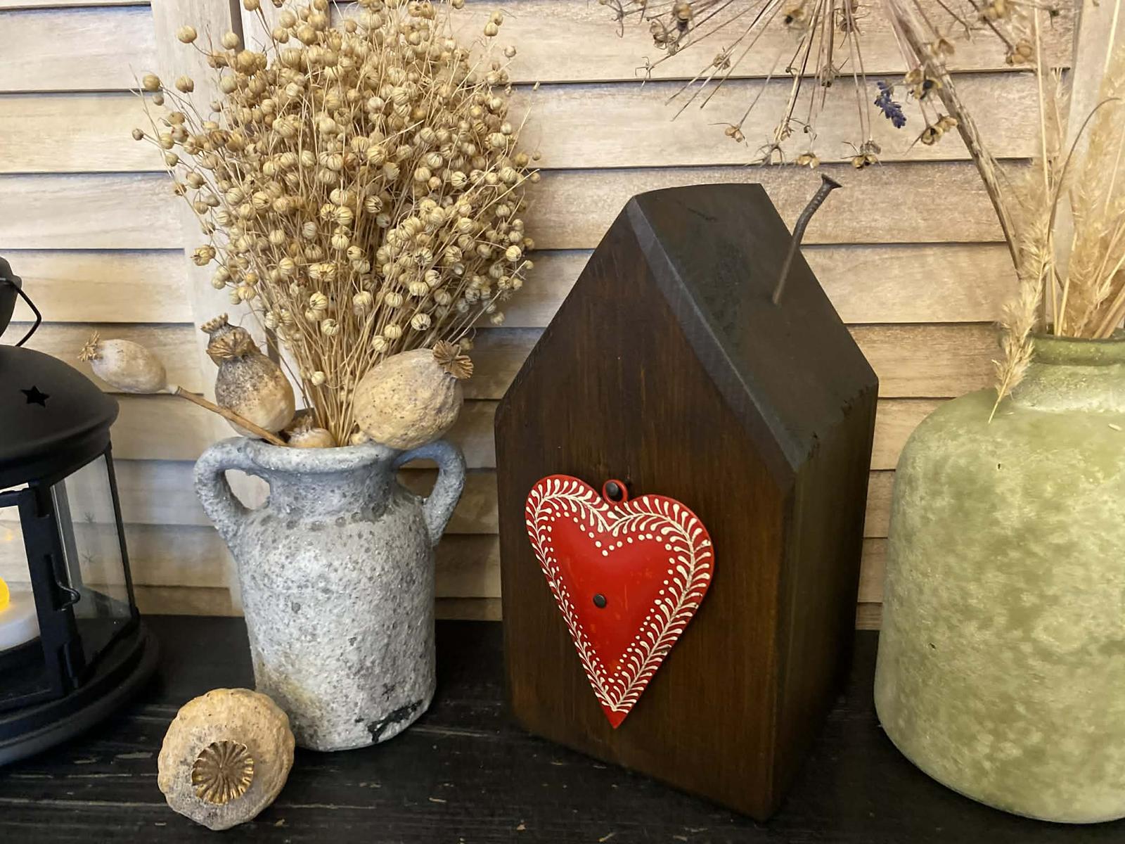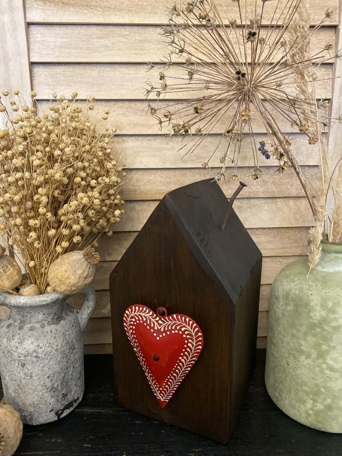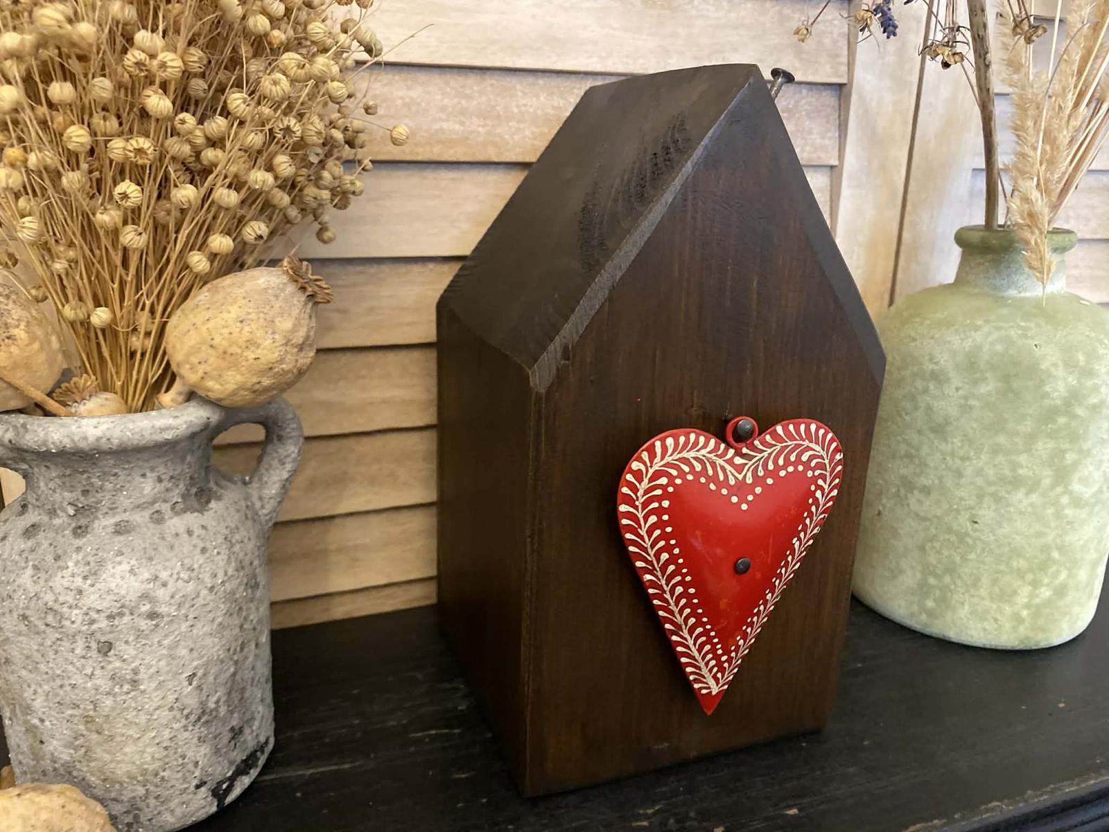 Predám drevený dekoračný domček so starým kovovým srdiečkom. Domček je vyrobený zo starého dreva a následne je povrchovo upravený