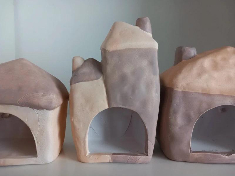 Sada 3ks keramických domčekov na čajovú sviečku, jemné pastelové farby: bledohnedá/béžová/krémová, matná povrchová úprava.
