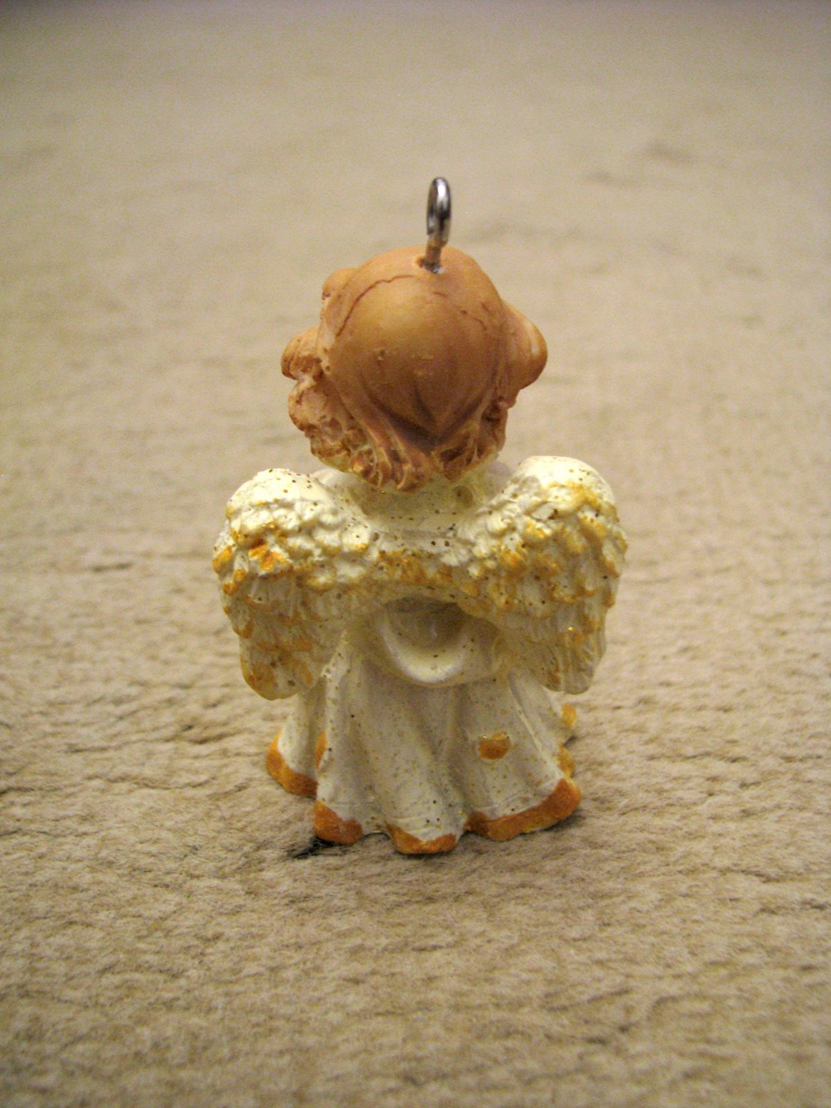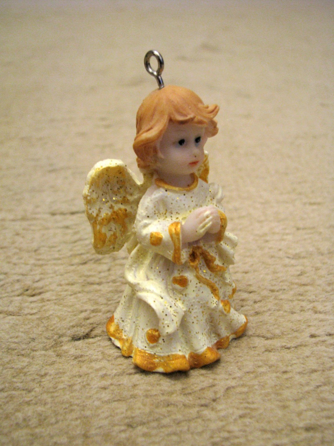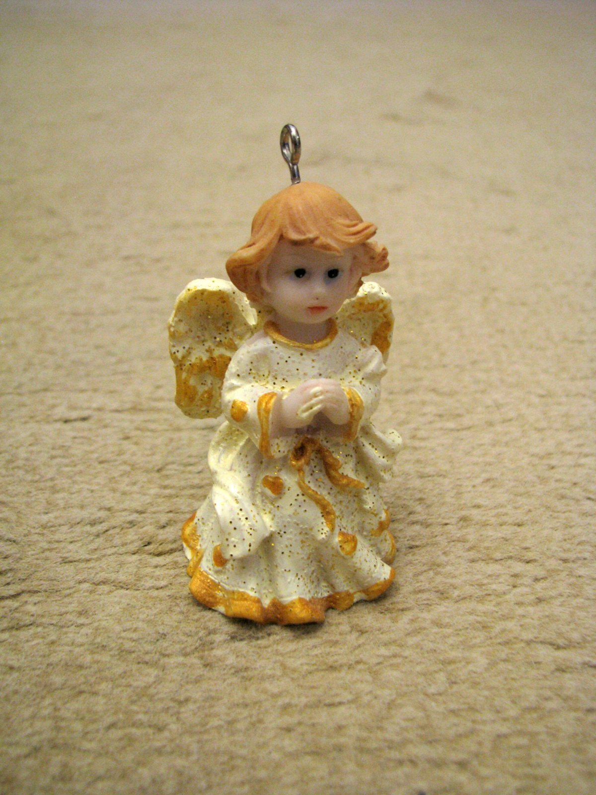 Malá dekoračná soška anjelik v žlto-zlatých tónoch, s očkom na zavesenie - môže byť ako vianočná ozdoba či prívesok. Výborne zachovalá, bez poškodení.