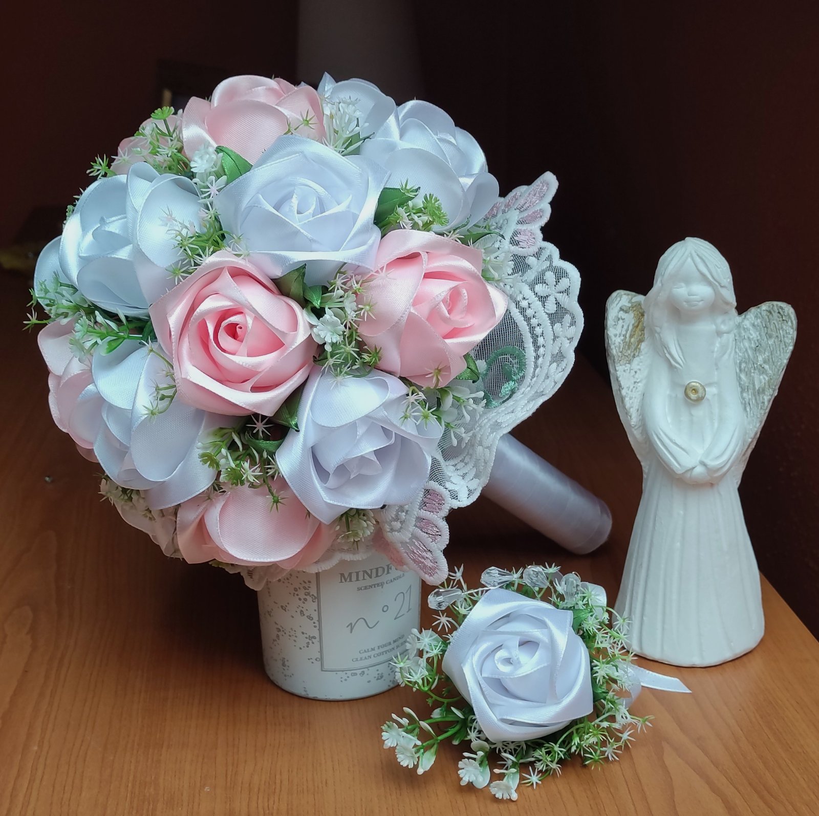 Táto jedinečná kytica z ruží, ručne vyrobených zo saténovej stuhy, očarí svojou trvácnosťou a eleganciou pri každej príležitosti.
