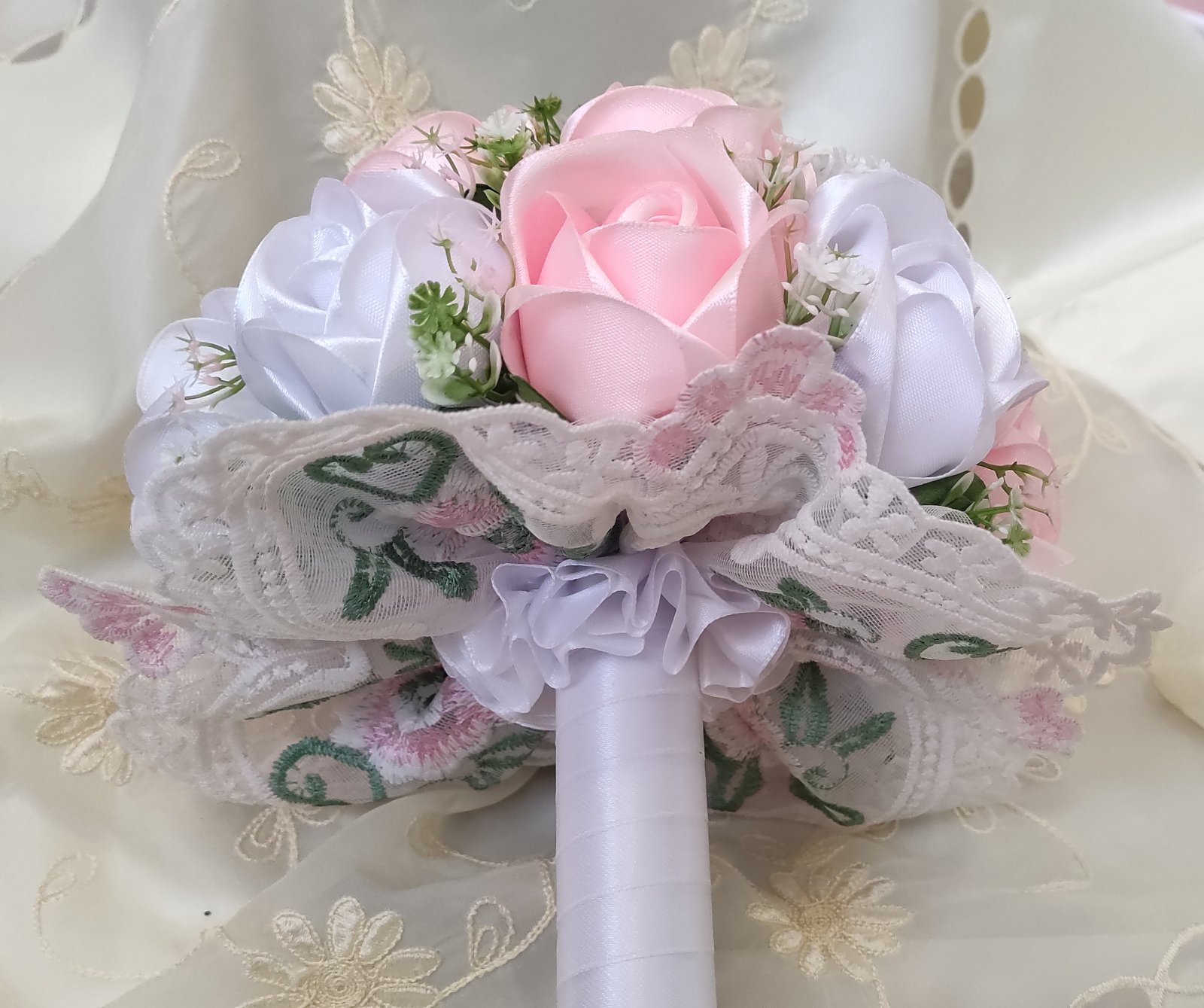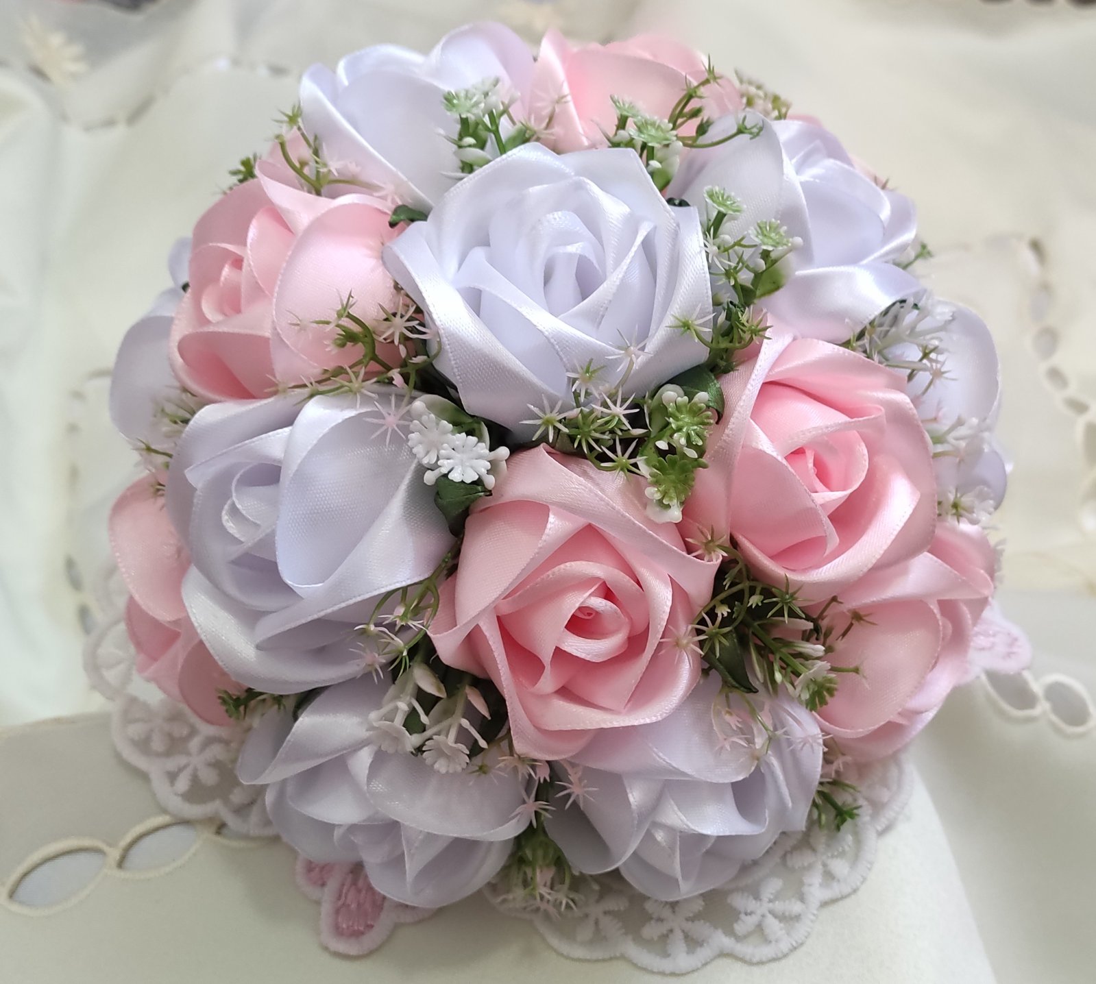Saténové ruže, doplnené jemnou strojovou čipkou, sú nádherným a originálnym darčekom na oslavu významných životných okamihov, ako sú narodeniny či promócie, no zároveň sa skvelo hodia aj ako svadobná kytica pre nevestu, ktorá hľadá niečo nezvyčajné a trvalé.