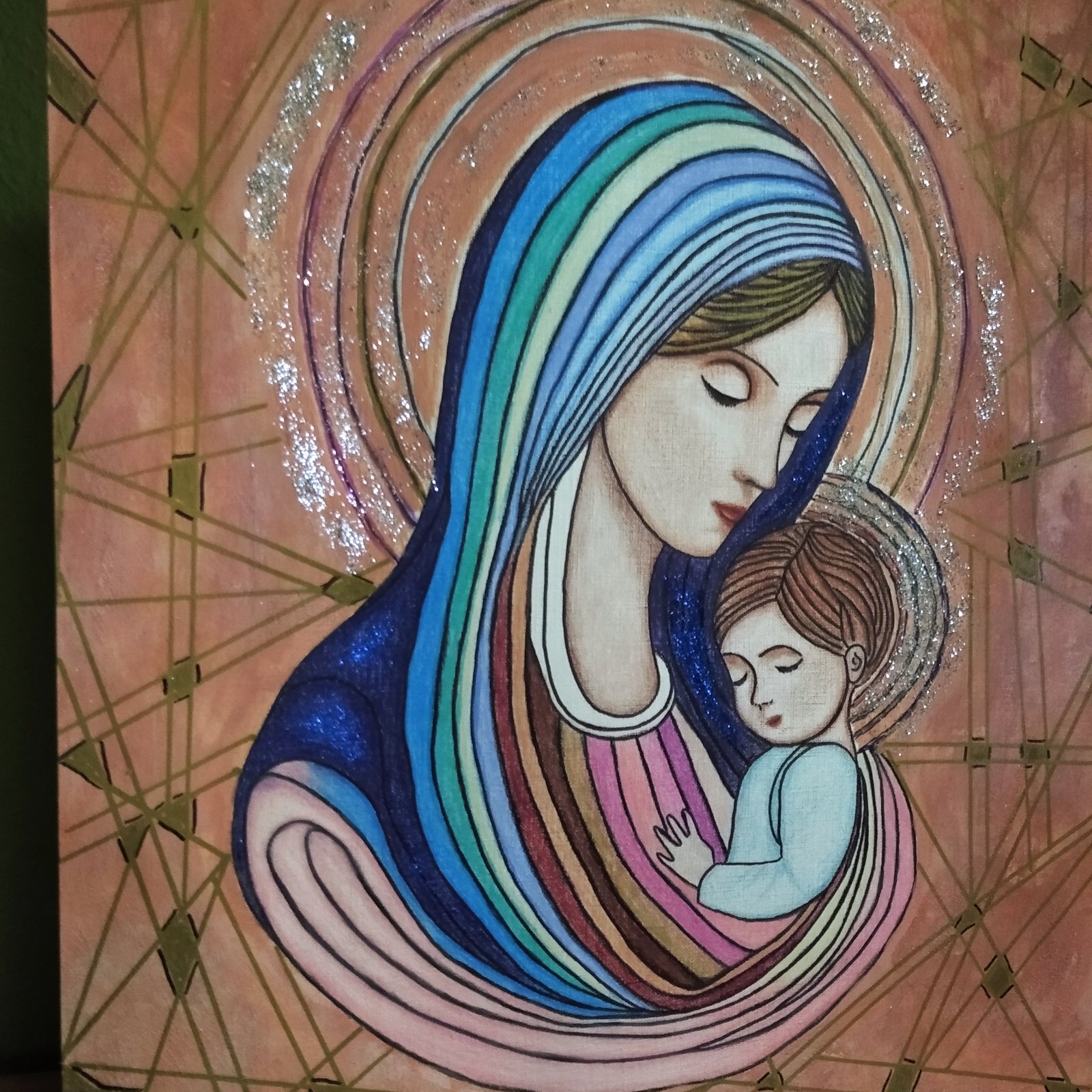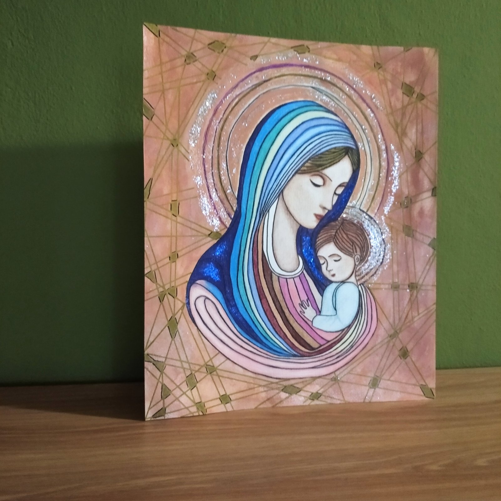 Predám tento krásny obraz Panny Márie a malého Ježiška. Je mnou maľovaný s láskou. Obraz je namaľovaný kombinovanou technikou. Farebnými ceruzkami a temperovými farbami, na záver upravený lakom. Obraz je na kvalitnom papieri 290g / m2 v rozmere 38 cm x 46 cm.
