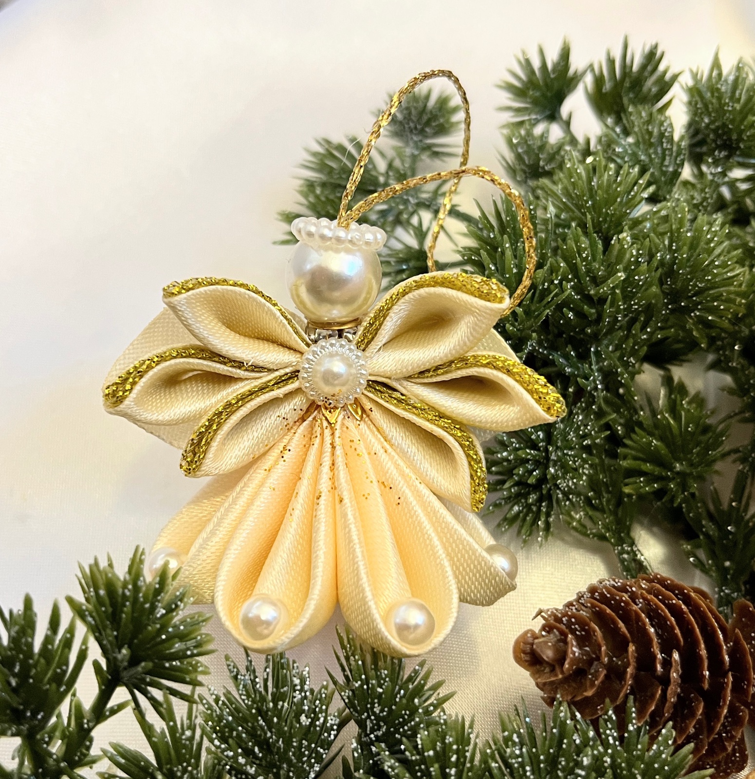 Tento ručne vyrobený anjel z jemnej saténovej a lesklej organzovej stuhy dodá vašej vianočnej výzdobe nebeský pôvab.