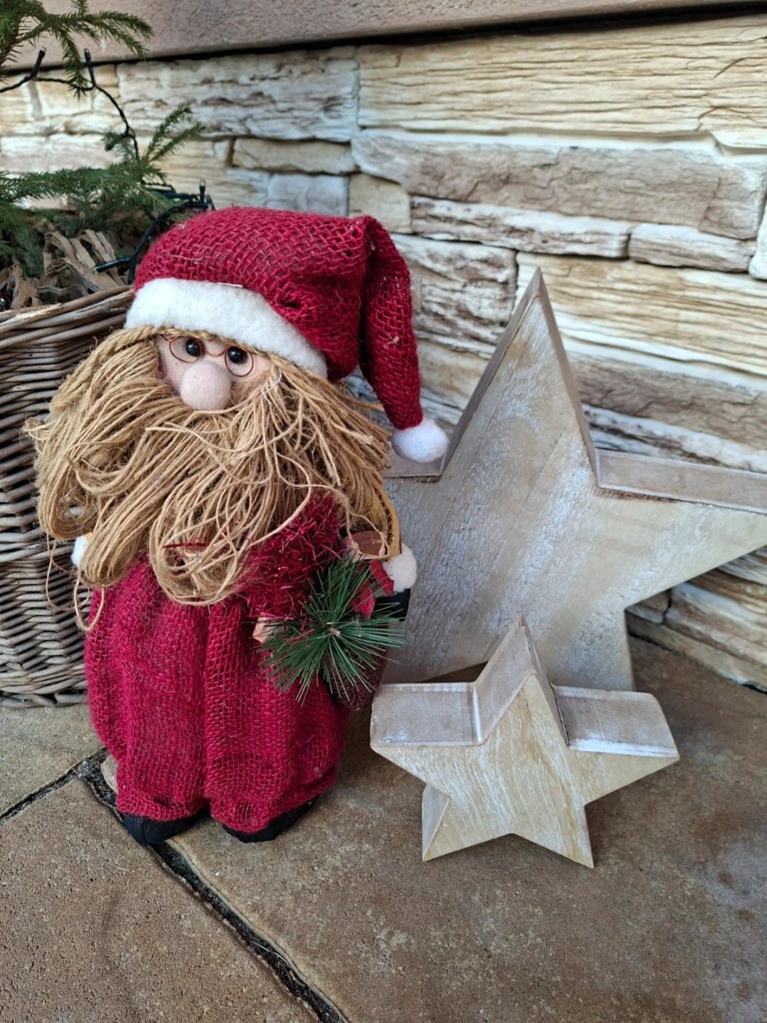Velky stojací mikuláš- dedo v jutovom oblecení, s jytovou bradou a okuliarmi, veeelmi krásny zo zahranicia vyborny stav 🎅🎅🎅❤️❤️❤️❤️