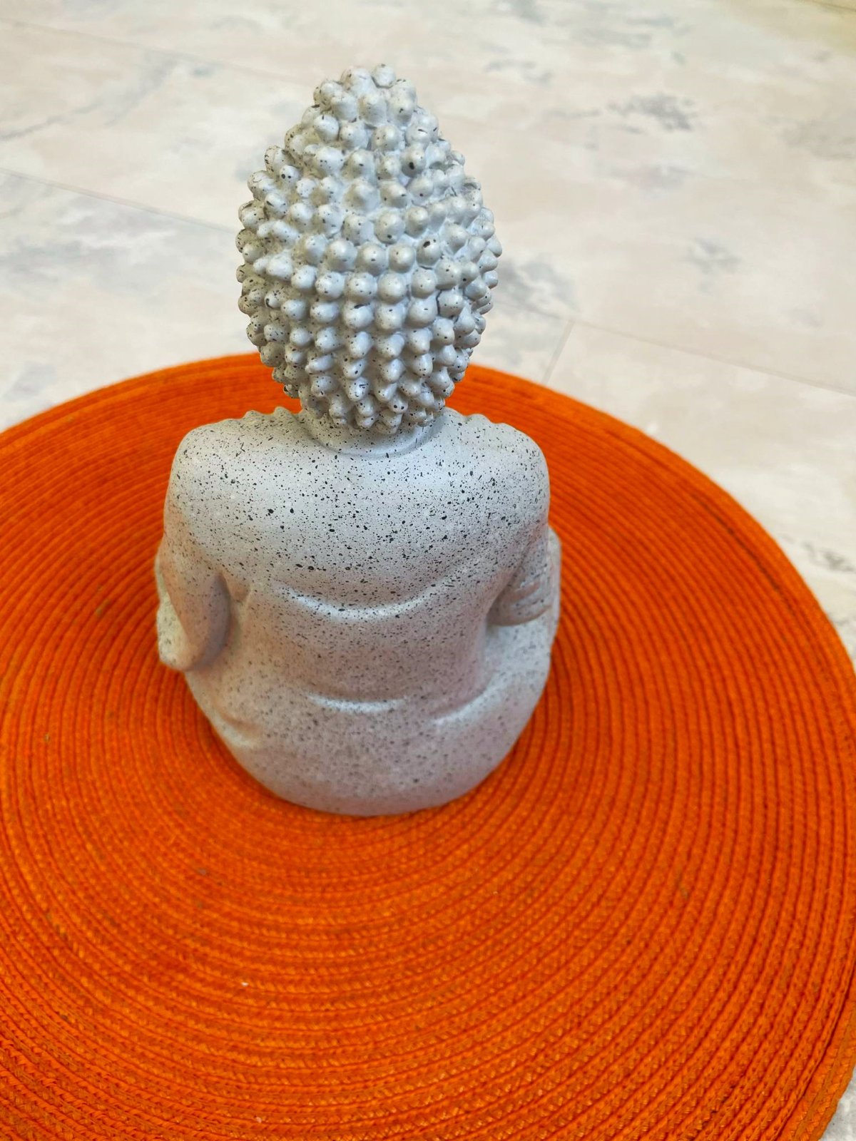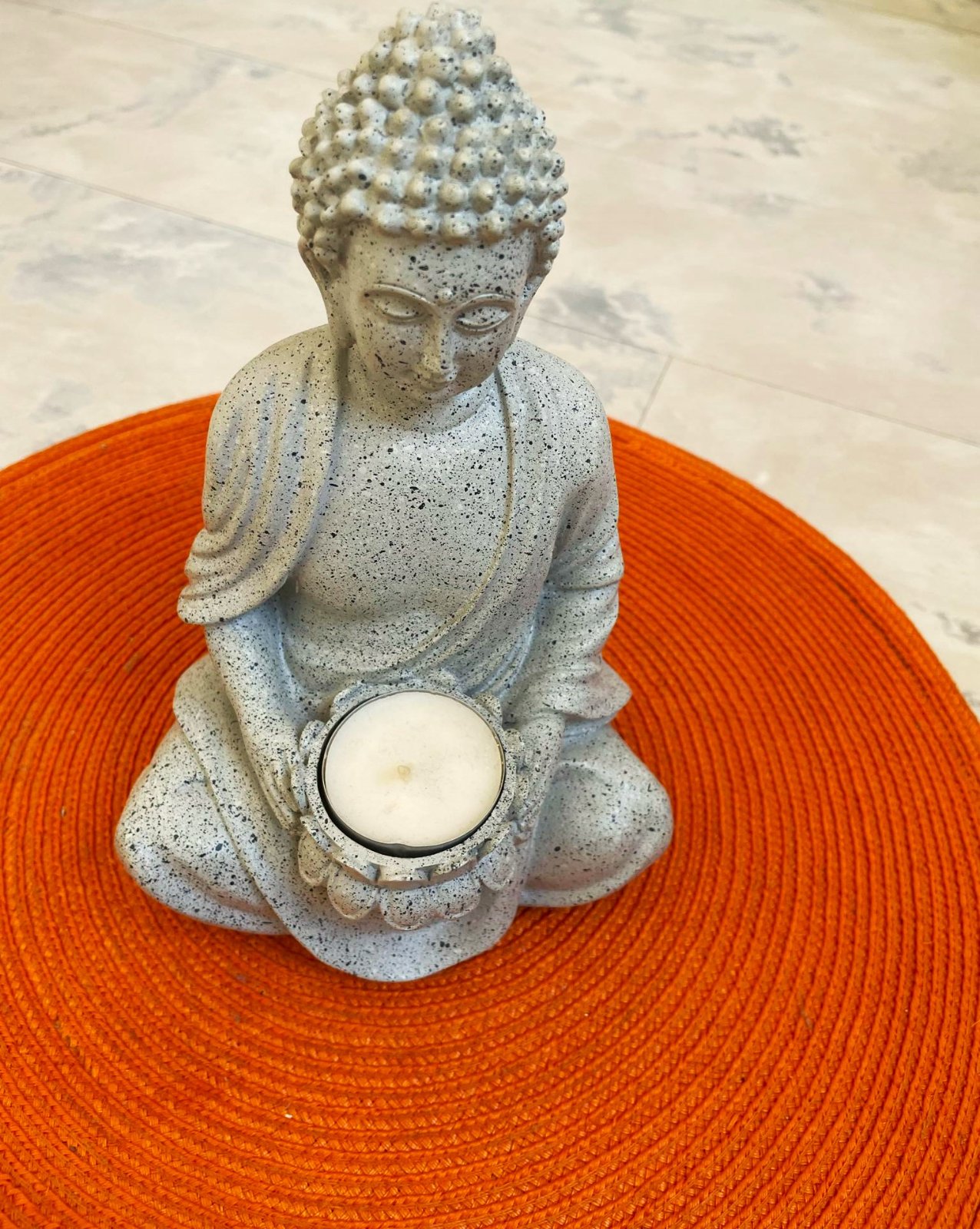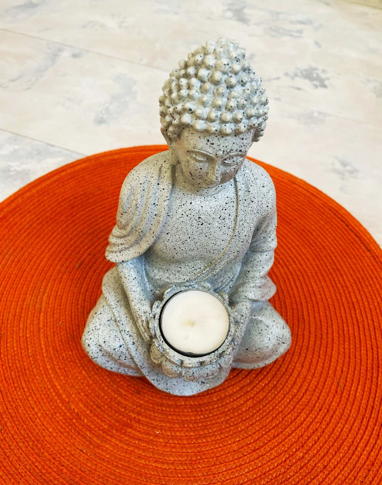 vystavená iba na poličke,20 x 13 cm,materiál vyzerá ako kameninový,ale nie je to kameň,ale ani plast,v rukách má podstavec na čajovú sviečku