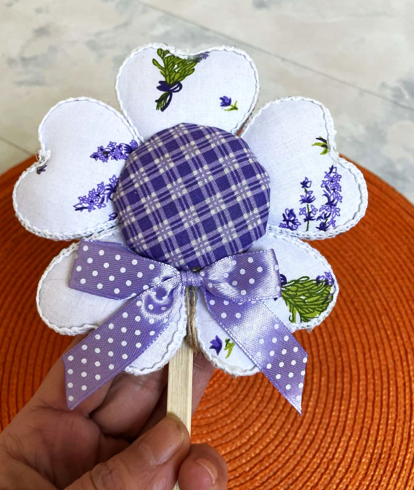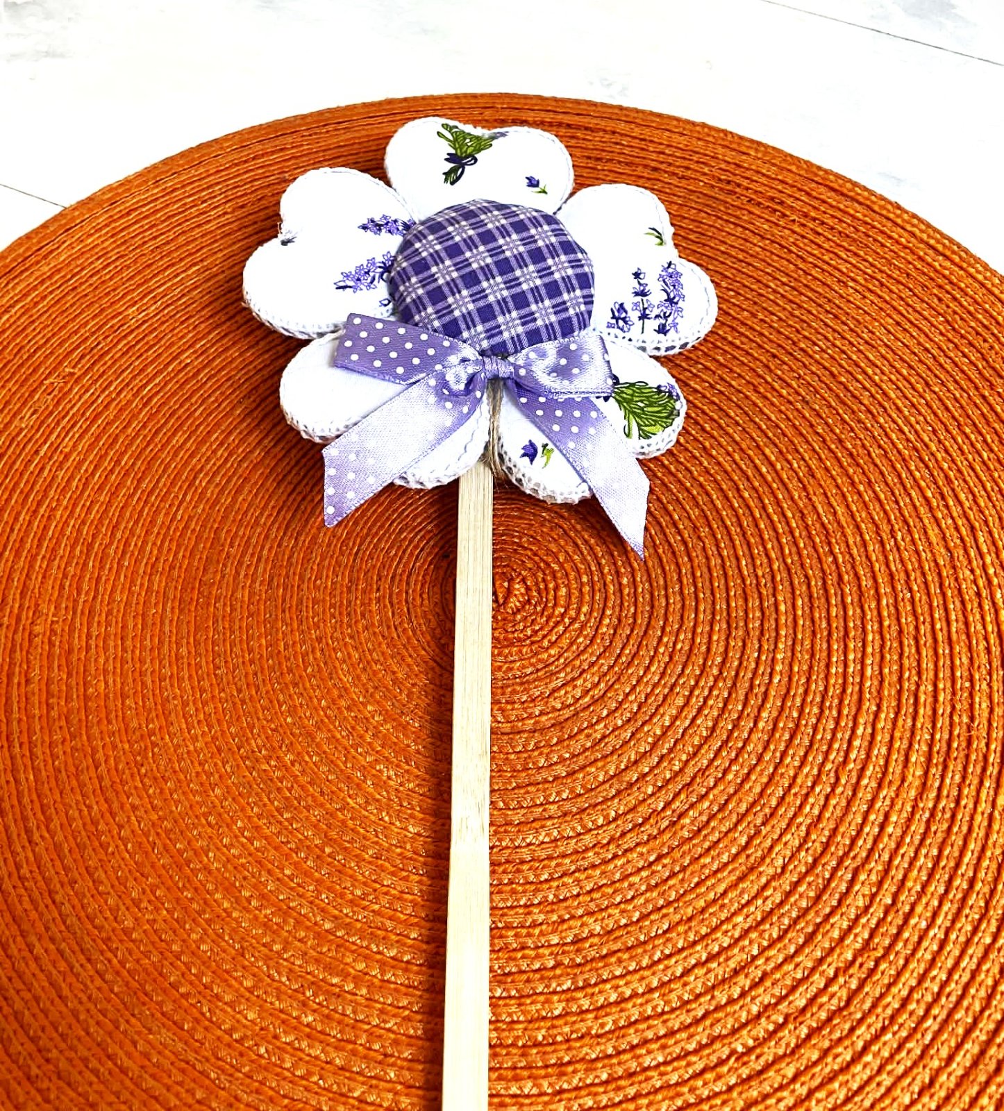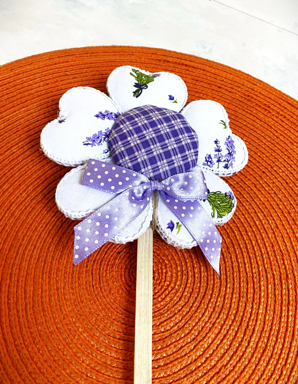 levanduľový látkový zápich, ktorý slúži ako dekorácia alebo ozdoba do domácnosti,top stav - bola iba vystavená ako dekorácia,je vyrobený z bavlnenej látky s motívom levandue, používa sa ako vintage alebo provensálska ozdoba, často v rámci veľkonočných alebo jarných dekorácií.