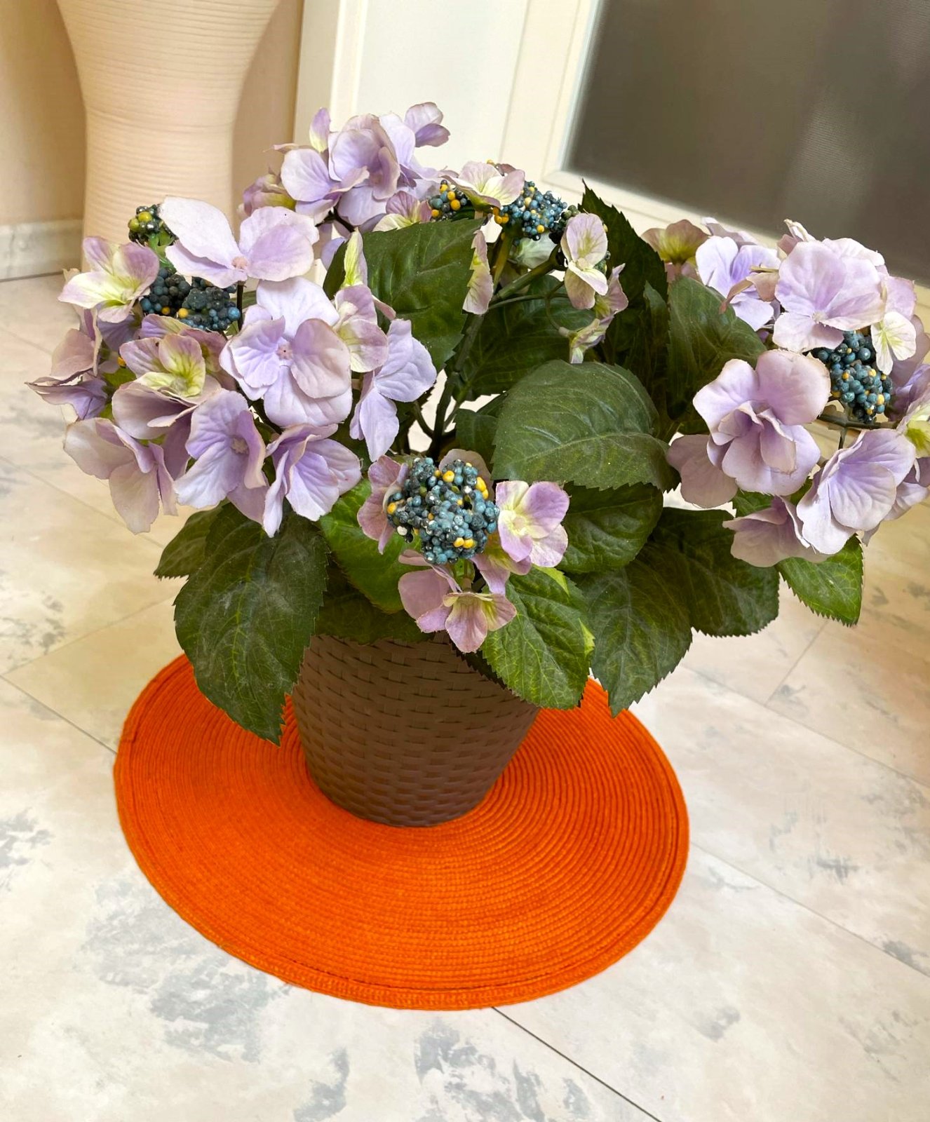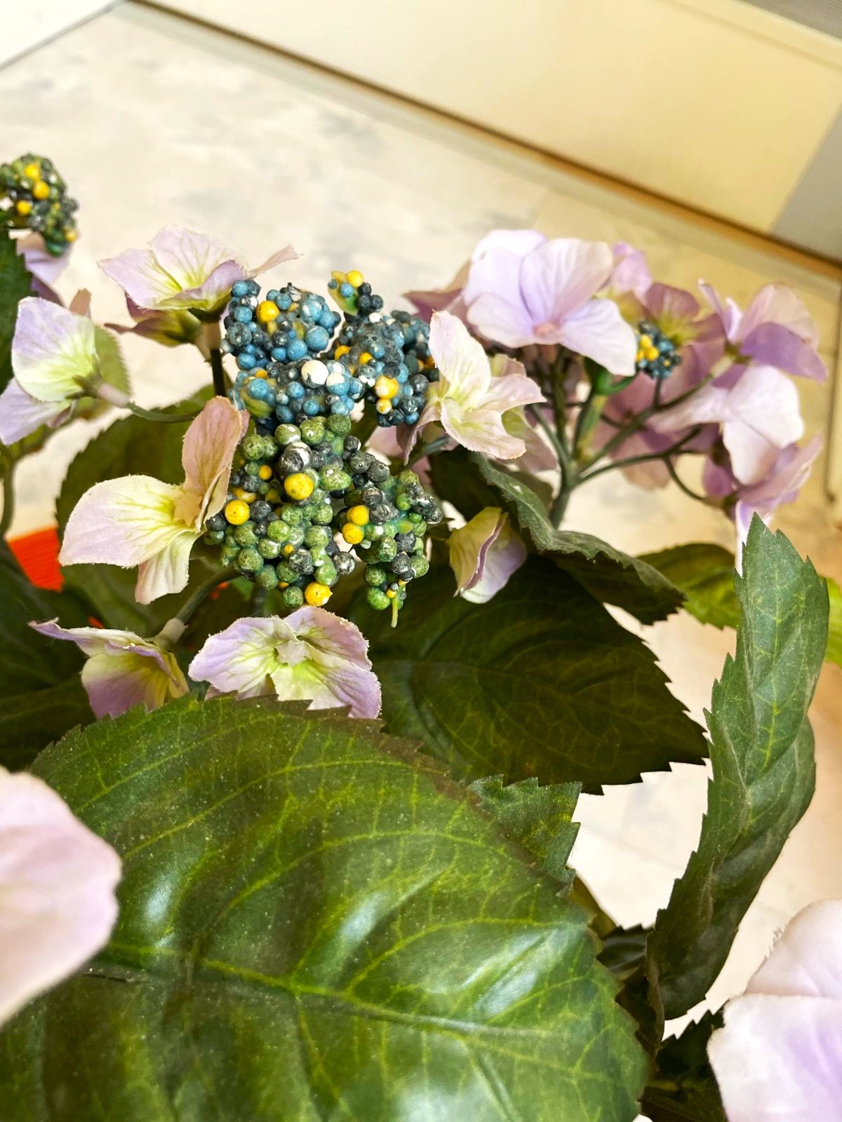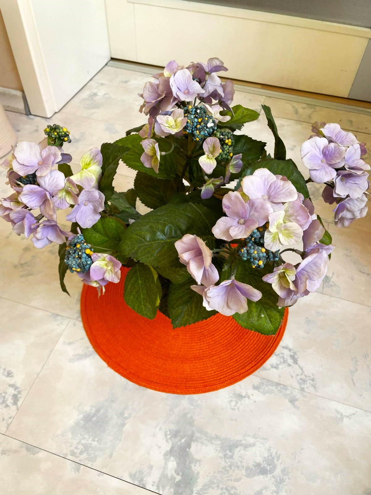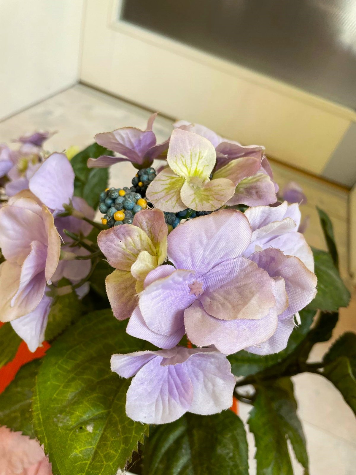 verná imitácia umelej hortenzie,veľká a veľmi hodnoverná,top stav,zaliata v bielom plastovom črepníku,črepník na obrázku je iba pre dekoráciu,bola iba vystavenáv v interiéri,výška spolu s črepom = 40 cm, priemer vrchnej korunky kvetov = 40 cm