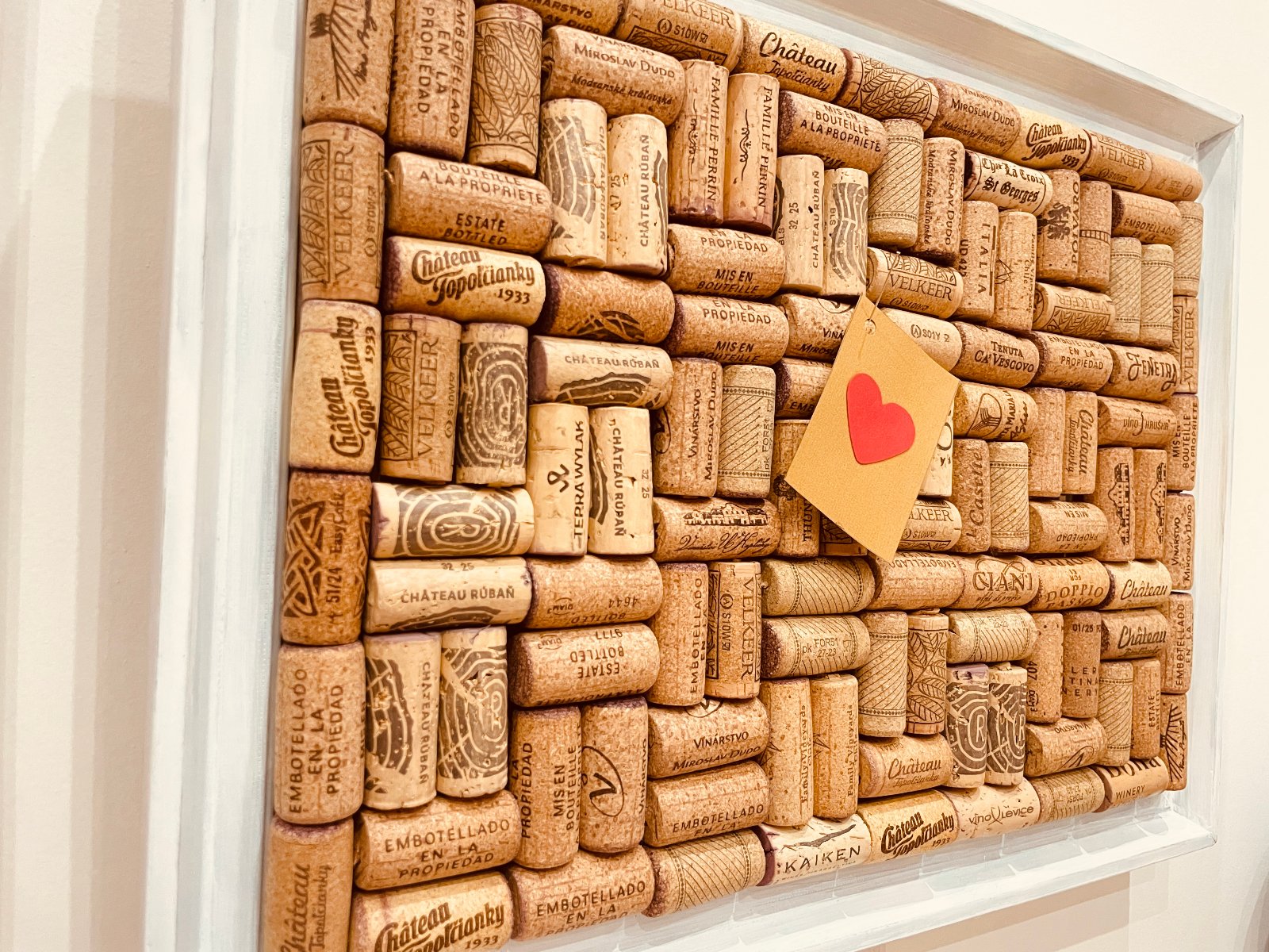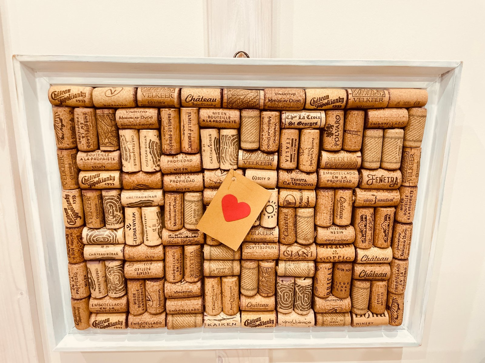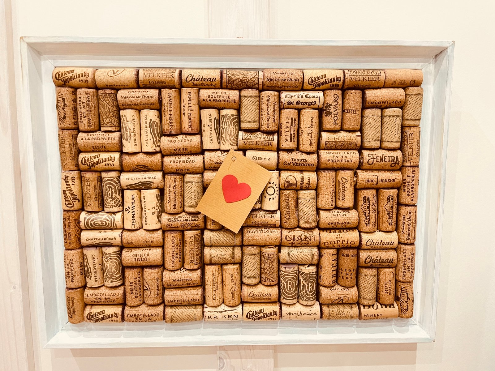 Základ tvorí starý rám a korky z vín z Slovenska ale i celého sveta. Na zadnej strane je úchyt na zavesenie.