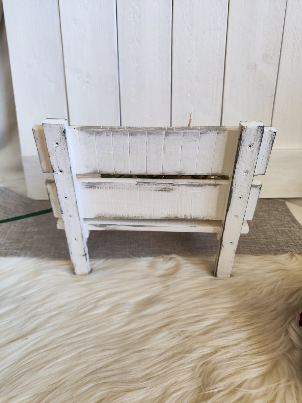 Lavička z dreva 2. triedy, natretá bielou akrylovou farbou, doplnená šedou, aby budila "starý" dojem, vhodná ako dekorácia, na menší kvet, pre postavičky ( môžu na nej sedieť)....