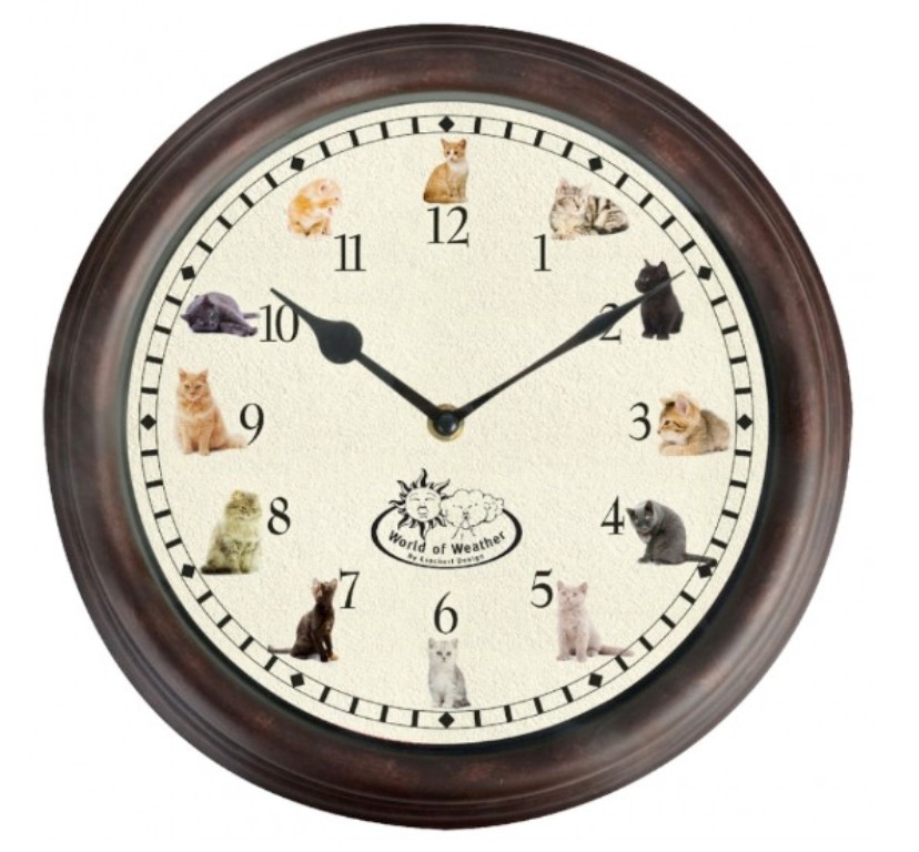 Originálne nástenné hodiny s 12 mačičkami v každú celú zamňaukajú. Majú 24 hodinový cyklus, medzí od 22:00 - 5:00 nemňavkajú. Zvukové signály sa dajú aj celodenne vypnúť.