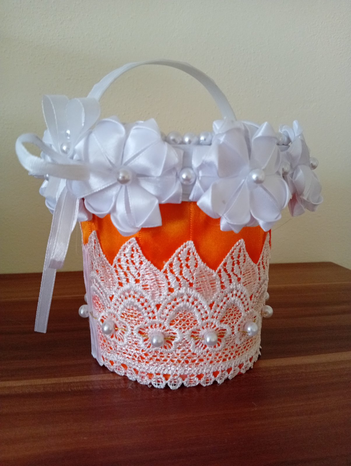 Ručné vyrobené zo satenovej stuhy ružičky a lístky. Cena plus poštovné. Cena košíčka 5 euro.