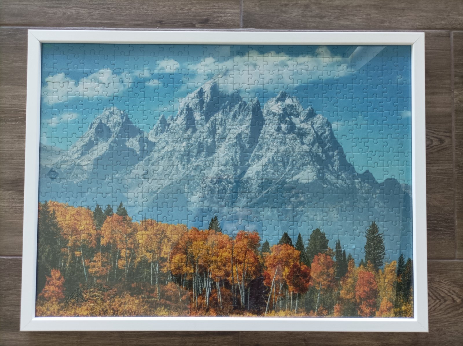 Predám poskladané puzzle v bielom ráme pod sklom s témou Skalnaté vrchy pod jesenným lesom. Rozmery 51,8 cm x 38,8 cm.