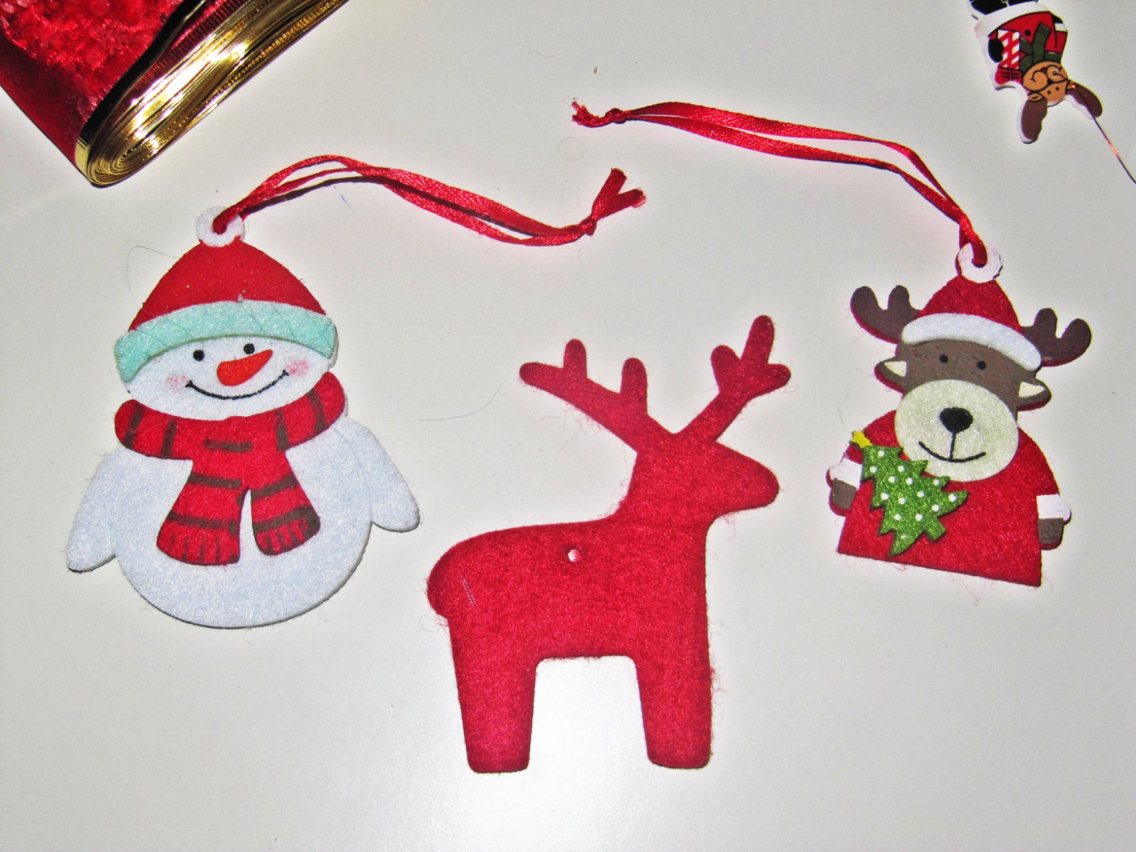 4, Snehuliak, 2 x sobík. Sobík výška je 9,5 cm, snehuliak výška je 9 cm a sobík výška je 7 cm. Sú z pevného filcu.