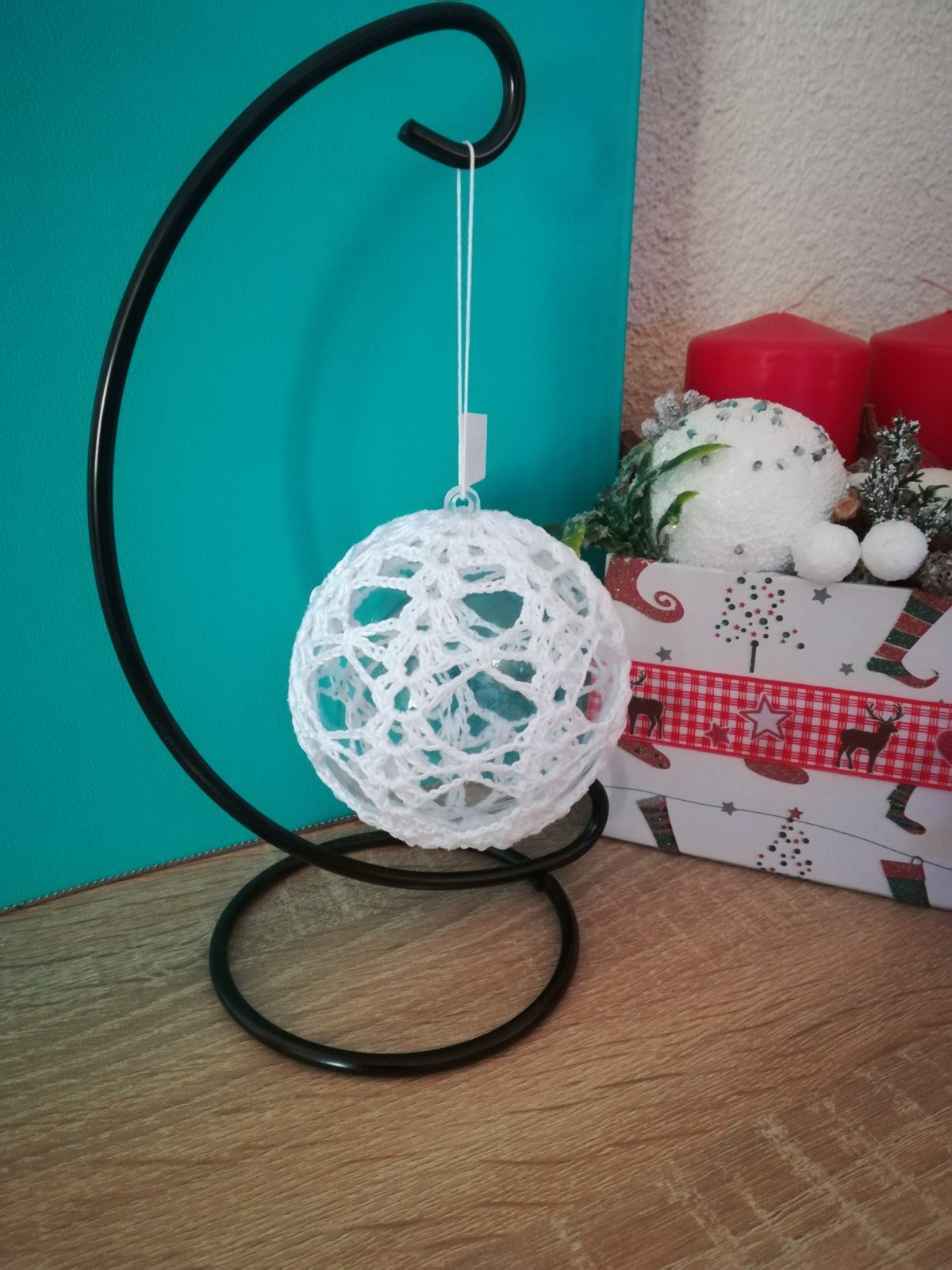 Obháčkovaná priesvitná plastová guľa o priemere 8,5 cm s uškom na zavesenie na vianočný stromček alebo vhodná len ako dekorácia. Cena za 1 kus je 3,-Eur. Doba dodania závisí od počtu požadovaných kusov.