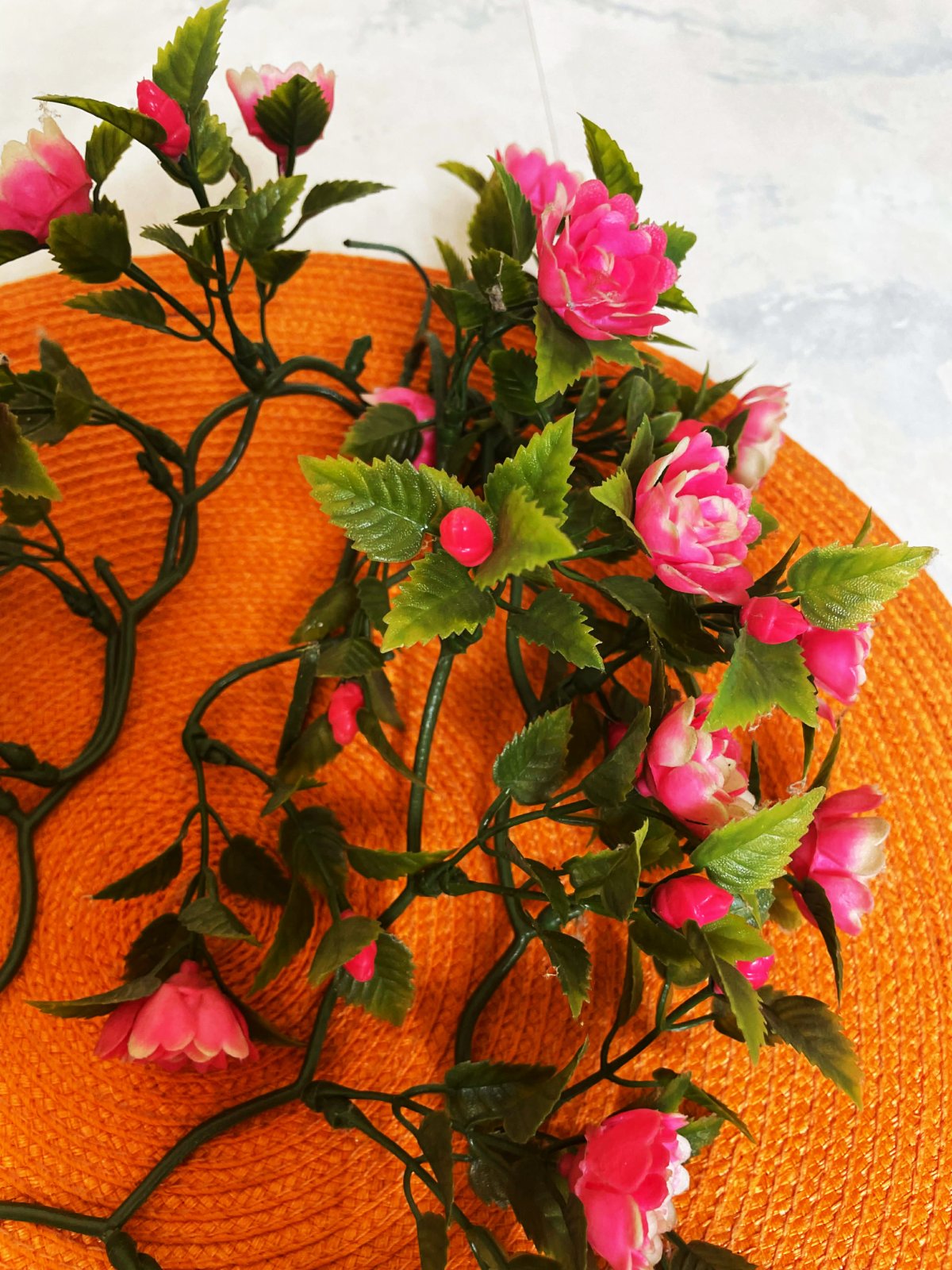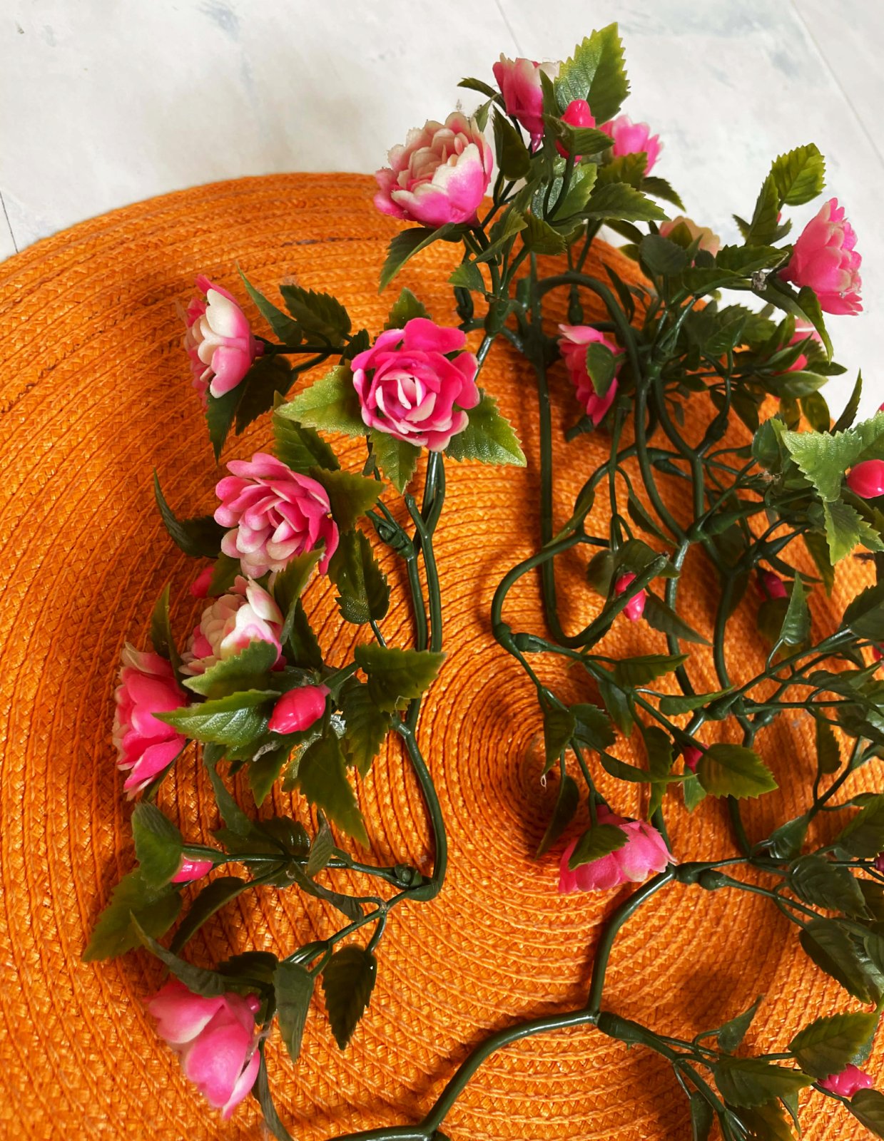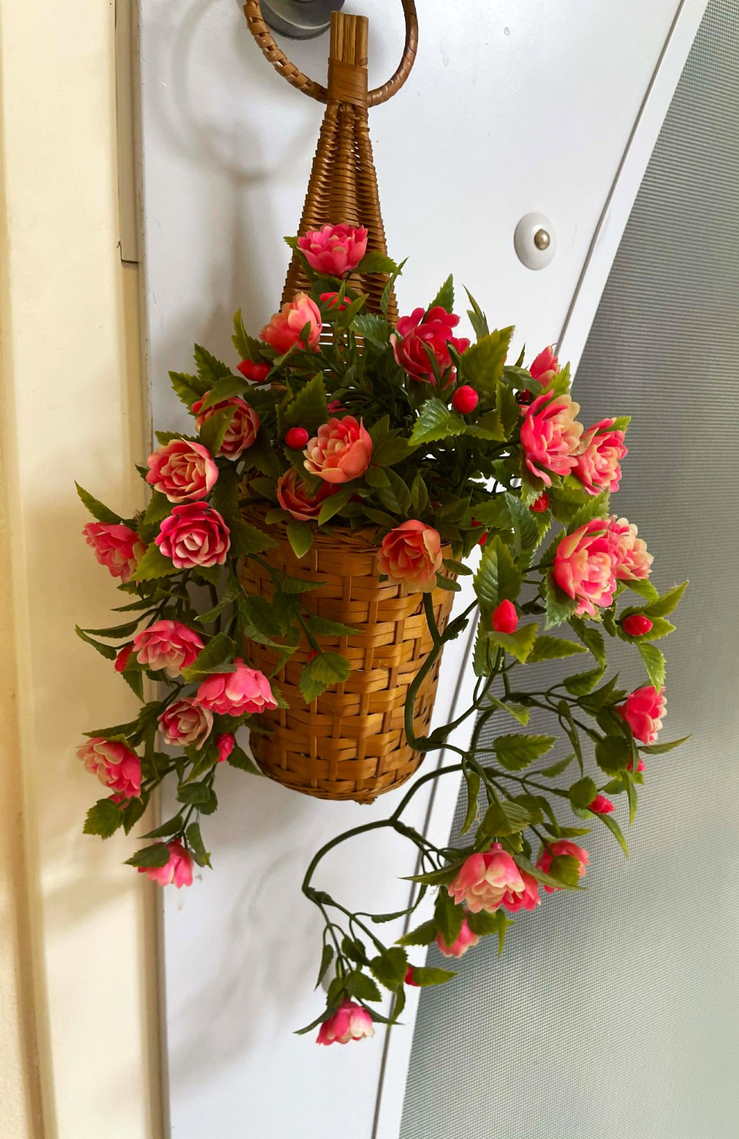 závesný prútený kôš s umelými červenými kvetmi,vhodný na oživenie interiéru,drobné kvietky som pridala na zahustenie objemu v otvore