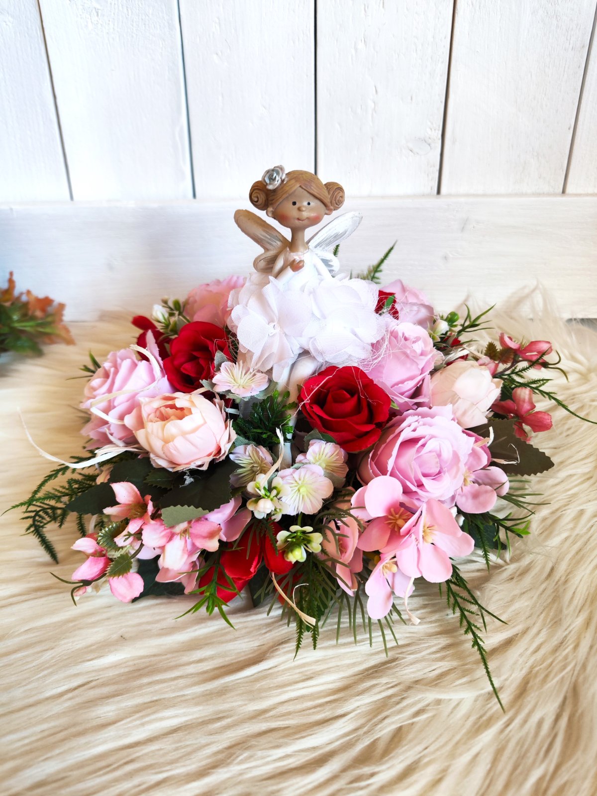 Dekorácia na drevenej doske, umelá zeleň a krásne ruže, víla- anjel.