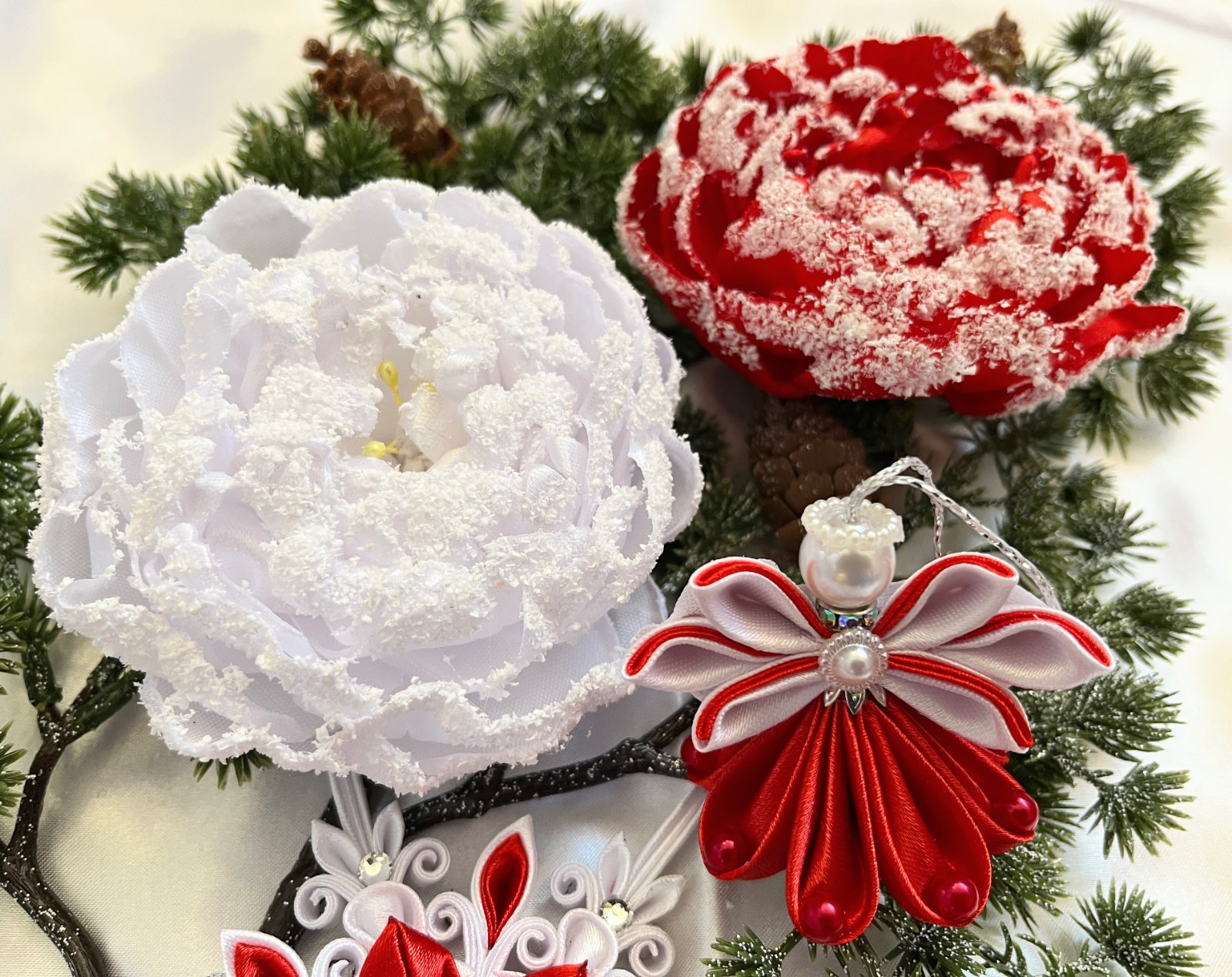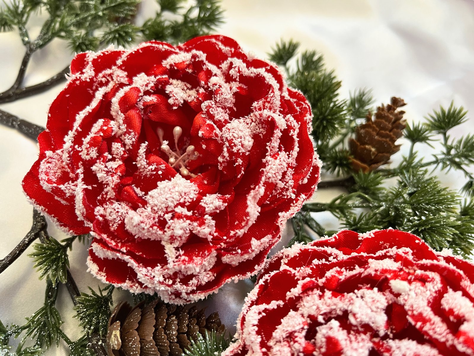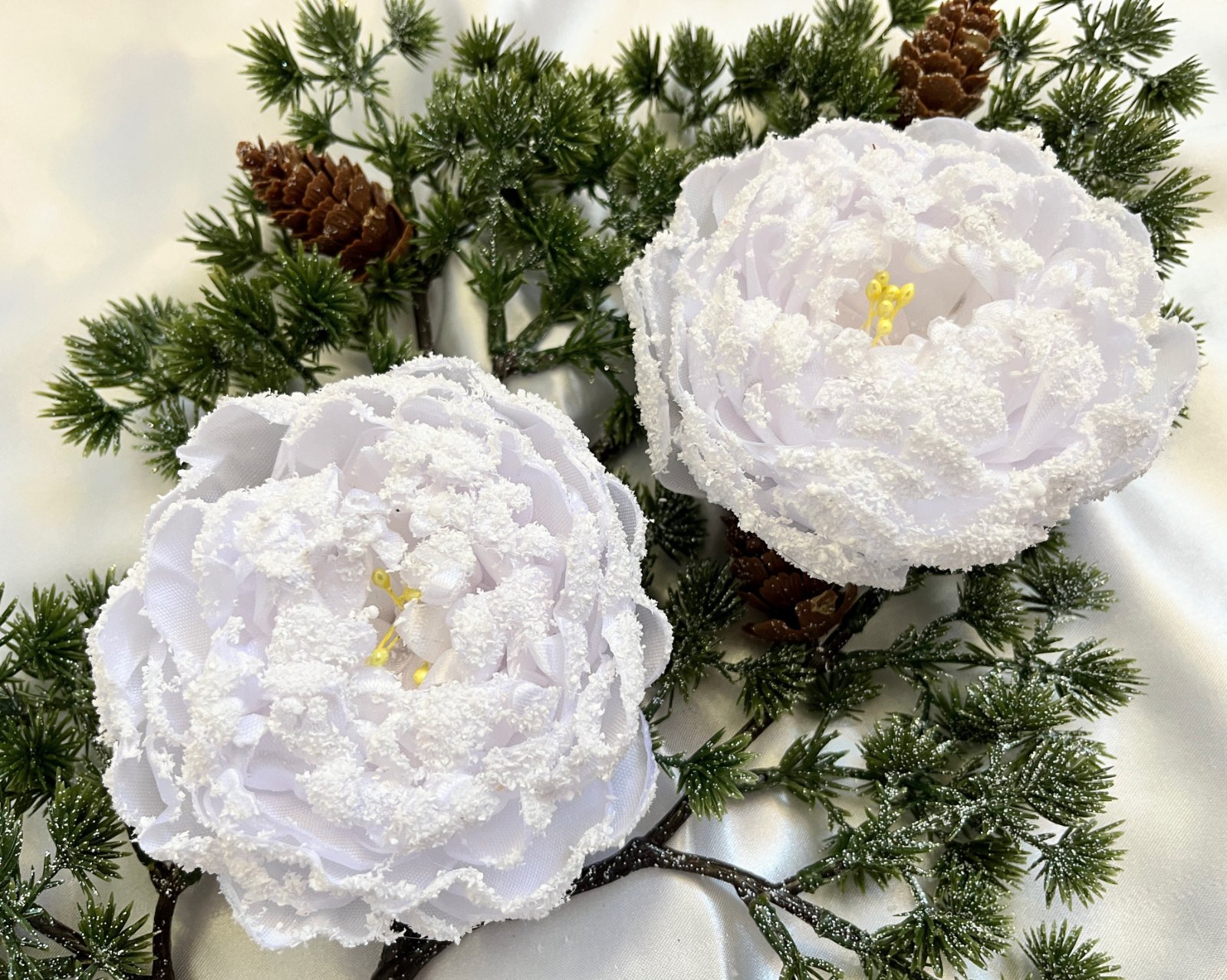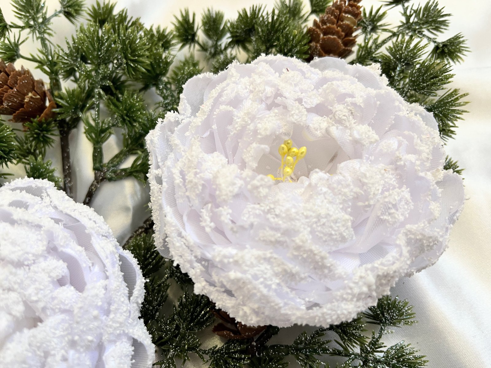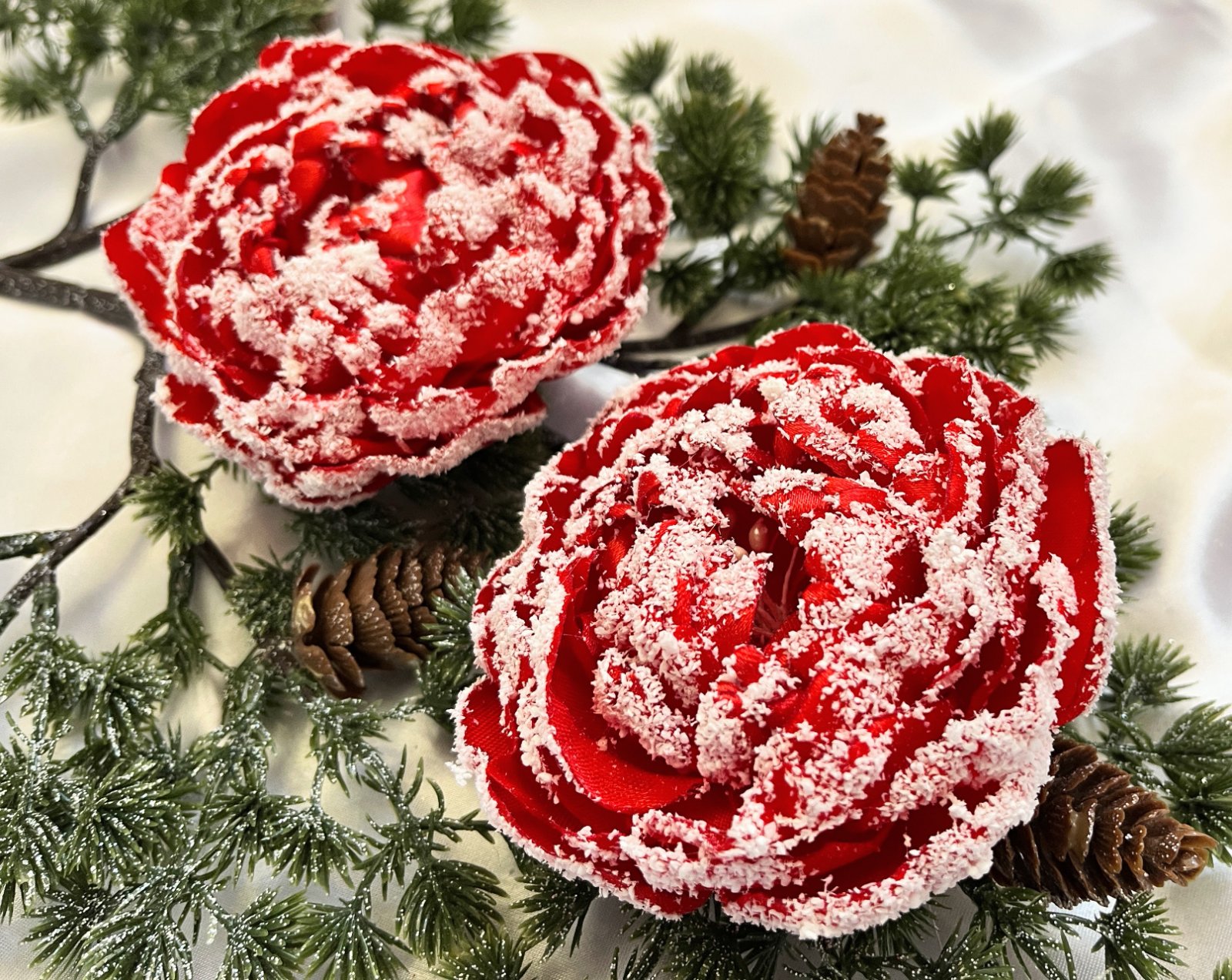 Táto vianočná pivonka je pripevnená na malej kovovej pinetke, vďaka ktorej krásne drží na vašom stromčeku, ale vynikne aj vo sviatočných aranžmánoch bez štipca.