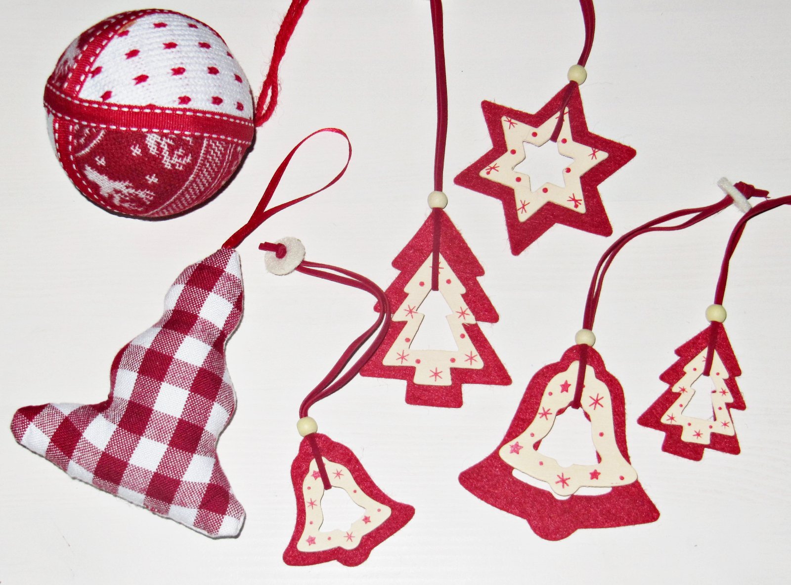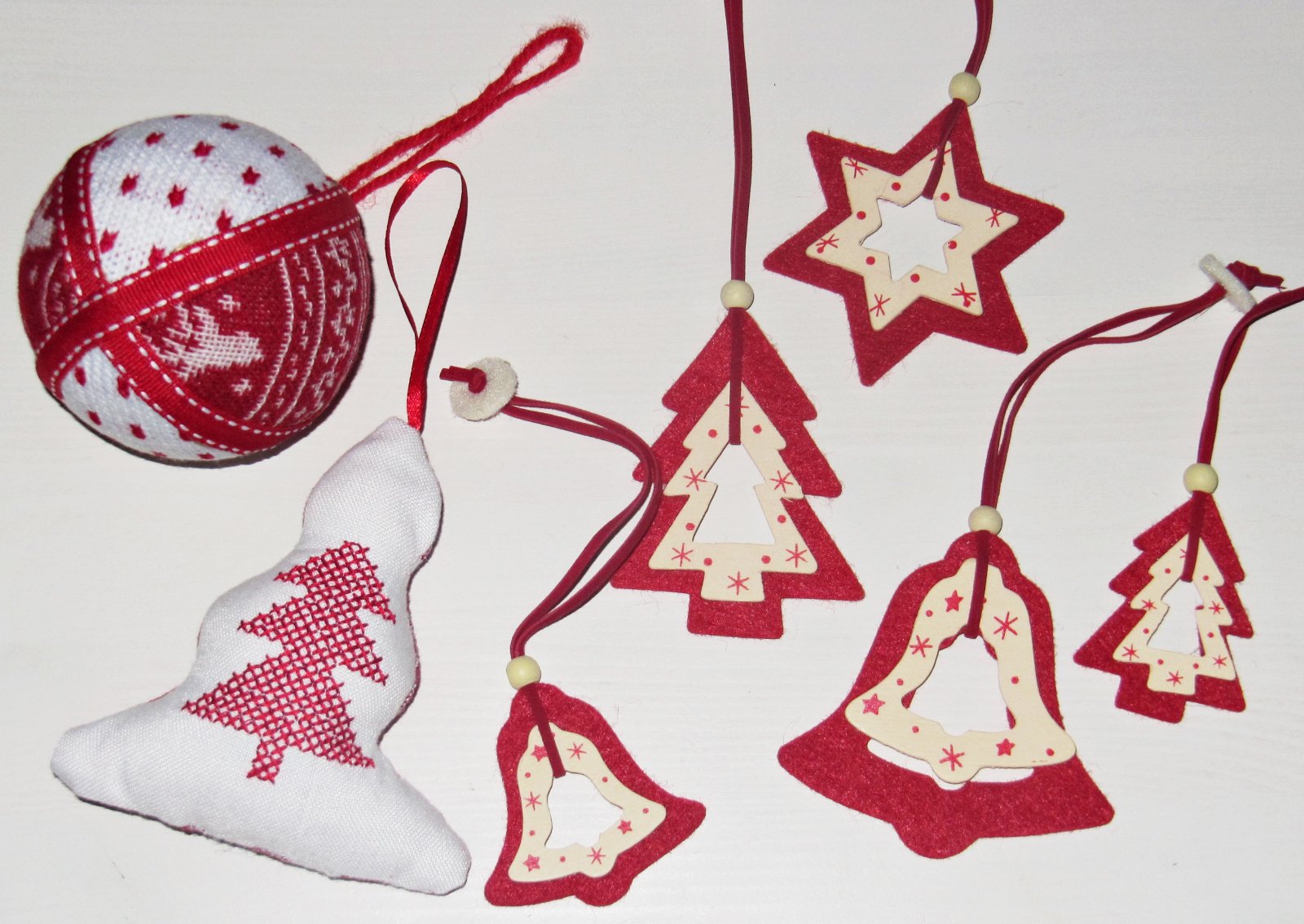 Mám na predaj vianočné dekorácie : sada 7 kusov. Cena za celú sadu je 7,50 eur. Vianočná guľa - štrikovaná látka, stuha, gombík. Vianočné ozdoby sú robené z pevného filcu a z dreva. Hviezda 7 cm x 6 cm.
