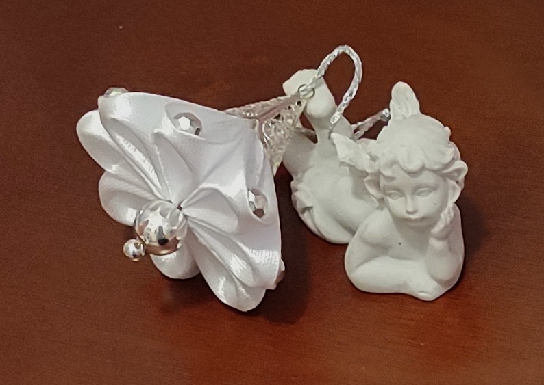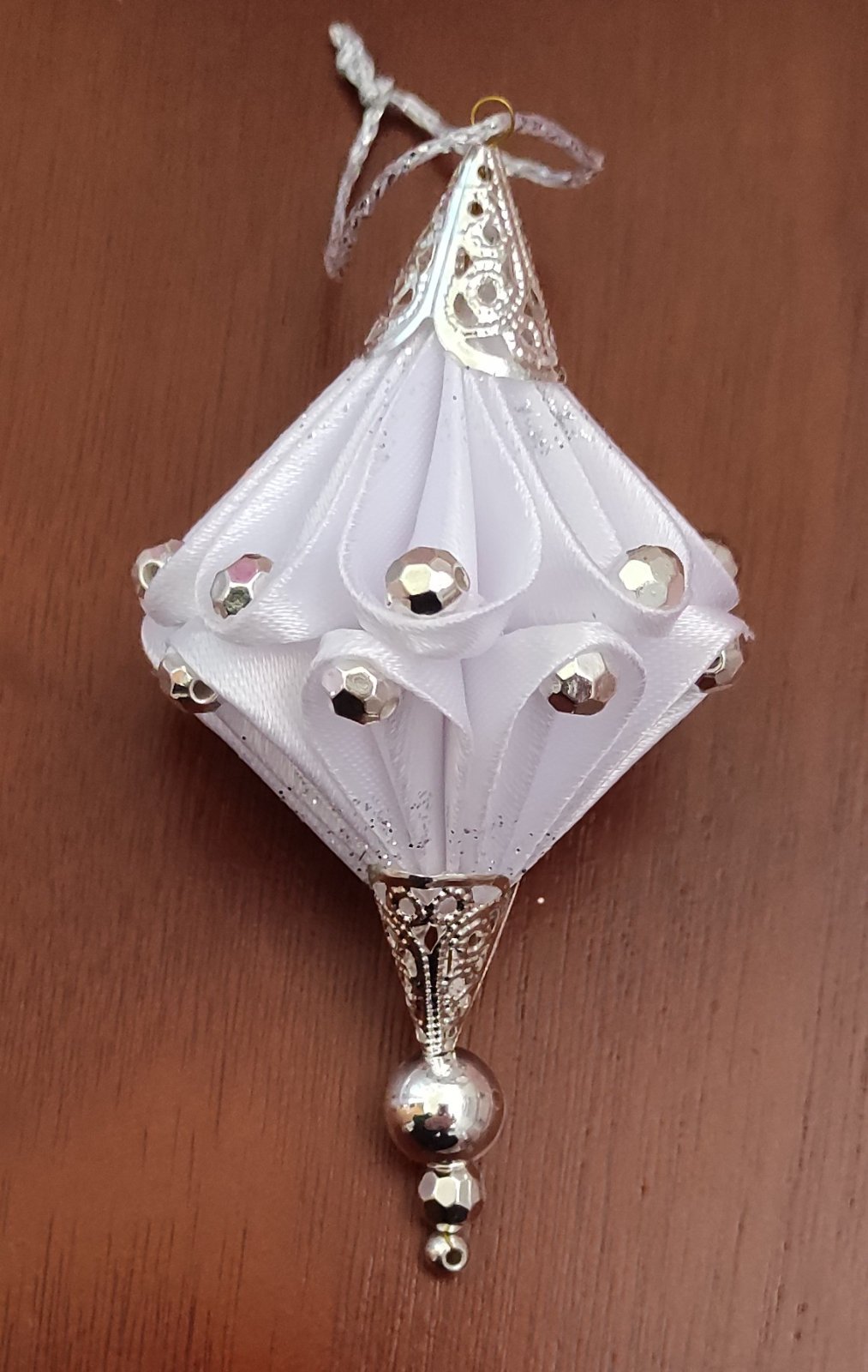 Saténová vianočná ozdoba v tvare cencúľa či zvončeka je ozdobená striebornými či zlatými korálkami a trblietkami, ktorými dotvárajú sviatočnú atmosféru Vianoc.