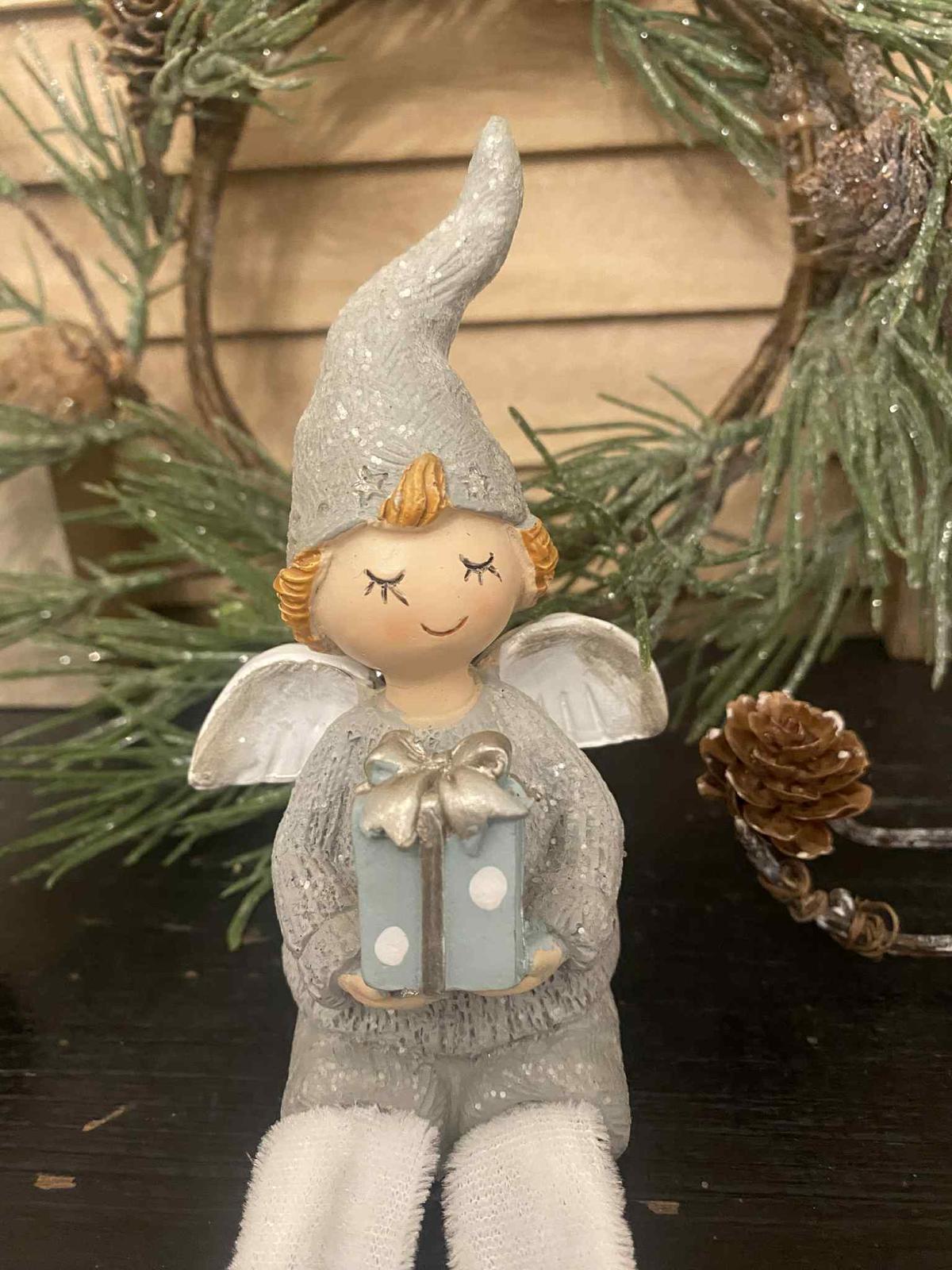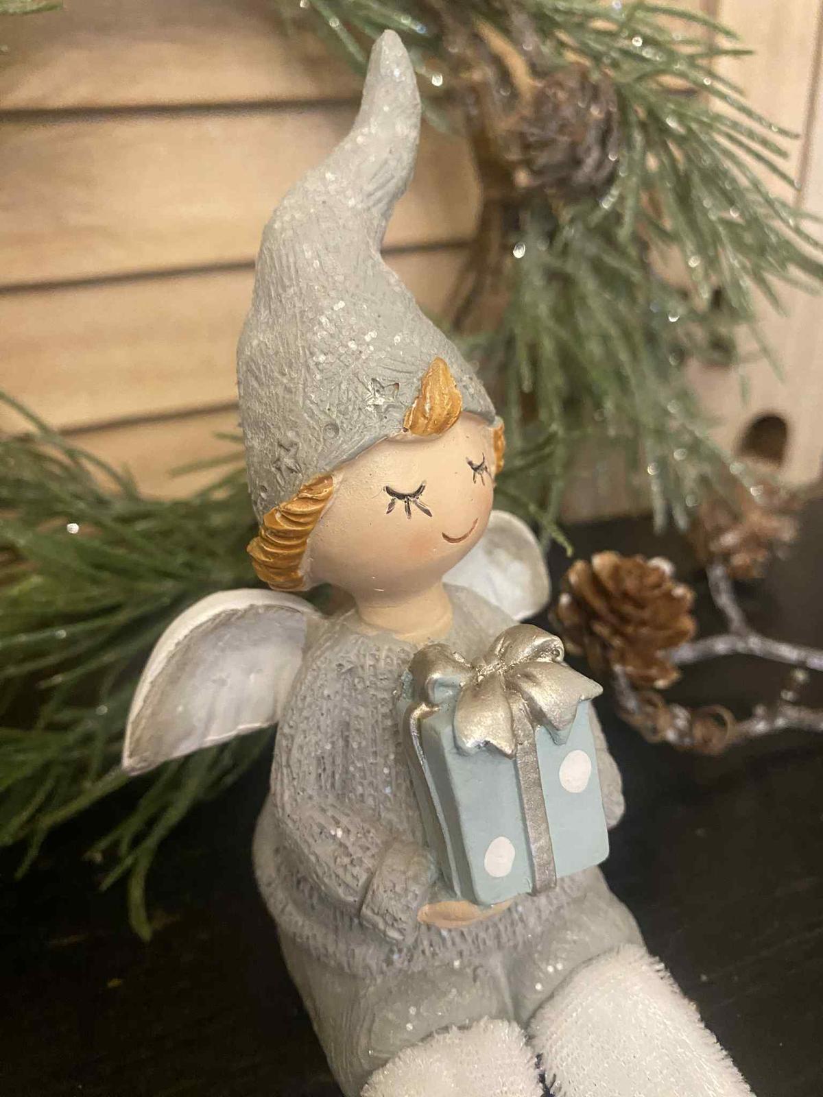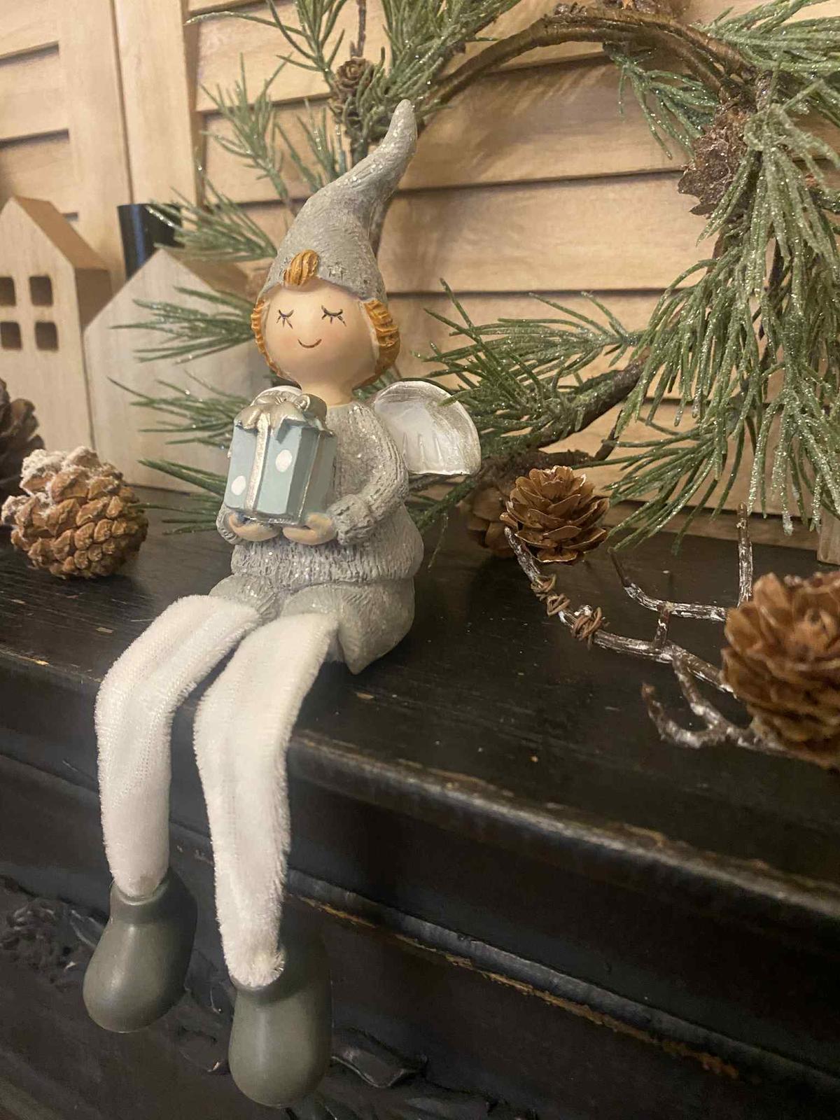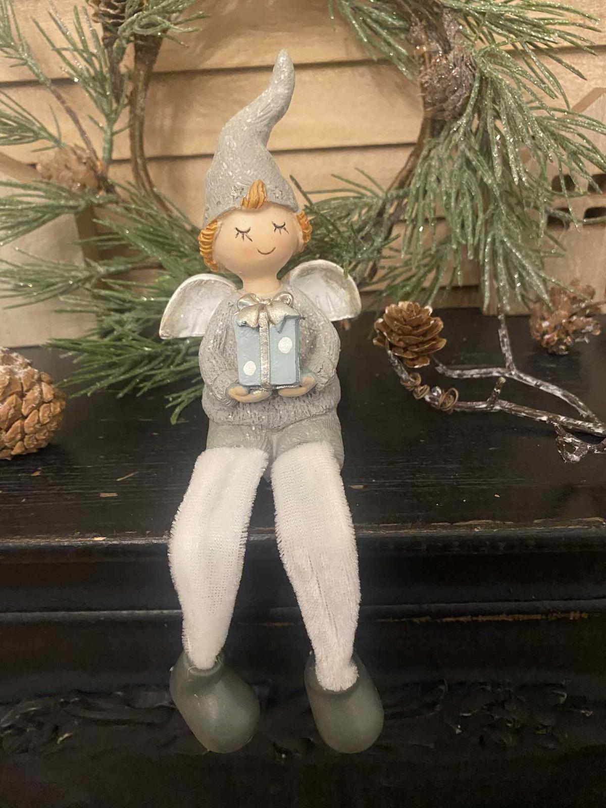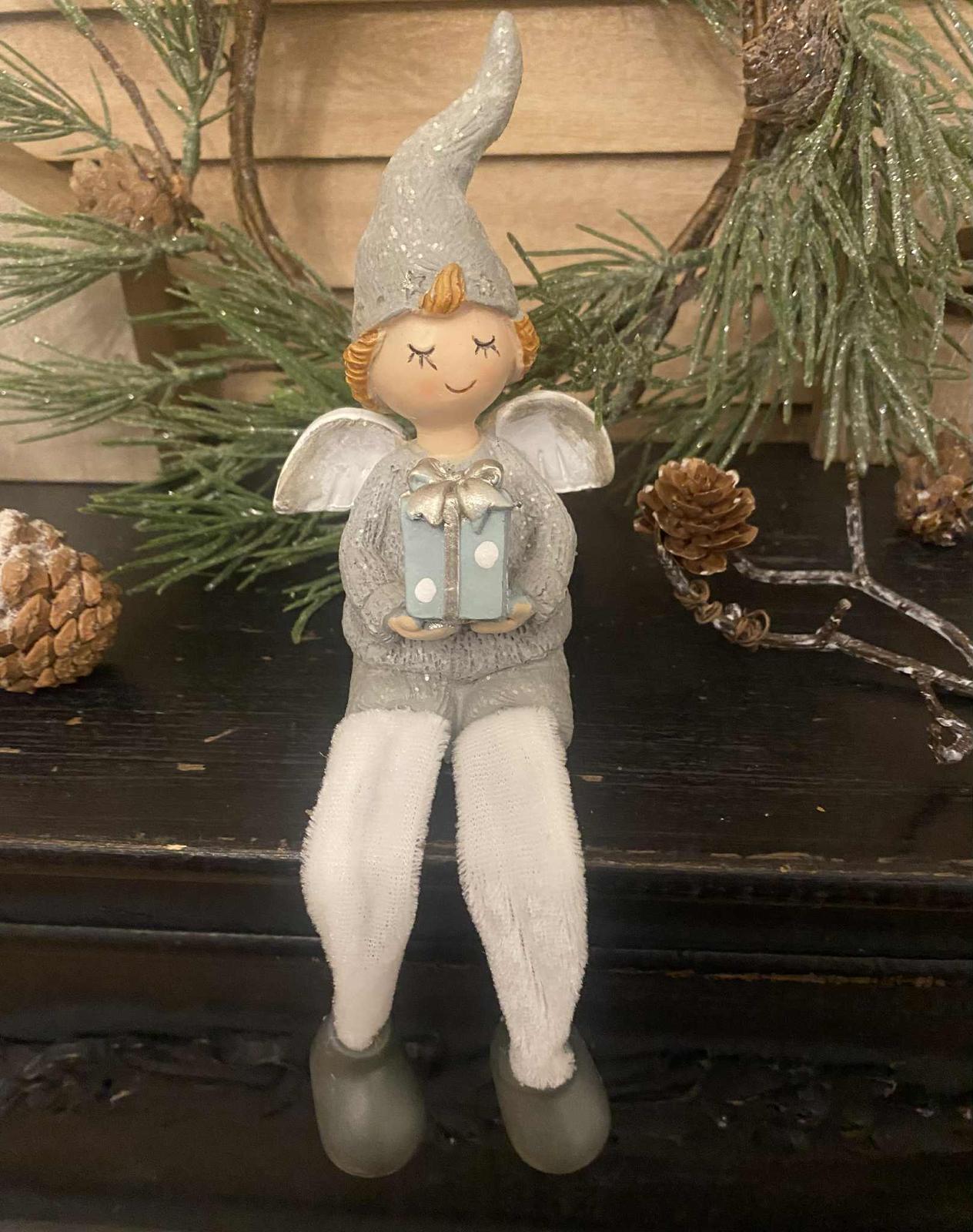 Predám sediacu zimnú postavičku s krídlami a s visiacimi nohami na posadenie na okraj nábytku ( nôžky z textilu ) - anjel s darčekom