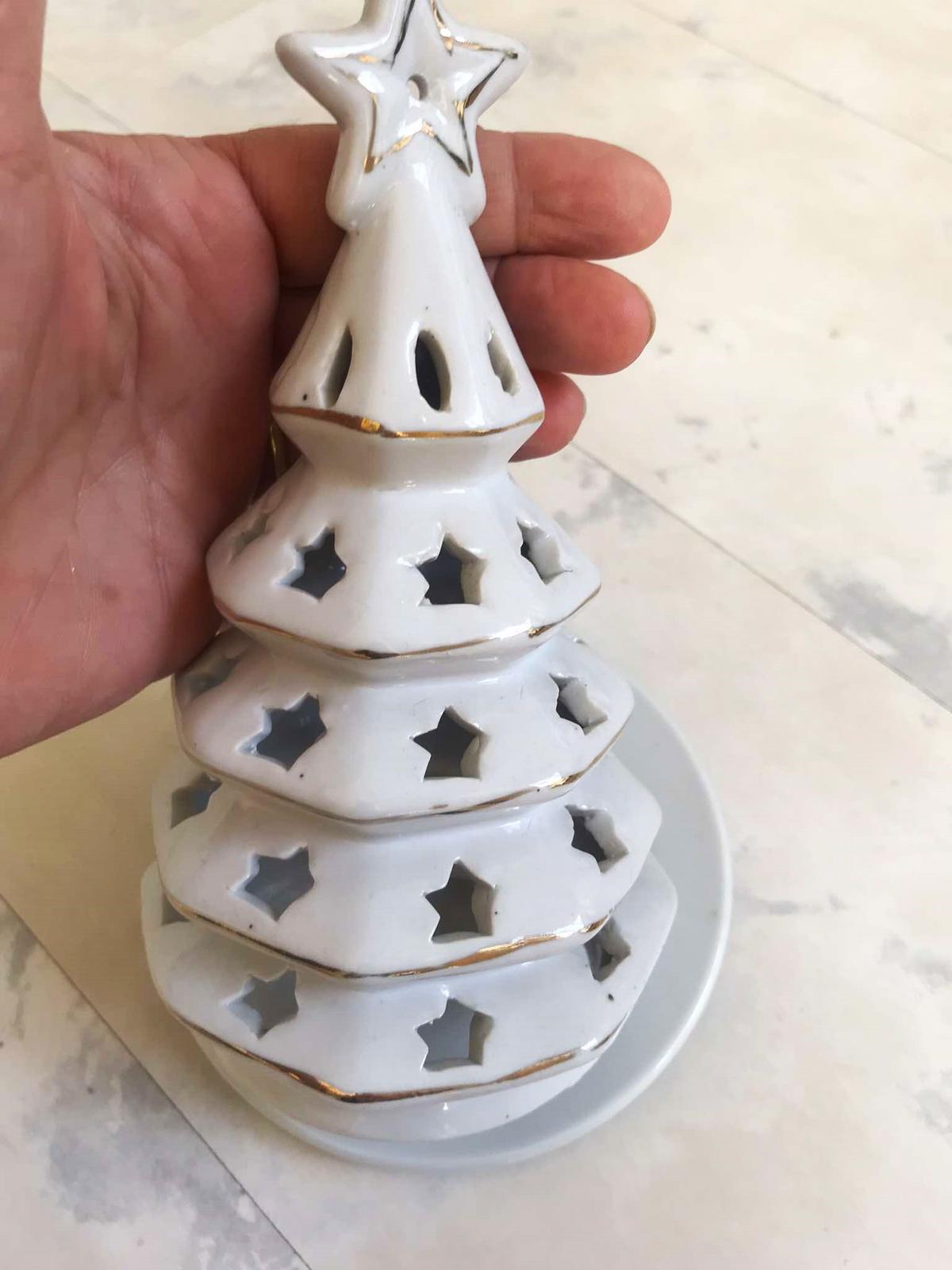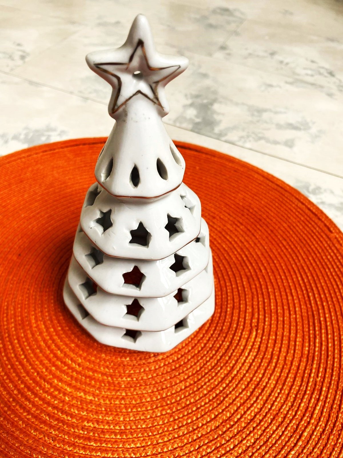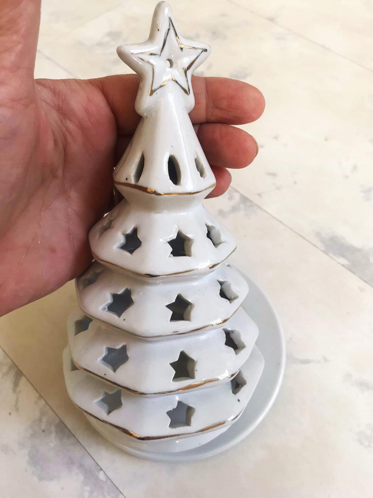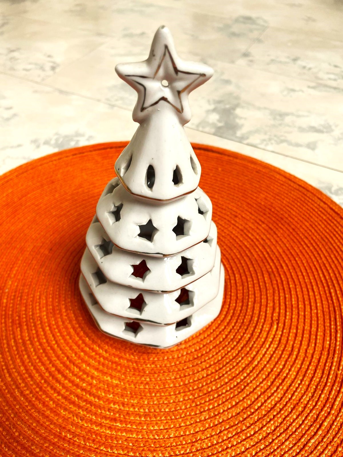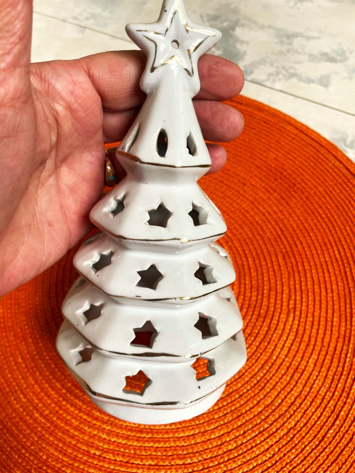málo používaná dekorácia,bola iba vystavená,stromček s otvormi hviezdičiek,pekne vynikne aj keď sa dá doň čajová sviečka,výška = 19 cm, spodný priemer = 10 cm