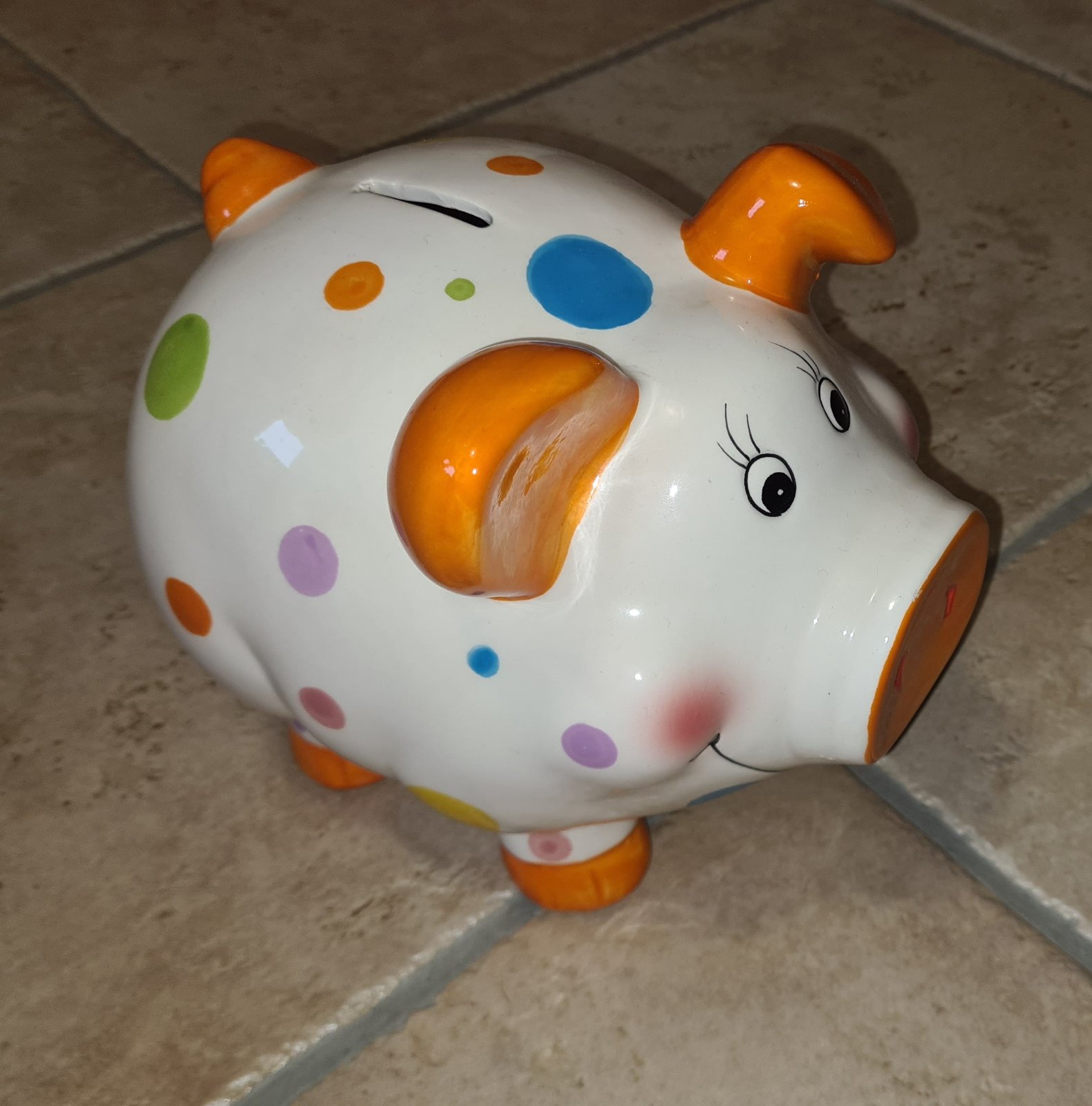 Veselé keramické, resp. hlinené prasiatko, ako sporiteľnička, šporkasa, zhora otvor na mince, zdola uzatvárateľný otvor, kade sa dajú vybrať, nie je nutné rozbiť.