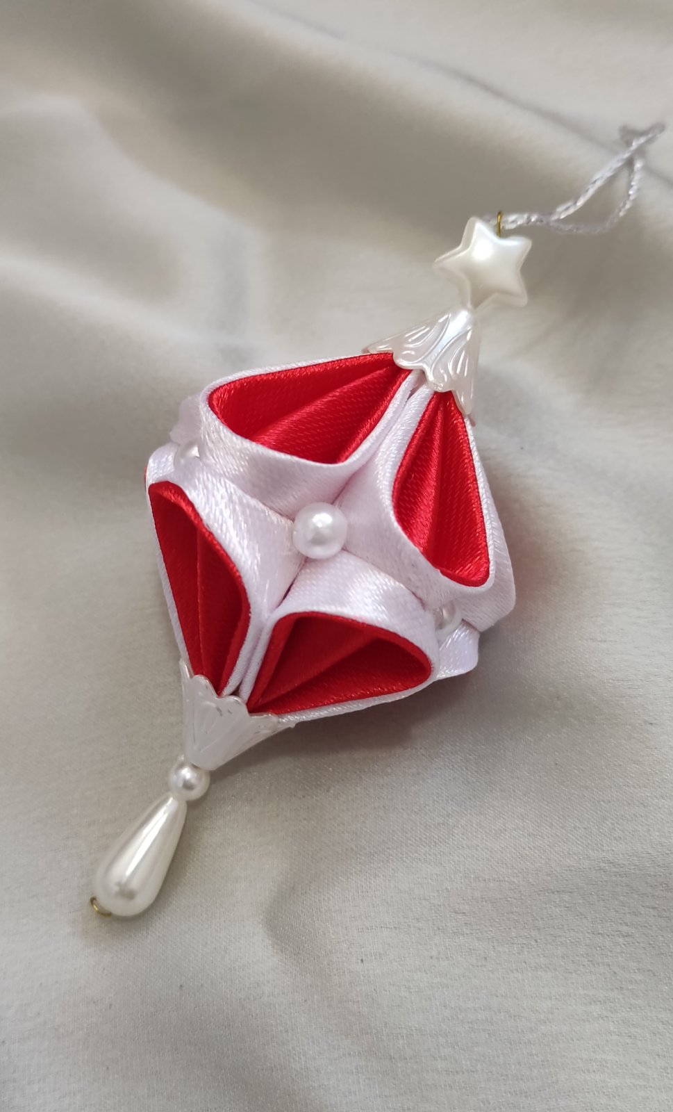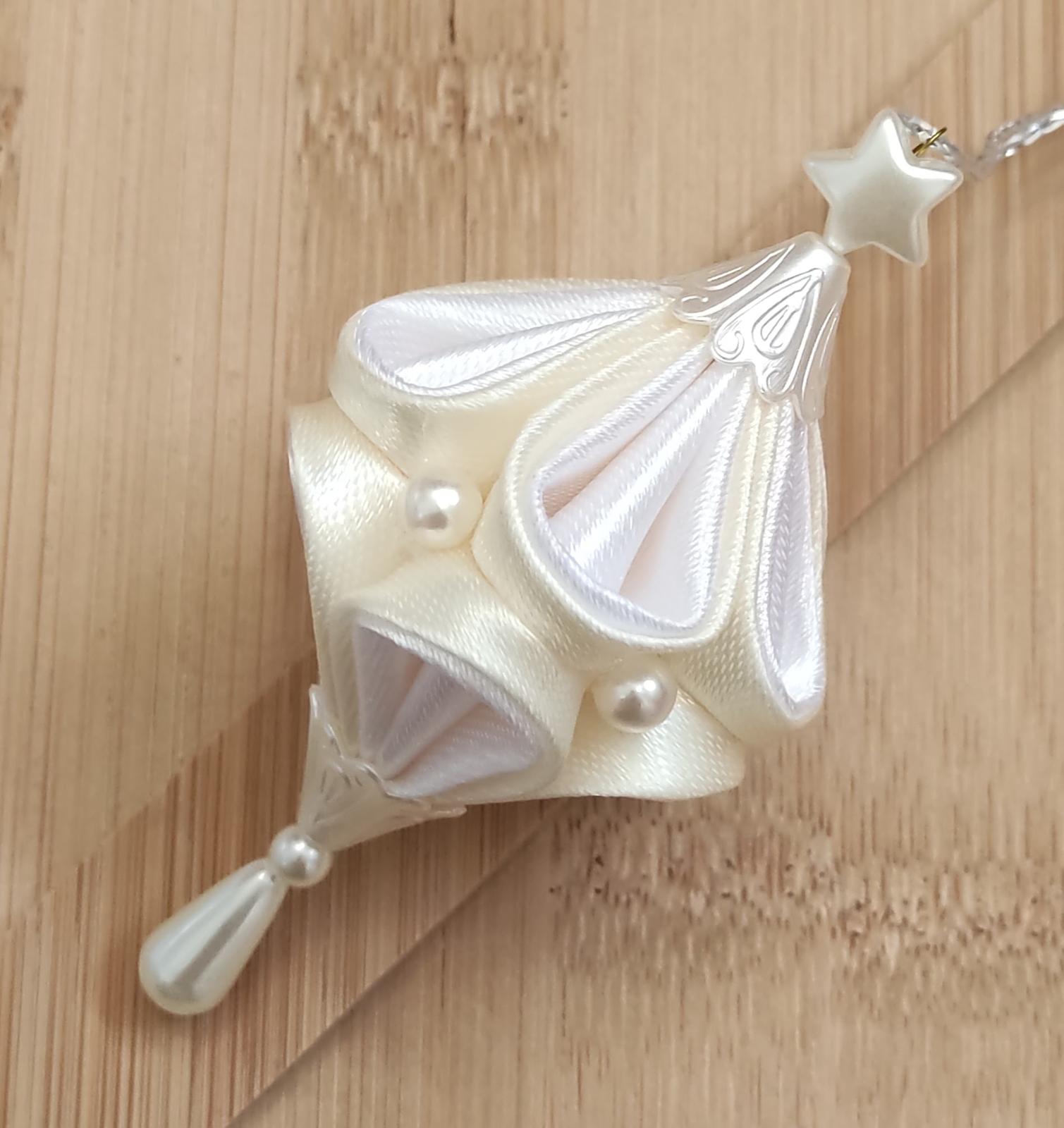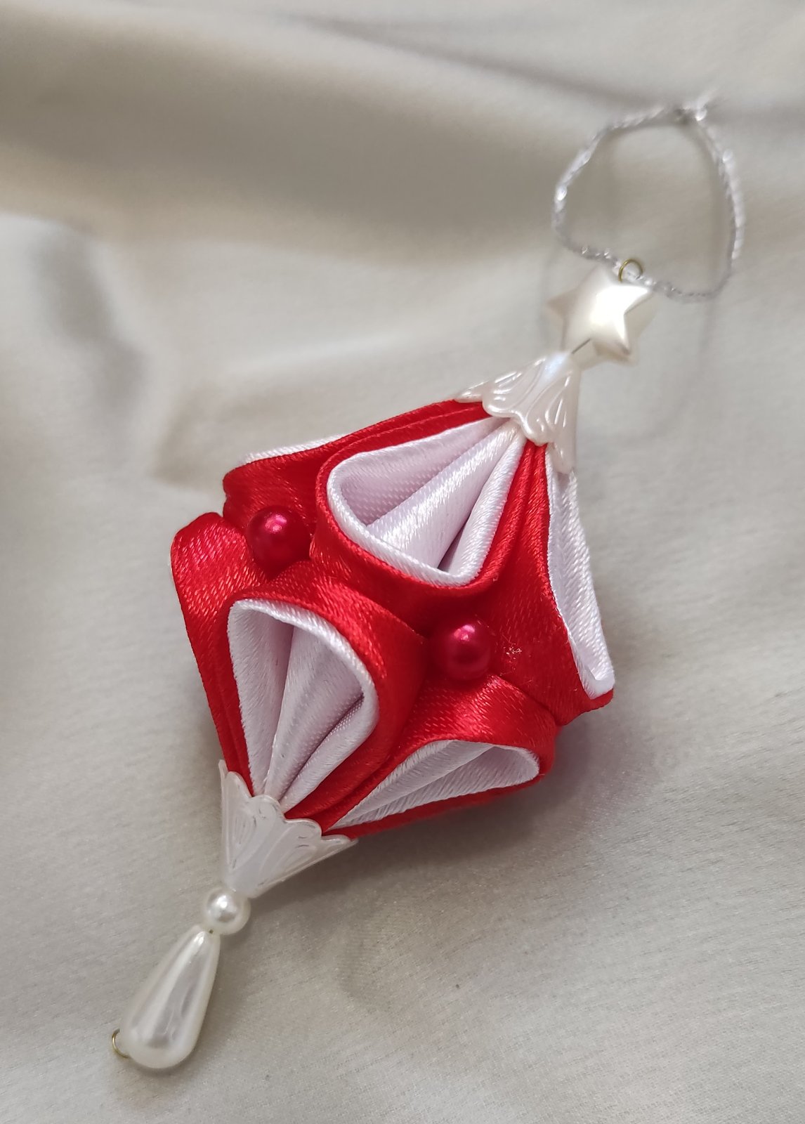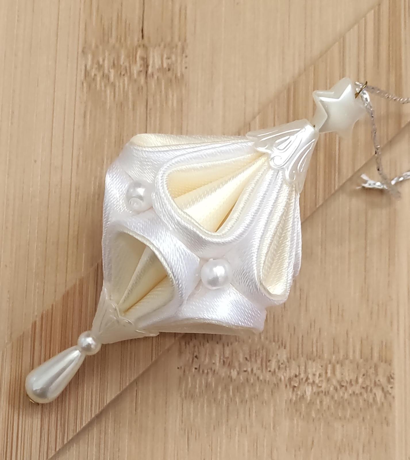 Jemná vianočná ozdoba, ktorá spája eleganciu saténu a ligot perličiek.