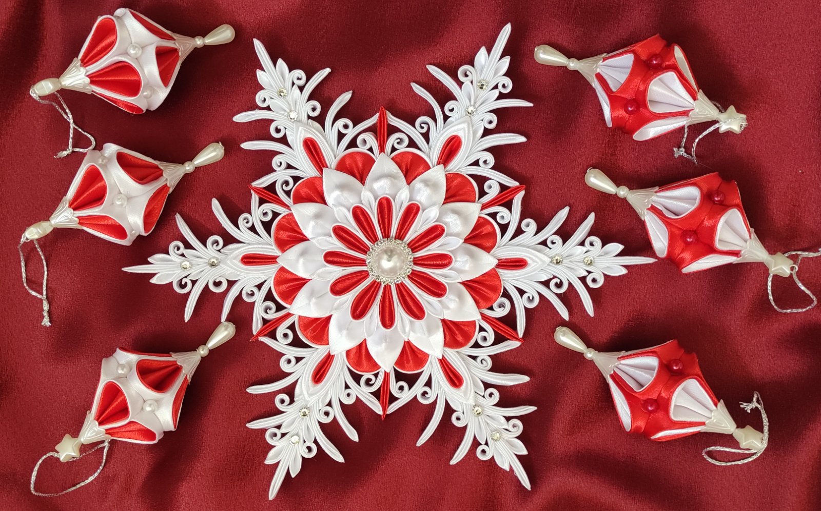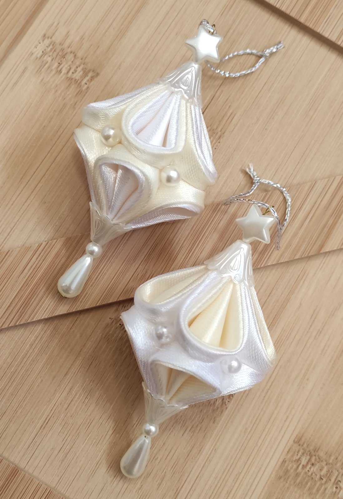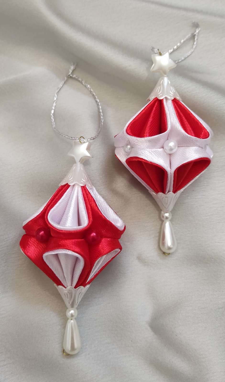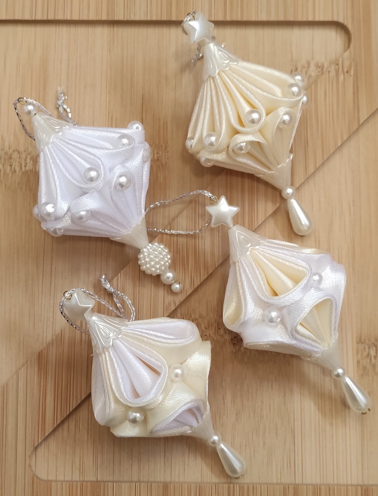 Jemná vianočná ozdoba, ktorá spája eleganciu saténu a ligot perličiek.