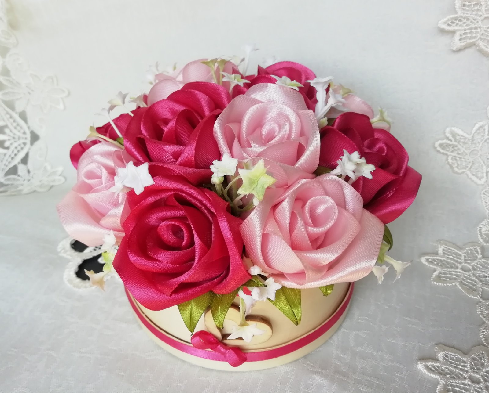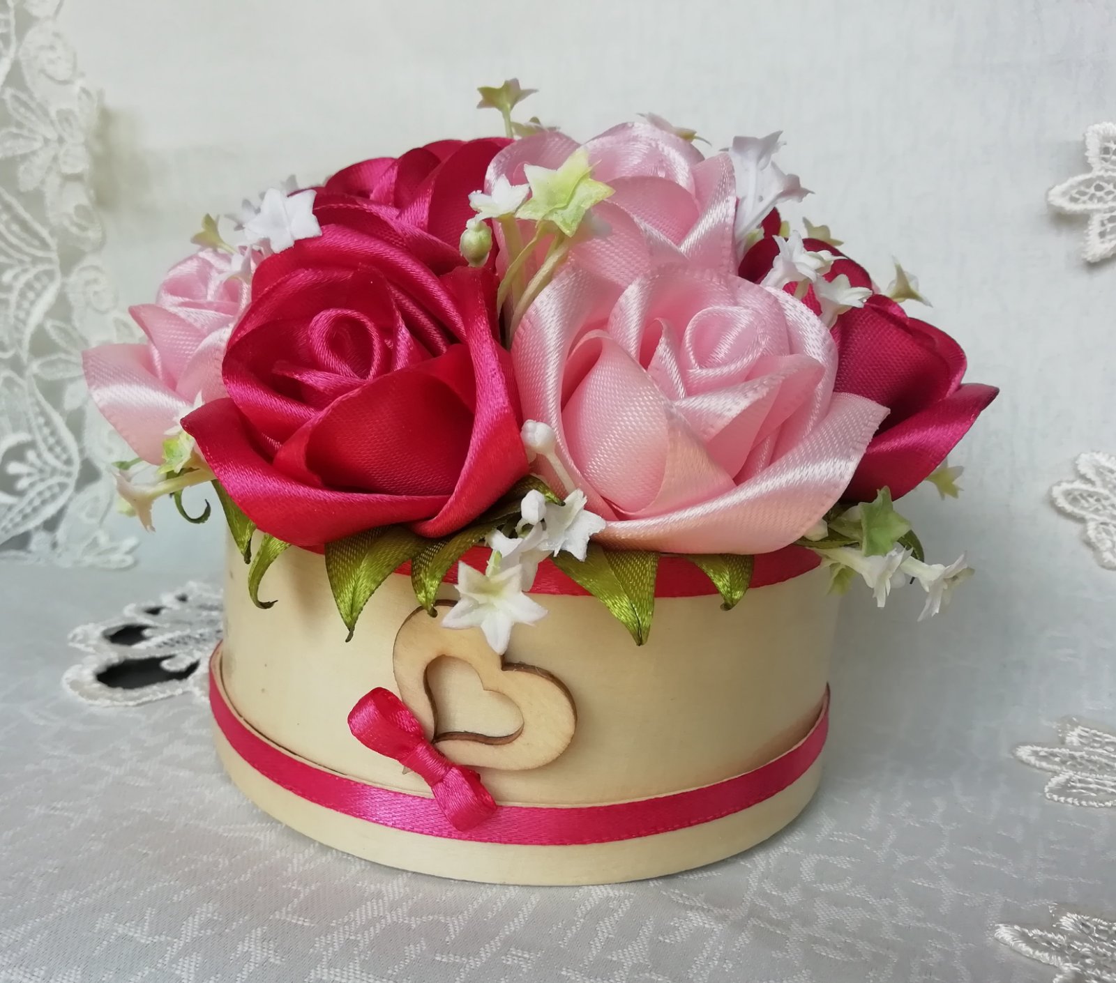 Zmes kvetov a púčikov zo saténovej stuhy naaranžovaných v drevenom lakovanom boxe dopĺňajú drobné biele tyčinky. Saténové jemné eustomy sú v druhom aranžmáne nahradené krásnymi ružami. Farba môže byť podľa želania.