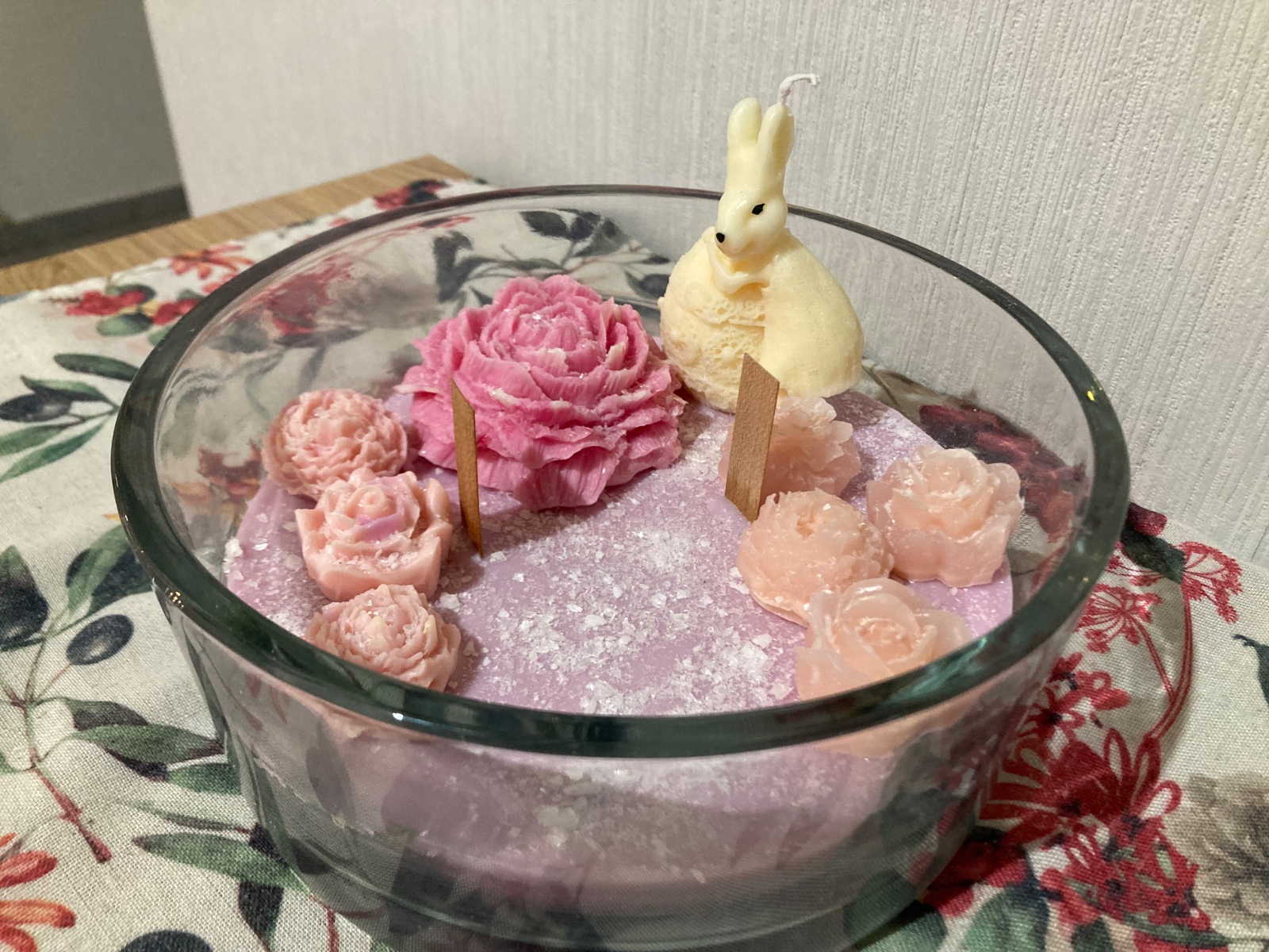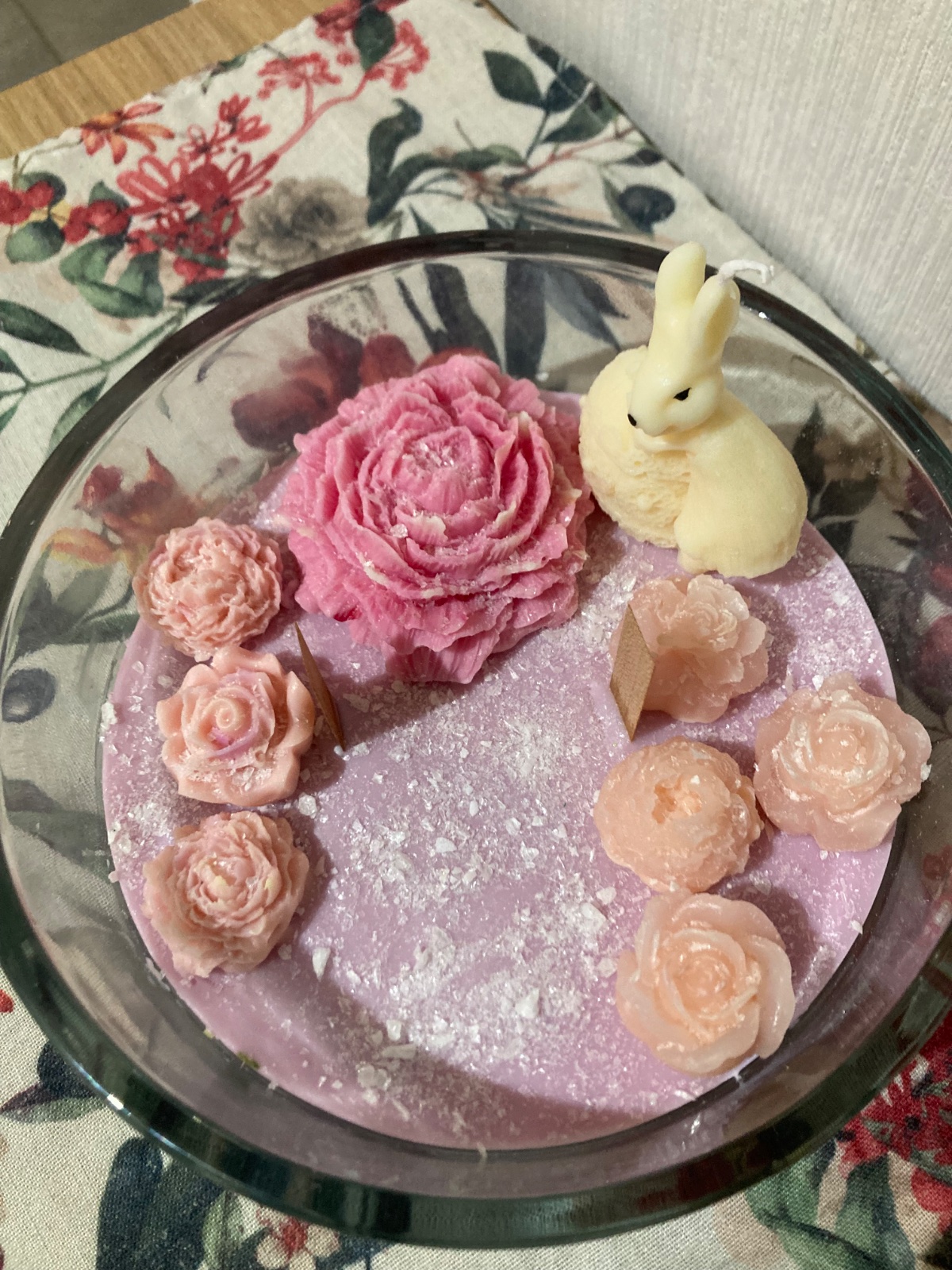 Ročne odlievané sójové sviečky v hrubom skle 20 cm x 20 cm. S vônou fialka. Použitý drevený knôt na zapálenie a figúrky zajačika a kvietkov. 2100 g