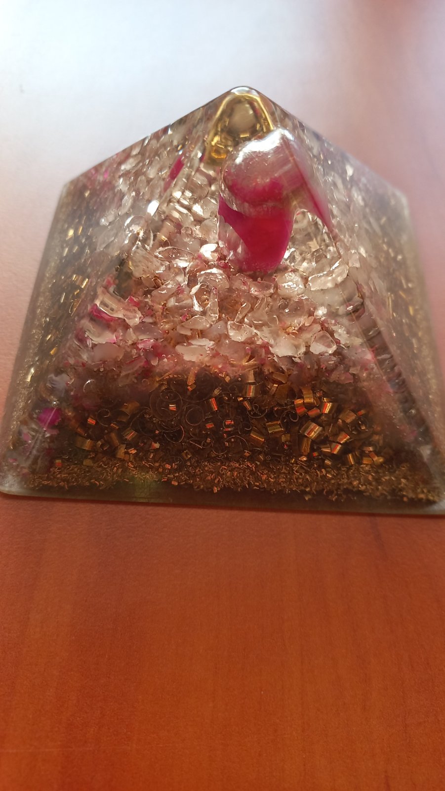 Dekoratívny orgonit s krištáľom vo vnútri. Pohlcuje negatívnu energiu a čistí priestor. Výška 8 cm, hrany 9 cm. Váha 350 g. Má ochranný, zdravotný aj čistiaci charakter