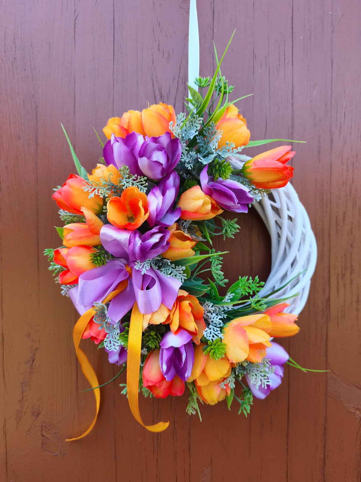 Biely prútený základ zdobený umelými krokusmi, priemer 24 cm.