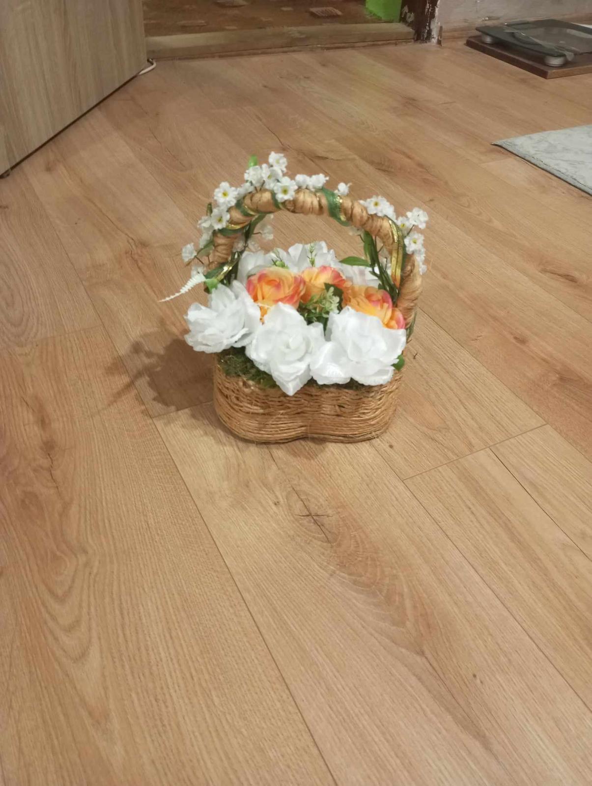 košik v tvare srdca ozdobeny špagatom machom a kvetinami