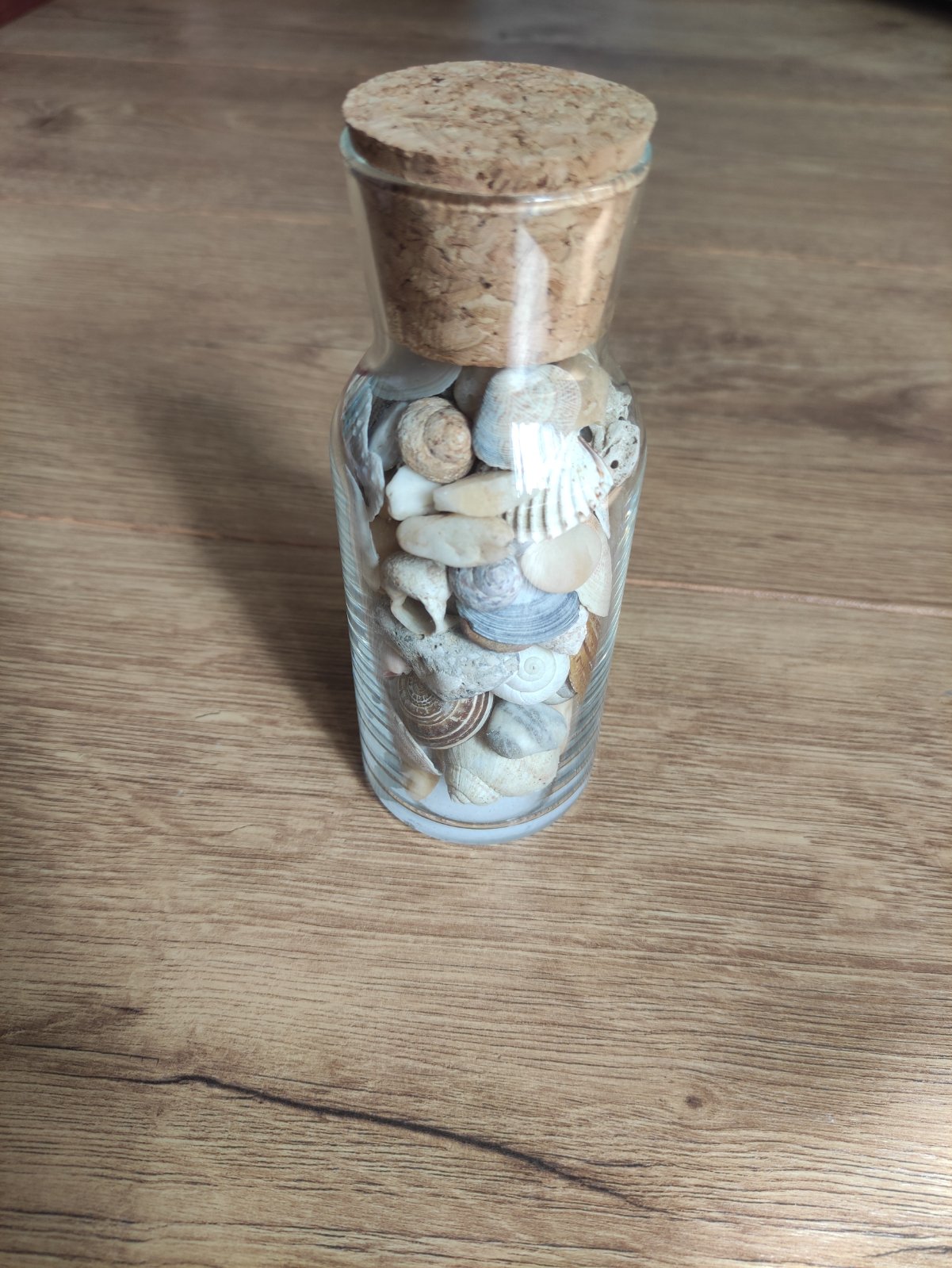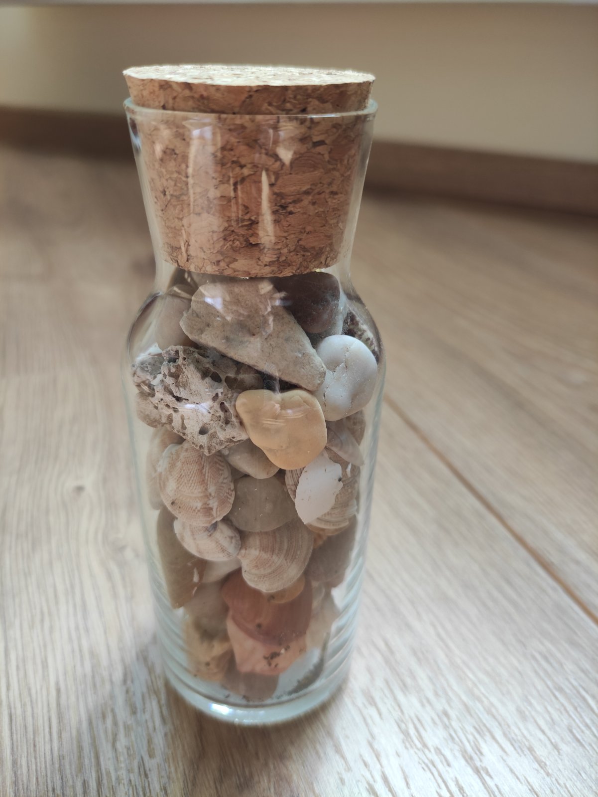 Flasa je sklenena s korkovou zatkou.