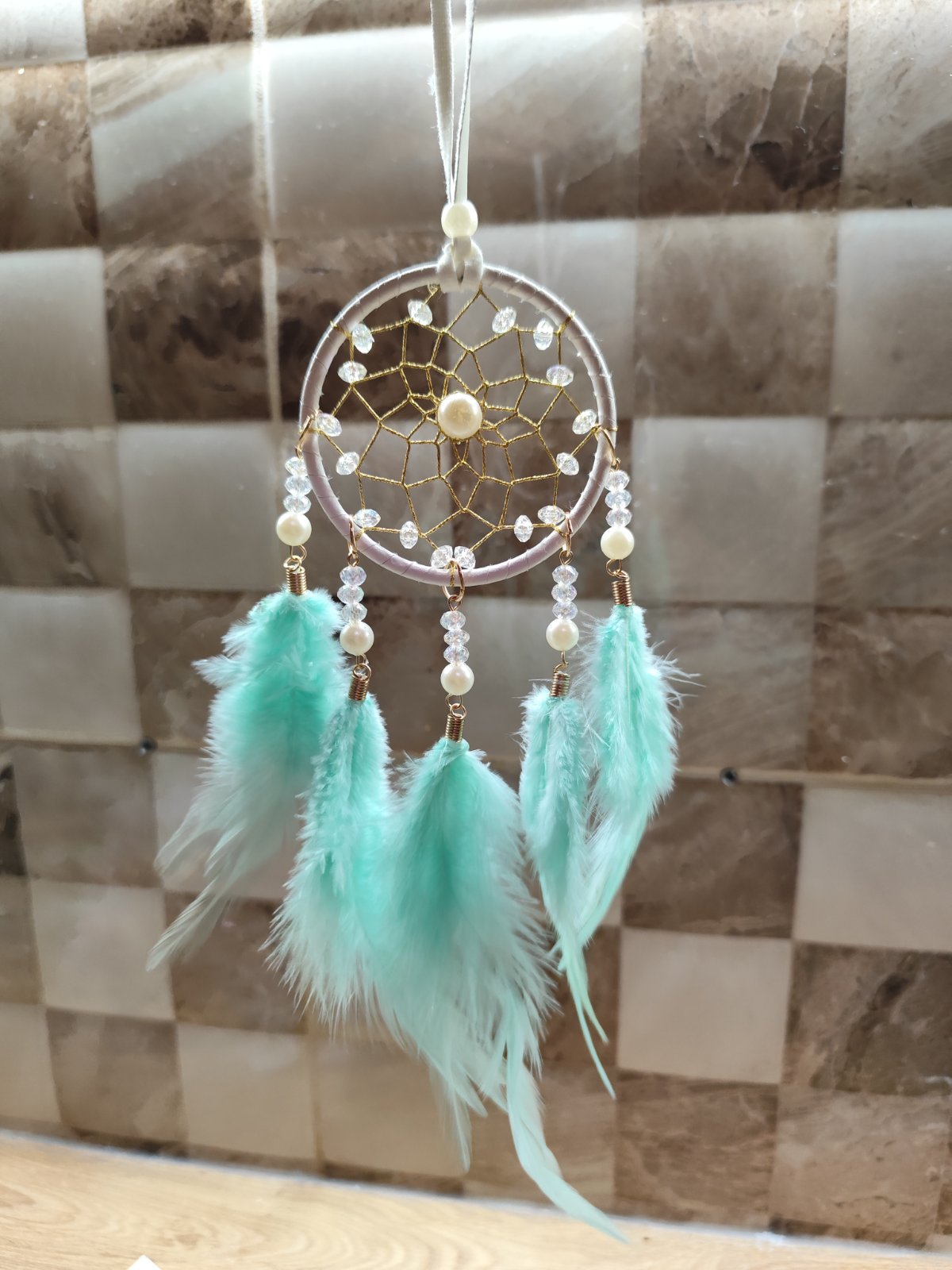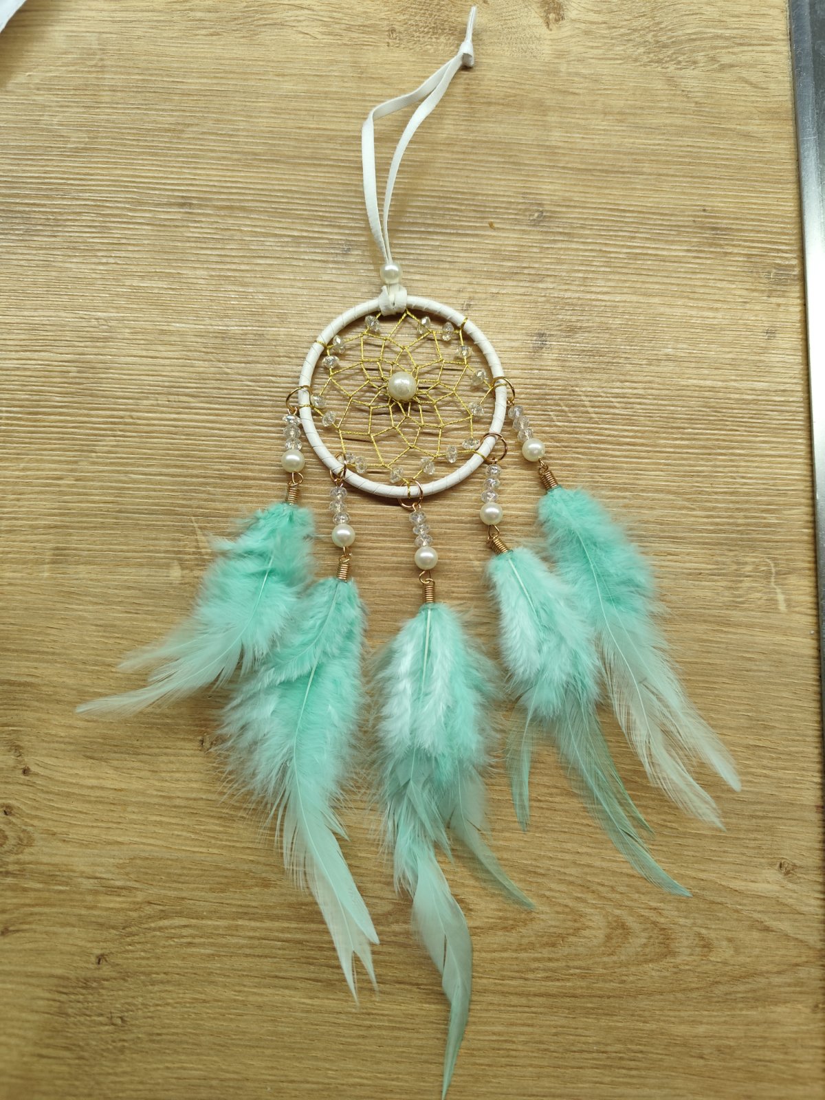 Predám jemný, ručne zdobený lapač snov v krásnej kombinácii bielej a mentolovej (mint) farby.