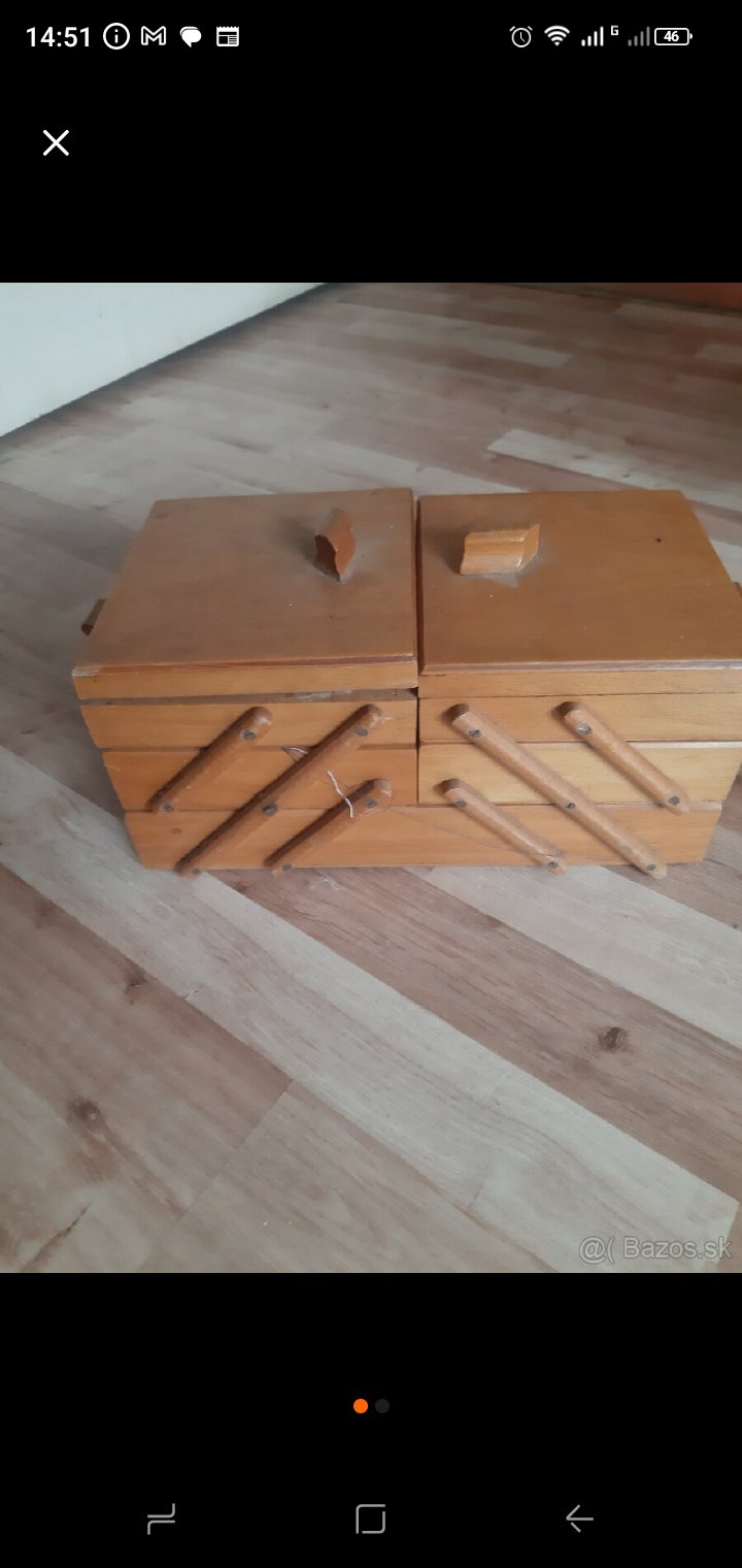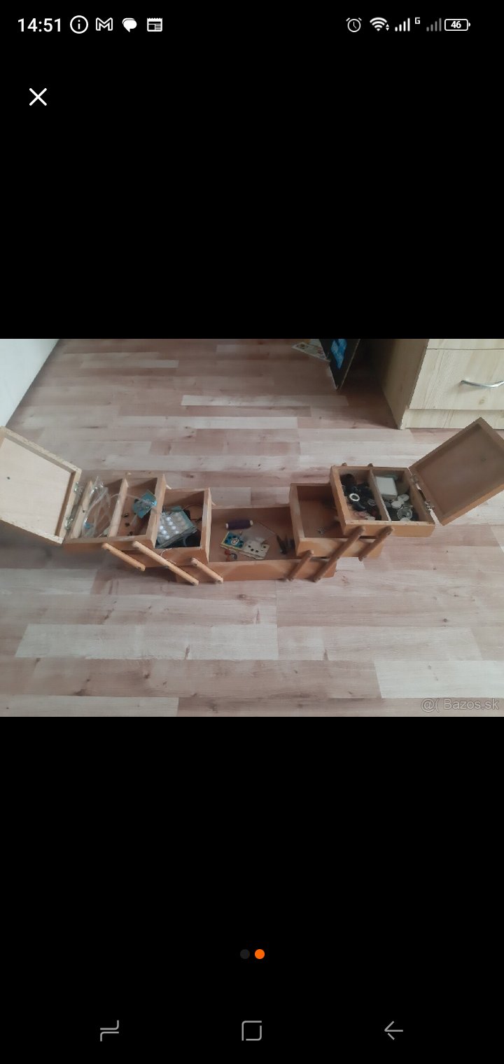 Drevená rozkladacia kazeta na šijace potreby. Predáva bez obsahu ( bez nitiek a iných doplnkov na foto) čisto len box.