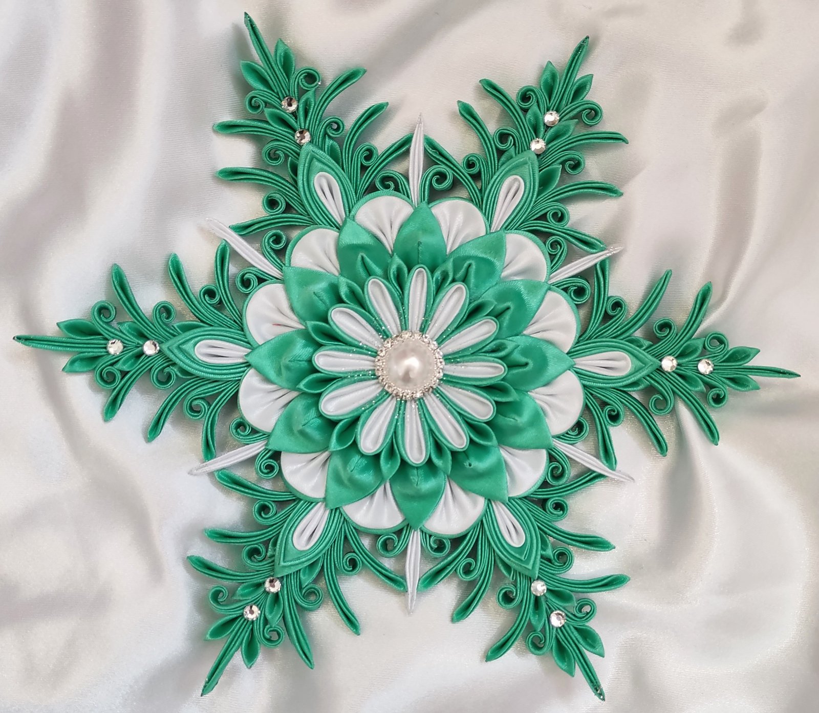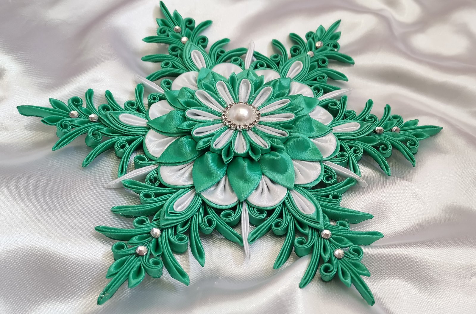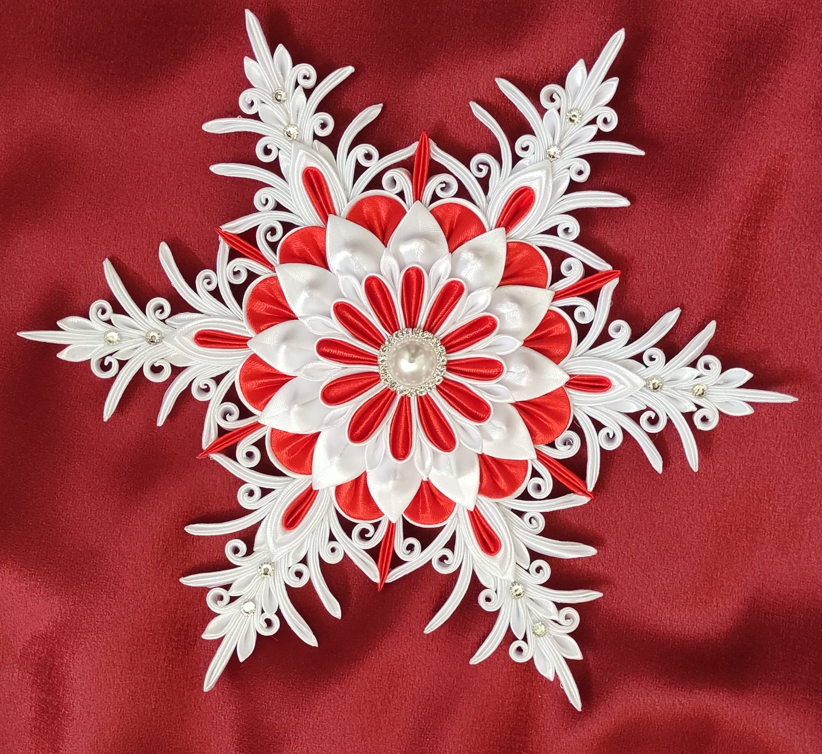 Stred hviezdy zdobí perlička obkolesená striebornými kamienkami, ktoré sa krásne ligocú v svetle vianočných svetielok.