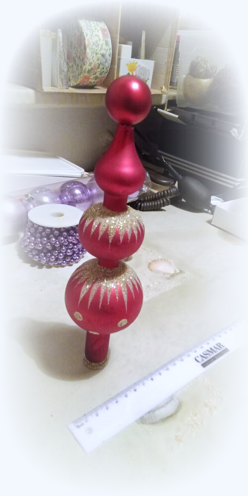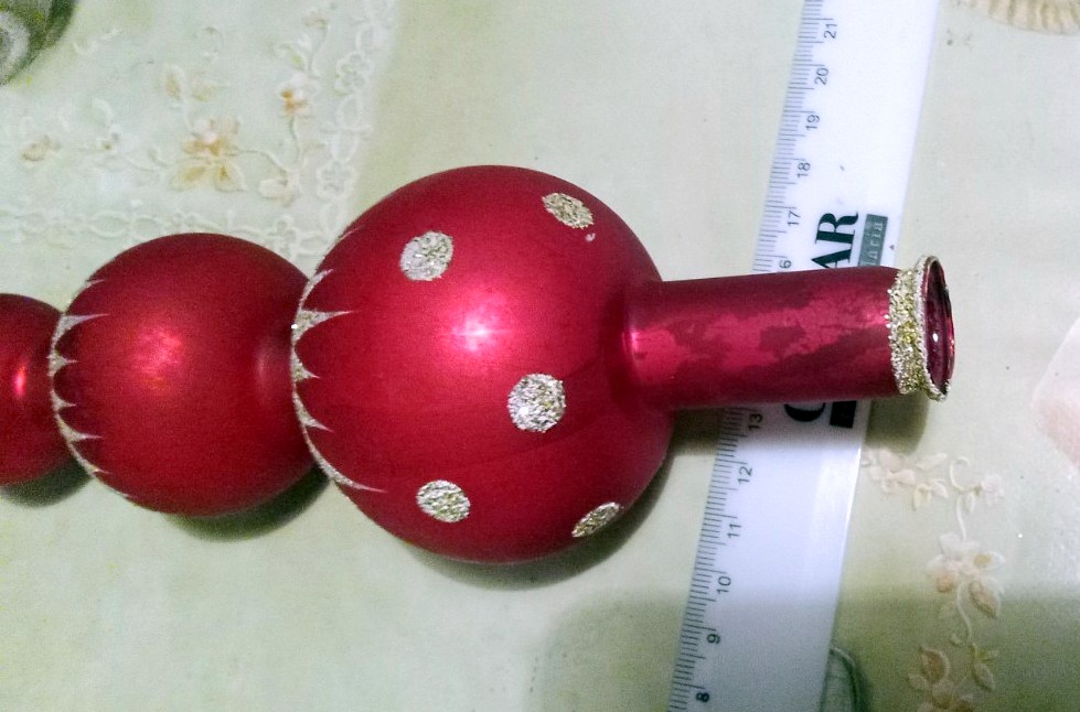 sklenený špic na stromček zo 60-tych rokov min.storočia. Pri niektorom odkladaní to jeho vršok neprežil, tak bol originálne opravený prilepenou sklenenou guličkou tej istej farby.
